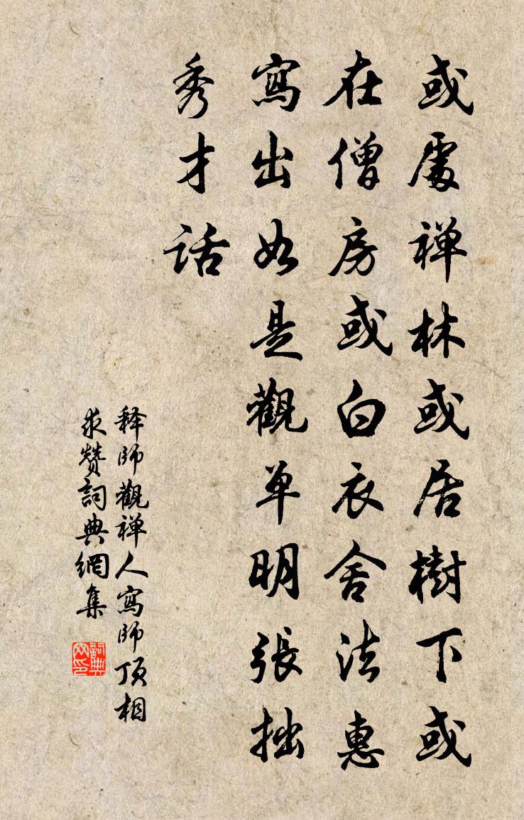 詩詞名句歷史字典書法欣賞書法字典國語詞典說文解字康熙字典古漢語字典標 題 作 者 詩 句 禪人寫師頂相求贊作者:釋師觀 朝代:宋代禪人寫師頂相求贊原文或處禪林,或居樹下。或在僧房,或白衣舍。法惠寫出如是觀,單明張拙秀才話。詩詞問答問:禪人寫師頂相求贊的作者是誰?答:釋師觀問:禪人寫師頂相求贊寫於哪個朝代?答:宋代釋師觀禪人寫師頂相求贊書法欣賞禪人寫師頂相求贊書法作品詩詞推薦水調歌頭姬翼〔元代〕端坐懶成癖,雲水興何加。襟懷洗盡塵物,別有好生涯。選甚瀛洲仙闕,鬧市花街柳陌,觸處是光華。切莫問龍虎道間晚稻甚盛喜而賦此張栻〔宋代〕我行自喜有勝事,夾道黃雲禾黍秋。聞道今年罷和糴,老農卒歲儻寬憂。雜詩四首孔武仲〔宋代〕平日扁舟千里行,朅來無地濯塵纓。朝衣趁曉東華路,喜有官橋流水聲。無題汪晫〔宋代〕農夫只合老山林,辜負時卿一寸心。老矣不堪持手板,死時何用覆斜衾。有人稱善名非細,對客無慚樂最深。回首行香子佚名〔宋代〕浙右華亭。物價廉平。一道會、賣個三升。打開瓶後,滑辣光馨。教君霎時飲,霎時醉,霎時醒。聽得淵明。說與句張良臣〔宋代〕指似鳳城煙月路。荊溪道中厲鶚〔清代〕如畫雲嵐西復西,梁溪幾折入荊溪?舟師失道隔煙問,山鳥畏人穿竹啼。焦桐樹陳標〔唐代〕江上烹魚采野樵,鸞枝摧折半曾燒。未經良匠材雖散,待得知音尾已焦。若使琢磨徽白玉,便來風律軫青瑤。還能題長慶四年曆日尾元稹〔唐代〕殘歷半張餘十四,灰心雪鬢兩悽然。定知新歲御樓後,從此不名長慶年。真珠簾(壽孫古岩)陳著〔宋代〕綸巾古貌塵寰表。風流處、別是英雄才調。胸次著乾坤,觸景皆詩料。金碧樓台新築就,傍翠麓、旋添花草。仙棹對菊賈島〔唐代〕九日不出門,十日見 * 。灼灼尚繁英,美人無訊息。百一詩 十九應璩〔魏晉〕茍欲娛耳目。快心樂腹腸。我躬不悅歡。安能慮死亡。與鄒浩志完會於王希聖家因話毗陵事是夕輒夢李廌〔宋代〕客夢還松陵,寒江渺煙雨。異時醉吟地,依然記洲渚。三高平生歡,彷佛遞賓主。十年扁舟興,一夕暫容與。此樂已亥雜詩 173龔自珍〔清代〕碧澗重來薦一毛,杉柟喜比往時高。故人地下仍相護,驅逐狐狸賴爾曹。次韻徐子英江樓二首方回〔宋代〕虛器浮名蜃結樓,潮痕才落水添舟。醫工藥不關生死,詹尹蓍寧究咎休。華蓋天臨批鳳誥,長楊日侍射熊侯。是人答秦十四校書(秦系)韋應物〔唐代〕知掩山扉三十秋,魚須翠碧棄床頭。莫道謝公方在郡,五言今日為君休。密縣汪遵〔唐代〕百里能將濟猛寬,飛蝗不到邑人安。至今閭里逢災沴,猶祝當時卓長官。臨江仙張泌〔唐代〕煙收湘渚秋江靜,蕉花露泣愁紅。五雲雙鶴去無蹤。幾回魂斷,凝望向長空。翠竹暗留珠淚怨,閒調寶瑟波中。花土馬村劉克莊〔宋代〕村墟薪濕米如金,猶記來時臘雪深。曾有小詩題歲月,店荒無壁可追尋。趙明叔太博未識醉眠亭先貺佳篇李行中〔宋代〕要認荒亭路不賒,浦西橋北對漁家。窗嫌日曝新栽竹,蔬占畦長未種花。壁上客來堆醉墨,籬根潮過積寒沙。被人名句推薦金風細細。葉葉梧桐墜。晏殊《清平樂·金風細細》 城小賊不屠,人貧傷可憐元結《賊退示官吏》 賈傳自憐多感慨,東門何意泥孤虛。王惲《送姬仲實隱士北還》 遊絲冉冉花枝靜,青壁迢迢白鳥過。王守仁《春晴》 偶應非熊兆,尊為帝者師。劉基《題太公釣渭圖》 五更櫪馬靜無聲。鄰雞猶怕驚。吳文英《醉桃源·元日》 寸寸微雲,絲絲殘照,有無明滅難消。賀雙卿《鳳凰台上憶 * ·寸寸微雲》 謹身節用,以養父母孔子及其弟子《孝經·庶人》 擁紅妝,翻翠蓋,花影暗南浦。高觀國《祝英台近·荷花》 素臣稱有道,守在於四夷。田錫《塞上曲》