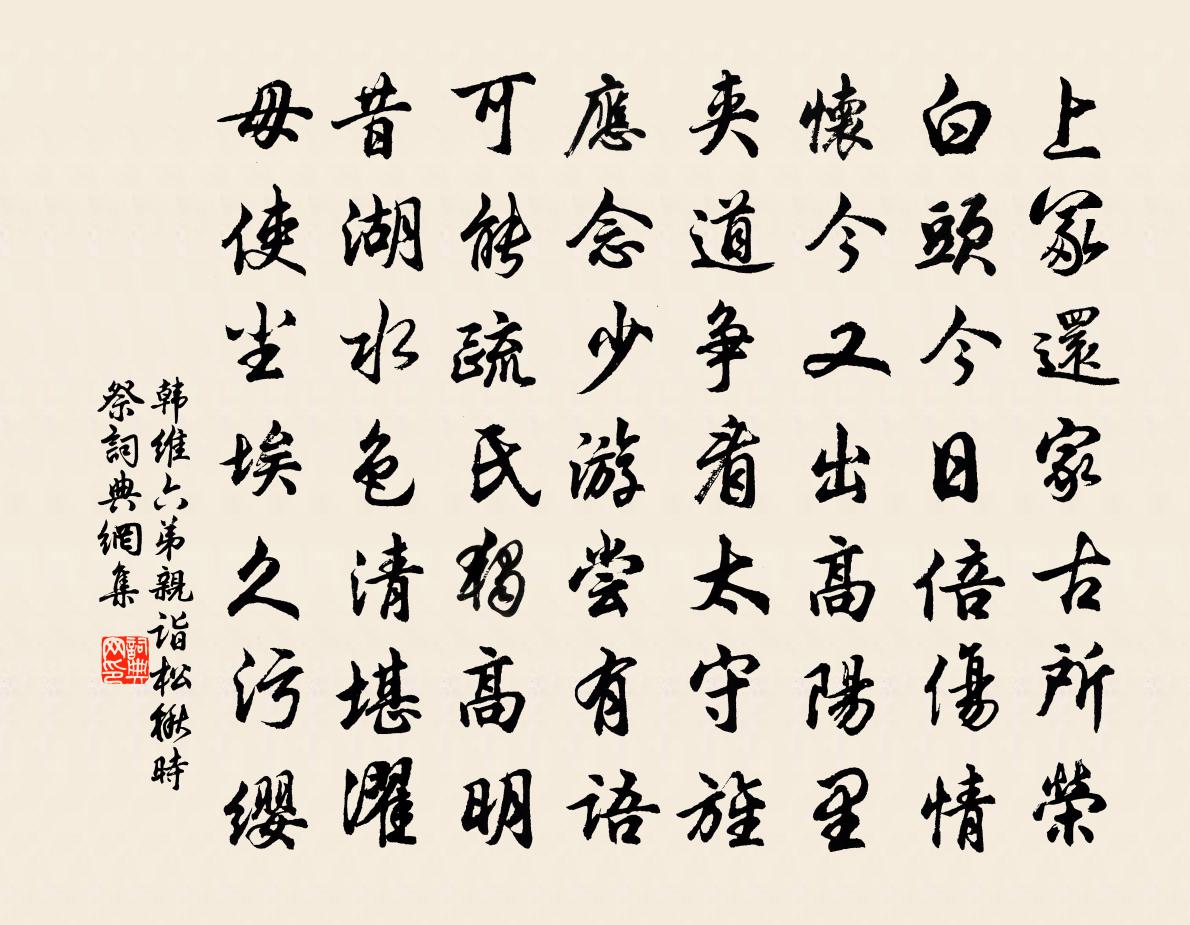 詩詞名句歷史字典書法欣賞書法字典國語詞典說文解字康熙字典古漢語字典標 題 作 者 詩 句 六弟親詣松楸時祭作者:韓維 朝代:宋代六弟親詣松楸時祭原文上冢還家古所榮,白頭今日倍傷情。懷今又出高陽里,夾道爭看太守旌。應念少游嘗有語,可能疏氏獨高明。昔湖水色清堪濯,毋使塵埃久污纓。詩詞問答問:六弟親詣松楸時祭的作者是誰?答:韓維問:六弟親詣松楸時祭寫於哪個朝代?答:宋代韓維六弟親詣松楸時祭書法欣賞六弟親詣松楸時祭書法作品詩詞推薦哭劉四尚書(勒於碑陰)權德輿〔唐代〕士友惜賢人,天朝喪守臣。才華推獨步,聲氣幸相親。理析寰中妙,儒為席上珍。笑言成月旦,風韻挹天真。丹地雜詩絕句十七首梅堯臣〔宋代〕鵲銜高樹蟬,危脅繅車響。露腹不曾肥,殺之嗟已往。即事李流謙〔宋代〕懶步東阡與北溪,一春心賞苦多違。墮紅藉藉痴蜂醉,稚綠陰陰乳燕飛。去國三年應自笑,封侯萬里不如歸。門前和秦壽之春晚偶成八絕王之道〔宋代〕照眼酴醿正及時,鞓紅相映似相知。天公應也憐芳意,一靈輕風宿霧披。閉戶鄭俠〔宋代〕居然訟息愧王通,反閉柴門亦古風。幽鳥一聲庭日永,軒窗從此近慮仝。偈頌四十二首釋祖先〔宋代〕首夏初臨,薰風乍扇。急景如梭,萬化千變。惟有拄杖子,黑輪皴,沒思算。解道廚庫揖僧堂,三門朝佛殿。仆盡半月之力僅得五詩而和仲落筆成十章俊哉李流謙〔宋代〕慷慨揮放際,倉黃展卷初。少寬誅寇檄,已草納降書。恃勝妨君失,輸籌笑我疎。班龍落誰手,芝草費人鋤。讀范吏部三高祠堂記樓鑰〔宋代〕三高之風天與高,三高之靈或可招。小山以後無此作,具區笠澤空寥寥。幾從垂虹盪雙槳,寓目滄浪獨怊悵。筆端和夏日園中即事李復〔宋代〕雨過深園暑氣清,拂雲松竹映重閽。預期節物移承露,自驗方書采合昏。片影有緣聊暫寄,寸心無事得閒論。風光豐年謠五首王炎〔宋代〕縱橫南陌接東阡,婦餉夫耕望有年。前此丁黃飢欲死,今年米賤不論錢。戲子由蘇軾〔宋代〕宛丘先生長如丘,宛丘學舍小如舟。常時低頭誦經史,忽然欠伸屋打頭。斜風吹帷雨注面,先生不愧旁人羞。任從句劉鏜〔宋代〕村橋日落市聲散,山路月明人語歸。鄭鋒宅神詩佚名〔唐代〕浦口潮來初淼漫,蓮舟搖颺採花難。春心不愜空歸去,會待潮回更折看。忽然湖上片雲飛,不覺舟中雨濕衣。折得海仙歌司馬光〔宋代〕東望海波蒼茫浩渺無所極,高流洪濤黯風色。翻星倒漢天地黑,陰靈出沒互相索。東方瞳曨景氣清,慶雲合沓吐赤禪翁釋文珦〔宋代〕禪翁八十鬢如霜,冷坐雲邊舊竹房。唯放此身長懶散,更無餘事可思量。飛流激石泉珠迸,斜照入林松影長。即景文明殿受冊封閩王翁承贊〔唐代〕龍墀班聽漏聲長,竹帛昭勛撲御香。鳴佩洞庭辭帝主,登車故里冊閩王。一千年改江山瑞,十萬軍蒙雨露光。吟寄醉落魄(元夕)陳三聘〔宋代〕東風寒絕。江城待得花枝發。欲知此夜碧天闊。頌證道歌證道歌釋印肅〔宋代〕取捨之心成巧偽,只應步步踏陰坑。大光普照盲無識,非時不共野狐爭。過舅氏宅釋道璨〔宋代〕牆頭楊柳老無枝,門外新泥淤舊泥。因看兒童騎竹馬,憶曾隨母北歸時。賀生次子又喜鄰薦李劉〔宋代〕君家蘭玉滿庭除,尤喜徐卿第二雛。方遂鵬程收鶚薦,又符熊夢{左犭右劐去刂}驪珠。史山孕秀頭顱別,秋水為名句推薦枕障薰爐隔繡帷,二年終日苦相思,杏花明月始應知。張曙《浣溪沙·枕障薰爐隔繡帷》 今宵絕勝無人共,臥看星河盡意明。陳與義《雨晴·天缺西南江面清》 無情有恨何人覺?月曉風清欲墮時。陸龜蒙《白蓮》 東風不與周郎便,銅雀春深鎖二喬。杜牧《赤壁》 得寸則王之寸,得尺亦王之尺也。劉向《戰國策·秦三·范睢至秦》 想邊鴻孤唳,砌蛩私語。王沂孫《掃花游·秋聲》 飾美於外者,必其中無所有。王永彬《圍爐夜話·第一八八則》 故人書報,莫因循、忘卻蓴鱸。辛棄疾《漢宮春·會稽秋風亭觀雨》 但夢想、一枝瀟灑,黃昏斜照水周邦彥《花犯·小石梅花》 垂緌飲清露,流響出疏桐。虞世南《蟬》