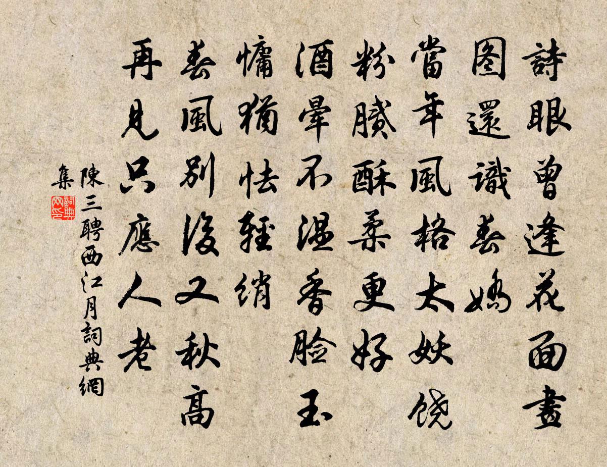 詩詞名句歷史字典書法欣賞書法字典國語詞典說文解字康熙字典古漢語字典標 題 作 者 詩 句 西江月作者:陳三聘 朝代:宋代西江月原文詩眼曾逢花面,畫圖還識春嬌。當年風格太妖饒。粉膩酥柔更好。酒暈不溫香臉,玉慵猶怯輕綃。春風別後又秋高。再見只應人老。詩詞問答問:西江月的作者是誰?答:陳三聘問:西江月寫於哪個朝代?答:宋代問:西江月是什麼體裁?答:詞陳三聘西江月書法欣賞西江月書法作品詩詞推薦孫氏女哀詞三章羅椅〔宋代〕秋風蕭颯兮白露零,汝墳何在兮何草為青。昨秋此日兮猶冀汝生,灑墨我別兮人間父子之情。我枯如臘兮涕更縱橫壬戌立冬十朋十一日陪路文周朋攜提祖同訪後王洋〔宋代〕倦緣閒景散閒情,人未歸庵戶不扃。試撥柴煙尋宿火,旋添泉水洗茶瓶。黃花采采盈衣袖,橡實離離傍生萍。何日早秋晚望,兼呈韋侍郎白居易〔唐代〕九派繞孤城,城高生遠思。人煙半在船,野水多於地。穿霞日腳直,驅雁風頭利。去國來幾時,江上秋三至。夫君李堅甫淨居雜題一十三首琴室文同〔宋代〕將何寫幽意,有此古桐聲。為問好彈處,誰來聽蟹行。浣溪沙袁去華〔宋代〕一夕高唐夢裡狂。雲情雨意兩茫茫。袖間依約去年香。乳燕鳴鳩閒院落,垂楊芳草小池塘。牆梢冉冉又斜陽。冬夜抄詩作艾性夫〔宋代〕筆債窮年老發僧,硯寒還復夜敲冰。西堂夢後無靈運,夔府歸來有少陵。諸老文章凡幾變,千年風雅欠中興。矮窗臧郎中輓歌二首司馬光〔宋代〕素履存誠厚,虛懷待物真。鄉閭昔相接,朋友世彌親。遺札蠅頭強,長阡馬鬣新。九原那可作,空復想音塵。答陳莆田投贈二首劉克莊〔宋代〕夙昔潘郎說孟公,講聞久矣匪匆匆。君豪不忝十才子,吾老真成一禿翁。謝事安能謄妙墨,輟耕猶可和高風。畫簾懷素台歌(一作題懷素台)裴說〔唐代〕我呼古人名,鬼神側耳聽。杜甫李白與懷素,文星酒星草書星。永州東郭有奇怪,筆冢墨池遺蹟在。筆冢低低高如和司馬學士上辛祀事出郊寄馮學士梅堯臣〔宋代〕侵曉度南薰,禁鍾猶可聞。春郊微有霰,上苑稍藏雲。齋館人相望,官橋路已分。寧同鳥烏樂,翔集自成群。夜坐陸游〔宋代〕夜永霜濃睡不成,團樂兒女話無生。金蓮妄想消除盡,一碗松肪徹曉明。枯梅史文卿〔宋代〕樛枝半著古苔痕,萬斛寒香一點春。總為古今吟不盡,十分清瘦似詩人。謝賓客輓歌三首梅堯臣〔宋代〕位不登三事,才宜列四科。清名時自得,華冕世空多。望氣悲埋劍,臨風嘆逝波。吳阡蒿作里,楚挽薤成歌。會葬中秋望月呈諸友胡仲弓〔宋代〕長空萬里琉璃滑,冰輪碾上黃金闕,清光爍盡滿天星,桂枝搖落蟾蜍活。故雷鋒此盡翹首,望殺 * 眼瀝血。烏鵲招同官諸宣教一飯用舟字韻成拙句王炎〔宋代〕士要飛騰及黑頭,肯來揮麈試同謀。已攜荷葉招歡伯,莫笑花枝欠杜秋。老我餘年思釣渭,諸君他日合封留。胸中秋日俞桂〔宋代〕芙蓉未拆桂香浮,落日西風雁過樓。一雨空階深夜滴,十分秋是十分愁。青陽驛周弼〔宋代〕悄悄如秋麥氣涼,山風吹透濕衣裳。小爐深幌枯松火,一夜寒香繞客床。過秀城哭葉俯倅衛宗武〔宋代〕一見負吾願,人亡乃及門。溫乎容可即,儼若像如存。滿擬朋三壽,那知隔九原。瓣香傾老淚,佇立黯消魂。古檜廖融〔唐代〕何人見植初,老樹梵王居。山鬼暗棲托,樵夫難破除。聲高秋漢迥,影倒月潭虛。盡日無僧倚,清風長有餘。和劉後村梅花百詠方蒙仲〔宋代〕參橫月落夢何從,且領清香入盞中。一歲見梅須一醉,梅前有幾百年翁。名句推薦乃翁知國如知兵,塞垣草木識威名。黃庭堅《送范德孺知慶州》 西城楊柳弄春柔。動離憂。淚難收。秦觀《江城子·西城楊柳弄春柔》 年年歲歲望中秋,歲歲年年霧雨愁。曾幾《癸未八月十四日至十六夜月色皆佳》 功名祗向馬上取,真是英雄一丈夫岑參《送李副使赴磧西官軍》 衰蘭送客鹹陽道,天若有情天亦老。李賀《金銅仙人辭漢歌》 紫泉宮殿鎖煙霞,欲取蕪城作帝家。李商隱《隋宮》 足不強則跡不遠,鋒不銛,則割不深。王充《論衡·卷十三·超奇篇》 橫戈從百戰,直為銜恩甚。李白《塞下曲六首》 幼敏悟過人,讀書輒成誦。歐陽修《畫地學書》 不恥不若人,何若人有?孟子《孟子·盡心章句上·第七節》