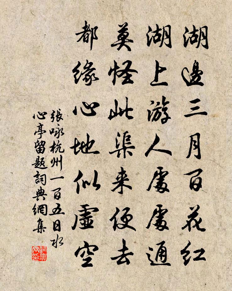 詩詞名句歷史字典書法欣賞書法字典國語詞典說文解字康熙字典古漢語字典標 題 作 者 詩 句 杭州一百五日水心亭留題作者:張詠 朝代:宋代杭州一百五日水心亭留題原文湖邊三月百花紅,湖上遊人處處通。莫怪此渠來便去,都緣心地似虛空。詩詞問答問:杭州一百五日水心亭留題的作者是誰?答:張詠問:杭州一百五日水心亭留題寫於哪個朝代?答:宋代張詠杭州一百五日水心亭留題書法欣賞杭州一百五日水心亭留題書法作品詩詞推薦寒食離白沙張耒〔宋代〕莫驚客路已經年,尚有青春一半妍。試上芳堤望春野,萬絲楊柳拂晴天。次韻奉酬刑部王嘉叟侍郎書戲彩集後喻良能〔宋代〕製作參易經,不用草玄準。眼空天壤間,誰得並捷敏。鴻文翻水就,未省苦吟吻。齊梁逮陳隋,眾作付一哂。南國別三子陳師道〔宋代〕夫婦死同穴,父子貧賤離。天下寧有此?昔聞今見之!母前三子後,熟視不得追。嗟乎胡不仁,使我至於斯!有女蕭山縣下遇雨二首周弼〔宋代〕悠悠心厭出江沙,過得丘亭轉落斜。村店自知行客倦,勸嘗新酒賣甜瓜。北人食菱江盈科〔明代〕北人生而不識菱者,仕於南方,席上啖菱,並殼入口。或曰:“食菱須去殼。”其人自護所短,曰:“我非不知,浣溪沙(王仲時席上賦木犀)張元乾〔宋代〕翡翠釵頭綴玉蟲。秋蟾飄下廣寒宮。數枝金粟露華濃。花底清歌生皓齒,燭邊疏影映 * 。惱人風味冷香中。謁金門王平子〔宋代〕書一紙。小砑吳箋香細。讀到別來心下事。蹙殘眉上翠。怕落傍人眼底。握向抹胸兒里。針線不忺收拾起。和衣和戀繡衾蔣捷〔宋代〕茜金小袖花下行。過橋亭、倚樹聽鶯。被柳線、低縈鬢,紺雲垂、釵鳳半橫。紅薇影轉晴窗晝,漾蘭心、未到繡絣賢者之孝二百四十首范滂林同〔宋代〕寧將身塞禍,不忍母流離。我自不為惡,黃泉今有辭。蘇幕遮 勸同流王哲〔元代〕教門人聽我告。清弟稠津,吃了成虛耗。五穀滓余難化造。恰是隈*,惹甚閒煩惱。會修行,知顛倒。別有一般,歲除次韻全君玉有懷二首方回〔宋代〕全老忽貽寒夜句,歲闌吾黨久離群。一場噩夢三千字,百載頹齡七八分。孰與挽前軒此士,端能殿後棟斯文。鄉儺秋試院將出書所寓窗陳與義〔宋代〕門前柿葉已堪書,弄鏡燒香聊自娛。百世窗明窗暗裡,題詩不用著工夫。午枕陸游〔宋代〕茅檐一杯淡藜粥,有底工夫希鼎餗?書中至味人不知,雋永無窮勝粱肉。老夫享此七十年,每媿天公賦予偏。清泉君子行齊己〔唐代〕聖人不生,麟龍何瑞。梧桐不高,鳳凰何止。吾聞古之有君子,行藏以時,進退求己。榮必為天下榮,恥必為天下次韻漕使張守二首陳造〔宋代〕政績新皇眷,功名舊壯懷。人才雙立玉,筆勢各排淮。鵬路天惟咫,鯫生骨未埋。行看仲淹弼,接武冠堯階。無題二首張玉孃〔宋代〕闞來彈鵲漫停梭,竹鳥花潭思轉多。秋老莫言春度盡,若邪獨自惜涼荷。自詒陸游〔宋代〕行年耄及臥蝸廬,山水登臨亦已疏。無可奈何猶食粟,未能免俗學澆蔬。蓬門時接漁樵話,麈幾聊存種樹書。強欲鄭惠叔閣學守建寧三首袁說友〔宋代〕公乎斯文宗,學者仰泰北。而我幸姻婭,心切跡每梏。龍門甫登進,已動驪駒曲。江湖搖歸心,我亦慕高躅。更愁題雪霽望弁山圖錢選〔宋代〕夜來天雨雪,萬木同一變。飢鴉覺余起,觀覽立須儼。遙山瓊成積,平田玉如碾。老夫醒眼看,樹樹何其燦。道中逢老儒由蜀出樂雷發〔宋代〕丙穴魚應好,曾經問釣磯。干戈今未定,城郭是耶非。詩社尊黃髮,侯門薄布衣。乾坤滿豺虎,見爾一噓欷。名句推薦姑蘇城外一茅屋,萬樹梅花月滿天。唐寅《把酒對月歌》 安得倚天劍,跨海斬長鯨。李白《臨江王節士歌》 今夜送歸燈火冷,河塘,墮淚羊公卻姓楊。蘇軾《南鄉子·和楊元素時移守密州》 林下春晴風漸和,高崖殘雪已無多。王守仁《春晴》 因依老宿發心初,半學修心半讀書。王建《寄舊山僧》 人攀明月不可得,月行卻與人相隨。李白《把酒問月·故人賈淳令予問之》 不以求備取人,不以己長格物,隨能收敘,無隔疏賤。吳兢《貞觀政要·卷二·論任賢》 天地生君子,君子理天地。荀子《荀子·王制》 浮雲不共此山齊,山靄蒼蒼望轉迷韓翃《宿石邑山中》 大樹無枝向北風,十年遺恨泣英雄。高啟《吊岳王墓》