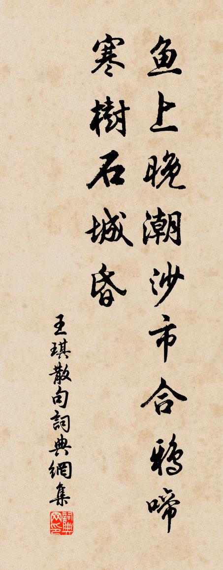 詩詞名句歷史字典書法欣賞書法字典國語詞典說文解字康熙字典古漢語字典標 題 作 者 詩 句 句作者:王琪 朝代:宋代句原文魚上晚潮沙市合,鴉啼寒樹石城昏。詩詞問答問:句的作者是誰?答:王琪問:句寫於哪個朝代?答:宋代王琪句書法欣賞句書法作品詩詞推薦秘省避暑抵暮乃出曾幾〔宋代〕蝸廬何以度袢延,竟日蓬山一洗湔。陰翳樹林無六月,風涼殿閣是諸天。政須深隱似玄豹,不用懷歸如杜鵑。咄咄禪人寫真求贊釋正覺〔宋代〕忒煞覺老,寒而且槁。古岩春遲,澄潭秋早。心無象也月影未回,物不爭也風吹便倒。和叔夏視獲三首胡寅〔宋代〕天賜豐年豈不時,閔公荒度效徂岐。經丘烈日能焦扉,獨夜秋風已泛帷。豈愧石兄推竹弟,聊斟杜酒破張梨。過門暮秋陸游〔宋代〕清秋又是一年新,滿眼丹楓映白苹。海內故人書斷絕,汀洲鷗鷺卻心親。殘秋感愴齊己〔唐代〕日日加衰病,心心趣寂寥。殘陽起閒望,萬木聳寒條。楚寺新為客,吳江舊看潮。此懷何以寄,風雨暮蕭蕭。和餘子美春日緩步黃公度〔宋代〕道屈時危且茹藜,不妨去魯盡遲遲。一軒容膝分藍宇,十里攜筇闖麥岐。杜老皓頭真可惜,陶潛知命更奚疑。干戈題楊冠卿客亭類稿姜夔〔宋代〕楊侯書筆力天下書奇,早歲書豪顏相追書隨。一班略見客亭槁,文采炳蔚驚群兒。長安城中擇幽棲,靜退不願時人秀江亭黃庭堅〔宋代〕因循不到此江頭,匹馬黃埃三十秋。舊舍只今人共老,清波常與月分流。羨君瀟灑成佳趣,感我淒涼念舊遊。沽酒並用存心微妙訣晃逈〔宋代〕處世間法,或伸或屈。用觀察智,無固無必。出世間法,勿違勿失。用決定信,惟精惟一。曲盡其妙,退藏於密。齋後與金老銛朴翁聰自酌龍進而發姜夔〔宋代〕年時六月海揚塵,遙見青山起白雲。聞有高僧一誦咒,岩前拋珓問龍君。水調歌頭吳淵〔宋代〕太白已仙去,詩骨此山藏。胸中錦繡如屋,都乞與東皇。碎翦杏花千樹,濃抹胭脂萬點,妖艷斷人腸。曉露沐春色紅梅釋璉〔宋代〕嬌朱淺淺透煙光,瘦倚疏檐半出牆。雅有風情勝桃李,巧含春思避冰霜。融明醉臉籠輕暈,斂掩仙姿蹙嫩黃。旦暮示師文王冕〔元代〕爾父既清苦,爾身何可言?且宜修道德,不必問田園。花落江城晚,煙橫野樹昏。此時光景異,只合住山村。送運判朱朝奉入蜀七首蘇軾〔宋代〕藹藹青城雲,娟娟峨眉月。隨我西北來,照我光不滅。我在塵土中,白雲呼我歸。我游江湖上,明月濕我衣。岷峨諸公皆和詩再用韻並屬湛挺之七首趙蕃〔宋代〕戢戢一天翮,紛紛凡馬群。回頭異生死,對面或公君。漸欲薰蕕等,反嫌黑白分。居然攖眾怒,政爾怯孤軍。次韻康慶之秋夜客懷自述方回〔宋代〕遁肥久已遠罝羅,獨慨流年老易過。宦學向來千齟齬,功言竟復兩蹉跎。是山可隱在人耳,今雨不來如彼何。群蟄戲呈峨眉僧正簡之頌黃庭堅〔宋代〕普賢菩薩不來,山谷老人不去。夜來月上勝峰,說盡薩提露布。驚起峨眉衲子,腳酸不到中路。杜鵑識甚鬧忙,剛奉和魯望四明山九題樊榭皮日休〔唐代〕主人成列仙,故榭獨依然。石洞哄人笑,松聲驚鹿眠。井香為大藥,鶴語是靈篇。欲買重棲隱,雲峰不售錢。適武林途中作陳藻〔宋代〕道途奔走固然非,閒坐真空度歲時。誰解胸中無窒礙,兩隨造化不相識。嘆魯二首白居易〔唐代〕季桓心豈忠,其富過周公。陽貨道豈正,其權執國命。由來富與權,不系才與賢。所託得其地,雖愚亦獲安。彘肥名句推薦豪華盡成春夢,留下古今愁。康與之《訴衷情令·長安懷古》 義人在上,天下必治。墨子《墨子·35章 非命(上)》 盪而失水,螻蟻得意焉。韓非及後人《韓非子·說林下》 西登香爐峰,南見瀑布水。李白《望廬山瀑布水二首》 居移氣,養移體。孟子《孟子·盡心章句上·第三十六節》 兒女此情同。往事朦朧。湘娥竹上淚痕濃。辛棄疾《浪淘沙·賦虞美人草》 莫向西湖歌此曲,水光山色不勝悲。趙孟頫《岳鄂王墓》 夫天地者,萬物之逆旅也;光陰者,百代之過客也。李白《春夜宴桃李園序 / 春夜宴從弟桃花園序》 憶君迢迢隔青天,昔日橫波目,今作流淚泉。李白《長相思·其二》 與君別,相思一夜梅花發房舜卿《有所思》