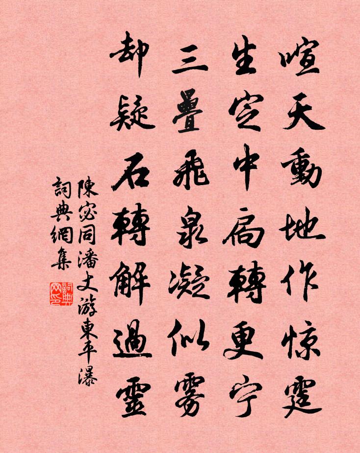 詩詞名句歷史字典書法欣賞書法字典國語詞典說文解字康熙字典古漢語字典標 題 作 者 詩 句 同潘丈游東平瀑作者:陳宓 朝代:宋代同潘丈游東平瀑原文喧天動地作驚霆,生定中扃轉更寧。三疊飛泉凝似霧,卻疑石轉解過靈。詩詞問答問:同潘丈游東平瀑的作者是誰?答:陳宓問:同潘丈游東平瀑寫於哪個朝代?答:宋代陳宓同潘丈游東平瀑書法欣賞同潘丈游東平瀑書法作品詩詞推薦溫成皇后輓詞二首蔡襄〔宋代〕翟彩開新禮,金文易大名。真游上仙路,故物感皇情。月落辭丹禁,春前引素旌。宮闈嗚挽鐸,不是佩環聲。禮疎山塔釋惟一〔宋代〕江橫一練平,山色四時青。水足柴猶富,人多爨不停。無弦猶自韻,有耳幾曾聽。槁矣齊檐柏,頻看涕忽零。題點易窗道人蘇門遺嘯陳杰〔宋代〕書來草木吾臭味,詩有膽氣非黃冠。清溪研露一雙鶴,蘇門嘯空千仞鸞。愁連青燐引觸醉,憤入白虹提劍看。誰識題孫端甫別墅葉紹翁〔宋代〕幽居地僻少人知,野水春風枳樹籬。檢歷預尋移竹日,題牆閒記種花時。堪嗤狡兔須三窟,只學鷦鷯占一枝。淨掃早朝大明宮呈兩省僚友賈至〔唐代〕銀燭熏天紫陌長,禁城春色曉蒼蒼。千條弱柳垂青瑣,百囀流鶯繞建章。劍佩聲隨玉墀步,衣冠身惹御爐香。共沐海棠曹彥約〔宋代〕一度相逢一度春,不知名姓是何人。十分國色妝須淡,數點胭脂畫未勻。好把東皇為上客,便堪宋玉作西鄰。臨邛唐侯仲友之守台為浮梁於江象令蔣鶚考叔賦江孫應時〔宋代〕江有梁,昔所無兮。台之民,難艱虞兮。我南之耕,其出於於。我北之趨,維薪維芻。匪伊薪芻,行旅載途。風雨夜坐晁說之〔宋代〕氛濁暑伏嘆,夜久神宇清。魚躍遠池響,螢飛深竹明。揚州妙歌舞,駐蹕盛公卿。植杖看牛斗,今年當太平。損窗釋普濟〔宋代〕六處虛明不假修,七穿八穴有來由。霜風霰雪縱橫入,不是愁人也著愁。偈頌五十一首釋大觀〔宋代〕空手把鉏頭,男命怕羅睺。步行騎水牛,石虎生肉彪。人從橋上過,橋流水不流。羲和鞭白日,少吳行清秋。洞霄宮王介〔宋代〕飄飄遼鶴去難尋,野客重來嘆復吟。許邁林中丹灶冷,郭文山上白雲深。南陵事蹟都非昔,北嶺歸期直到今。珍重挽伏德華主簿陽枋〔宋代〕黌堂深惜昔,六典共尋源。合遂齊飛鶚,嘉逾競化鵾。紅顏君早去,白髮我空存。方寸千年事,悽然誰與論。已亥雜詩 63龔自珍〔清代〕經有家法夙所重,詩無遠詁獨不用。我心即是四始心,泬寥再發姬公夢。風流子(贛上飲歸用美成韻)趙必〔宋代〕舊夢憶錢塘。笙歌里、幾度醉斜陽。曾載月一篷,眠楊柳岸, * 深巷,過杏花牆。腸惱斷,香鬟盤鳳髻,櫻口囀撲蝴蝶近/撲蝴蝶呂渭老〔宋代〕風荷露竹,秋意侵疏鬢。微燈曲幾。有簾通桂影。乍涼衣著,輕明微醉,歌聲聽穩。新愁殢人方寸。怎不悶。當初木蘭花慢(送客)李彭老〔宋代〕折秦淮露柳,帶明月、倚歸船。看佩玉紉蘭,囊詩貯錦,江滿吳天。吟邊。喚回夢蝶,想故山、薇長已多年。草得琴曲歌辭宛轉歌二首劉方平〔唐代〕星參差,明月二八燈五枝。黃鶴瑤琴將別去,芙蓉羽帳惜空垂。歌宛轉,宛轉恨無窮。願為潮與浪,俱起碧流中。對雪二首宋祁〔宋代〕縈叢著樹半瀟瀟,皓氣妍華混泬寥。為倚風流偏解舞,故藏朝晛未成消。玉繩四徹仙峰迥,銀界三千佛國遙。向曙次山房韻何夢桂〔宋代〕西狩事非文殆喪,舂陵書出道寧孤。六經有舌存先聖,千古留心付後儒。杲日麗天隨處見,逝川行地幾時無。齋居和陳希舜濁醪二首又次為謀深遠之作一首陽枋〔宋代〕幾年龍技學勤勞,淮擬豐餐嗜炙餚。庖刃如新驚歲晚,亦無蛙鱔薦松醪。名句推薦天地有萬古,此身不再得;人生只百年,此日最易過。洪應明《菜根譚·概論》 池上柳依依,柳邊人掩扉。左緯《春晚》 苜蓿闌乾滿上林,西風殘秣獨沉吟。王鵬運《浣溪沙·題丁兵備丈畫馬》 雙星何事今宵會,遺我庭前月一鉤。德容《七夕二首·其一》 日日雨不斷,愁殺望山人。賈島《望山》 別來春半,觸目柔腸斷。李煜《清平樂·別來春半》 嵩雲秦樹久離居,雙鯉迢迢一紙書。李商隱《寄令狐郎中》 林中有奇鳥,自言是鳳凰。阮籍《詠懷八十二首·其七十九》 願得一心人,白頭不相離。卓文君《白頭吟》 無參驗而必之者,愚也;弗能必而據之者,誣也。韓非及後人《韓非子·顯學》