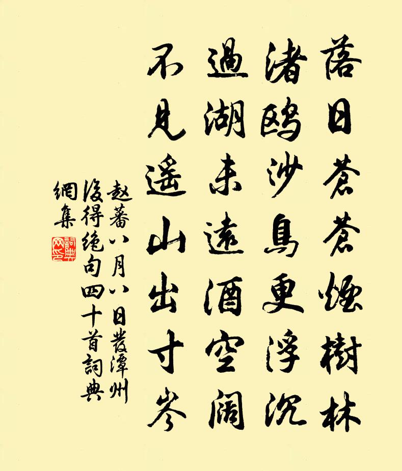 詩詞名句歷史字典書法欣賞書法字典國語詞典說文解字康熙字典古漢語字典標 題 作 者 詩 句 八月八日發潭州後得絕句四十首作者:趙蕃 朝代:宋代原文落日蒼蒼煙樹林,渚鷗沙鳥更浮沉。過湖未遠酒空闊,不見遙山出寸岑。詩詞問答問:《八月八日發潭州後得絕句四十首》的作者是誰?答:趙蕃問:該詩寫於哪個朝代?答:宋代書法欣賞八月八日發潭州後得絕句四十首書法作品詩詞推薦和廖守岳陽樓韻三首王炎〔宋代〕湖水無波亦蹴天,君山蟠結獨巋然。未須弔古懷騷客,聊復憑虛揖呂仙。霽月光風供笑傲,長篇短句總流傳。尊中寄唐州吳辨叔二兄司馬光〔宋代〕方城古稱險,遠在豫州南。近歲汙萊辟,新民秦晉參。當官誠近厚,獲譴說無慚。但惜牆陰竹,歸轅幾日驂。次韻楊廷秀郎中游西湖十絕喻良能〔宋代〕湖波萬頃瀉鎔銀,妙句誰能敵李紳。橈影緩隨紅蓼岸,荷香細著白綸巾。黿頭山神女歌韋應物〔唐代〕黿頭之山,直上洞庭連青天。蒼蒼煙樹閉古廟,中有蛾眉成水仙。水府沉沉行路絕,蛟龍出沒無時節。魂同魍魎潛題上饒亭張祜〔唐代〕溪亭拂一琴,促軫坐披衿。夜月水南寺,秋風城外砧。早霜紅葉靜,新雨碧潭深。唯是壺中物,憂來且自斟。郊廟歌辭。享先蠶樂章。昭慶佚名〔唐代〕仙壇禮既畢,神駕儼將升。佇屬深祥起,方期庶績凝。虔誠資宇內,務本勖黎蒸。靈心昭備享,率土洽休徵。絕命詩徐元娘〔宋代〕毓秀含華十六齡,慈韓口授十三經。奇文不欲撐天地,大節偏教揭日星。何姓移劍亡漢室,誰人復楚乞秦廷。顧從寄河陽王宣徽歐陽修〔宋代〕誰謂蕭條潁水邊,能令嘉客少留連。肥魚美酒偏宜老,明月清風不用錢。況值湖園方首夏,正當櫻筍似三川。自知題青山市汪家店楊萬里〔宋代〕小小樓臨短短牆,長春半架動紅香。楊花知得人孤寂,故故飛來入竹窗。晉謝公賭墅孫元晏〔唐代〕發遣將軍欲去時,略無情撓只貪棋。自從乞與羊曇後,賭墅功成更有誰。寄趙璞釋智圓〔宋代〕故鄉勾踐國,解印掛帆歸。吟苦容雖瘦,官情道自肥。堂幽山屐在,廚冷甑塵飛。莫向雲門下,高歌便採薇。水調歌頭(十之九)夏元鼎〔宋代〕聞道不嫌晚,悟了莫悠悠。過時不煉,今生烏兔恐難留。些子乾坤簡易,不問在朝居市,達者盡堪修。火候無斤兩擢第後入蜀經羅村,路見海棠盛開偶有題詠鄭谷〔唐代〕上國休夸紅杏艷,深溪自照綠苔磯。一枝低帶流鶯睡,數片狂和舞蝶飛。堪恨路長移不得,可無人與畫將歸。手中方響杜牧〔唐代〕數條秋水掛琅玕,玉手丁當怕夜寒。曲盡連敲三四下,恐驚珠淚落金盤。宴林簡州桃園馮時行〔宋代〕樂昌溪東大江頭,脫木老屋風颼颼。開門滿院種桃樹,桃花主人林簡州。明年二月爛照眼,簡州西川醉春晚。憑誰塞下曲張籍〔唐代〕邊州八月修城堡,候騎先燒磧中草。胡風吹沙度隴飛,隴頭林木無北枝。將軍閱兵青塞下,鳴鼓逢逢促獵圍。天寒碧雲亭晚眺二首岳珂〔宋代〕閒步碧雲亭,寒郊弄晚晴。牛羊分暝色,禽鳥有春聲。城柳風猶勁,溪梅冰共清。屋樑正殘照,西望憶長庚。冬夜贈別友人盧綸〔唐代〕愁聽千家流水聲,相思獨向月中行。侵階暗草秋霜重,遍郭寒山夜月明。連年客舍唯多病,數畝田園又廢耕。更送同孫子直和李參政東園韻十絕洪咨夔〔宋代〕辦得蕭蕭水竹居,閉門足了一生娛。坐忘老子慵開眼,強聒痴兒任挽須。婦女之孝二十首東海孝婦林同〔宋代〕如何殺一婦,能致旱三年。婦孝無知者,知之惟老夫。名句推薦畫船捶鼓催君去。高樓把酒留君住。舒亶《菩薩蠻·畫船捶鼓催君去》 見善,修然必以自存也;見不善,愀然必以自省也。善在身,介然必以自好也;不善在身,菑然必以自惡也。荀子《荀子·修身》 長夏村墟風日清,檐牙燕雀已生成。張耒《夏日三首·其一》 十輪霜影轉庭梧,此夕羈人獨向隅。晏殊《中秋月》 王濬樓船下益州,金陵王氣黯然收。劉禹錫《西塞山懷古》 凡與敵戰,三軍必要得其地利,則可以寡敵眾,以弱勝強。佚名《百戰奇略·第四卷·地戰》 不知香積寺,數里入雲峰王維《過香積寺》 聞名不如見面,見面勝似聞名。施耐庵《水滸傳·第三回》 渺萬裡層雲,千山暮雪,隻影向誰去?元好問《摸魚兒·雁丘詞 / 邁陂塘》 他年我若為青帝,報與桃花一處開。黃巢《題菊花》