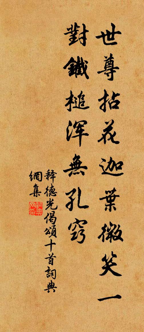 詩詞名句歷史字典書法欣賞書法字典國語詞典說文解字康熙字典古漢語字典標 題 作 者 詩 句 偈頌十首作者:釋德光 朝代:宋代偈頌十首原文世尊拈花,迦葉微笑,一對鐵槌,渾無孔竅。詩詞問答問:偈頌十首的作者是誰?答:釋德光問:偈頌十首寫於哪個朝代?答:宋代釋德光偈頌十首書法欣賞偈頌十首書法作品詩詞推薦山居自遣杜荀鶴〔唐代〕茅屋周回松竹陰,山翁時挈酒相尋。無人開口不言利,只我白頭空愛吟。月在釣潭秋睡重,雲橫樵徑野情深。此中孔平仲著作江州官舍小庵蘇轍〔宋代〕近山不作看山計,引水新成照水庵。閉口忘言中自飽,安心度日更誰參。簡編圍繞穿書蠹,窗戶低回作繭蠶。我亦西省酴醿架上殘雪可愛戲同王元忠席大光賦詩陳與義〔宋代〕酴醿花底當年事,夜雪模糊照酒闌。北省今朝枝上雪,還揩病眼作花看。答簡夫孫應時〔宋代〕不怪年來萬事非,聊須把酒賦新詩。乾坤正自無今昔,草木何妨有變衰。白髮我甘投老去,紅顏君惜臥春時。古人門有車馬客虞世南〔唐代〕陳遵重交結,田蚡擅豪華。曲台臨上路,高軒抵狹斜。赭汗千金馬,繡軸五香車。白鶴隨飛蓋,朱鷺入鳴笳。夏蓮句周文璞〔宋代〕本是離騷國里人。許公子鄭姬歌(鄭園中請賀作)李賀〔唐代〕許史世家外親貴,宮錦千端買沉醉。銅駝酒熟烘明膠,古堤大柳煙中翠。桂開客花名鄭袖,入洛聞香鼎門口。先將別寄一首邵雍〔宋代〕許大秦皇定九州,九州才定卻歸劉。佗人莫謾夸精彩,徒自區區撰白頭。從征虜始安王道中詩江淹〔南北朝〕乘笏從帷幕。仄身豫休明。君子未獲晏。小人亦自營。結軒首涼野。驅馬傃寒城。容裔還鄉棹。逶迤去國旌。山氣書室名可齋或問其義作詩告之陸游〔宋代〕得福常廉禍自輕,坦然無媿亦無驚。平生秘訣今相付,只向君心可處行。覽鏡劉克莊〔宋代〕覽鏡無方染白髭,垂車有疏叩丹墀。故將軍老班師後,村校書貧散學時。百歲電光俄變滅,一場春夢莫尋思。籬邊寄潁州兄祖無擇〔宋代〕川陸一千里,炎涼六十旬。意通書信少,思入夢魂頻。身外宦情薄,眼前人事新。祝兄無見念,憂道不憂貧。送僧歸南嶽項斯〔唐代〕心知衡岳路,不怕去人稀。船里誰鳴磬,沙頭自曝衣。有家從小別,是寺即言歸。料得逢春住,當禪雲滿扉。曹使君置酒石橋山用肉字韻作詩見招不果往復毛滂〔宋代〕玻璃瓶中新壓玉,趨膾腥唇脯麟肉。紫絲步障破煙霏,飴鼎灼炊千蠟燭。山英餼公卻薄相,木蘭墜露和秋菊。此公淳佑甲辰三月中浣奉詔經略同客張景東馮雲從謝逵〔宋代〕尋幽天氣得晴酣,小小籃輿勝繡鞍。洞以乳名雲液涌,泉紆石出水晶寒。山容染翠開油幕,竹韻鳴竽立玉竿。孰謂秋夜郭昭著〔宋代〕秋空澹澹天無極,東望平林淨如拭。清光倒湧冰輪寒,山河明作玻璃色。主人對此欲凌風,瑤光浮白珍珠紅。留連節使少師王公輓詩二首李彌遜〔宋代〕家聲許史舊,弱冠近天墀。權出諸公右,官嫌二品卑。多知緣好古,得句舊能詩。自怪文開後,風流有此兒。懷歸丐祠陳傅良〔宋代〕久矣懷歸曷月哉,冠纓吾欲濯吾埃。天寒病馬尚遠放,日夕罷牛宜下來。名家翰墨書還蠹,蓋世功名骨已苔。孰與題危見心所藏陳常庵水月障及松鶴蘆雁各一首艾性夫〔宋代〕陳郎筆勢并州剪,十幅生綃秋綠遠。老蟾欲作騎鯨游,推墮玉盤波底轉。謫仙濡袍窺採石,東坡醉客歌赤壁。兩翁脫身軍府暫憩先月亭前挹湖光左右花木交映壁羅公升〔宋代〕四年塵沙中,奔走日不給。空歌下泉詩,頗愧夔子集。今晨出軍府,心與歸鳥急。花迎曉日笑,樹沐清露濕。清漪名句推薦何事春風容不得?和鶯吹折數枝花。王禹偁《春居雜興·兩株桃杏映籬斜》 和大怨,必有餘怨;報怨以德,安可以為善?老子《老子·德經·第七十九章》 寂寂竟何待,朝朝空自歸。孟浩然《留別王侍御維 / 留別王維》 亭皋木葉下。隴首秋雲飛。柳惲《搗衣詩》 但存夫子三分禮,不犯蕭何六尺條。馮夢龍《醒世恆言·卷十三》 江海之所以能為百穀王者,以其善下之,故能為百穀王。老子《老子·德經·第六十六章》 明朝望鄉處,應見隴頭梅。宋之問《題大庾嶺北驛》 相思難表,夢魂無據,惟有歸來是。歐陽修《青玉案·一年春事都來幾》 行路難!行路難!多歧路,今安在?李白《行路難三首》 草木秋死,松柏獨在劉向《說苑·談叢》