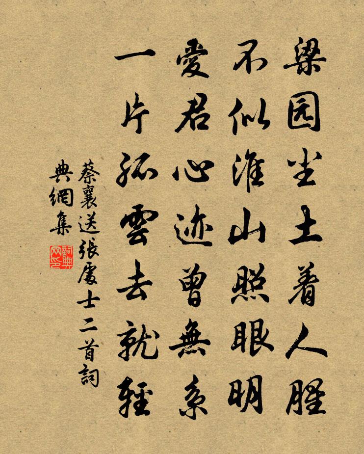 詩詞名句歷史字典書法欣賞書法字典國語詞典說文解字康熙字典古漢語字典標 題 作 者 詩 句 送張處士二首作者:蔡襄 朝代:宋代送張處士二首原文梁園塵土著人腥,不似淮山照眼明。愛君心跡曾無系,一片孤雲去就輕。詩詞問答問:送張處士二首的作者是誰?答:蔡襄問:送張處士二首寫於哪個朝代?答:宋代蔡襄送張處士二首書法欣賞送張處士二首書法作品詩詞推薦日永艾性夫〔宋代〕日永駒難過,庭空雀亦無。花招蜂出早,草礙蟻行迂。蕉葉露台掌,水光天影圖。下簾便道靜,煙篆起茶爐。頌一百則釋重顯〔宋代〕麈中麈,君看取。下一箭,走三步。五步若活,成群趁虎,正眼從來付獵人。參政李秀叔輓詞二首周必大〔宋代〕憶昨淳熙謹萬微,再登耆哲貳繁機。謀猷入告宸心沃,俊刈旁招物望歸。惠斂十連遺愛遠,年開九秩近臣稀。全名題蔡州壺仙觀祖無擇〔宋代〕鶯老花殘過禁菸,杖藜閒步到壺仙。仙家本是無塵地,別有風光一洞天。明水寺范應鈴〔宋代〕環山清淺一溪水,夾徑高低十里松。煙鎖石門疑路斷,斜陽影裹忽聞鍾。摸魚兒(題甘露寺多景樓)孫吳會〔宋代〕八窗空、展寬秋影,長江流入尊俎。天圍紺碧低群岫,斜日去鴻堪數。沈別浦。但目斷、煙蕪莽蒼連平楚。晨鐘暮王三十七自京垂訪,作此送之徐鉉〔唐代〕失鄉遷客在天涯,門掩苔垣向水斜。只就鱗鴻求遠信,敢言車馬訪貧家。煙生柳岸將垂縷,雪壓梅園半是花。惆悵還家寄邢德允曾黯〔宋代〕年來已是飽知津,倦客空驚老大身。傍塞兵戈猶曩日,滿園桃李又新春。半生飄泊成何事,一味痴頑略勝人。欲問元夕周邦彥〔宋代〕翠華臨闕巷無人,曼衍魚龍觸眼新。羽蝶低昂萬人醉,木山采錯九城春。閒坊厭聽粻煌鼓,曉漏猶飛{左車右歷}幽庭盛烈〔宋代〕幽庭鳥蹴梅花片,蔌蔌因風摶復散。貪看立到晝陰移,滿地蒼苔遮一半。孤懷李覯〔宋代〕智者不在惑,君子貴知幾。彼昏有耳目,無能辯是非。蜀犬盡鳴吠,義輪自光輝。古人不可作,垂涕沾吾衣。答梅聖俞莫登樓歐陽修〔宋代〕莫登管樓,樂哉管都人方競管游,樓闕管夜氣春煙浮。玉輪東來從海陬,纖靄洗盡當空留。燈光月色爛不收,火龍河傳·秋光滿目徐昌圖〔唐代〕秋光滿目,風清露白,蓮紅水綠。何處夢回,弄珠拾翠盈盈,倚闌橈,眉黛蹙。採蓮調穩,吳侶聲相續,倚棹吳江送吳正仲婺倅歸梅溪待闕梅堯臣〔宋代〕山水東陽去未去,朋親苕霅朝復朝。更無越相逃名舸,猶看吳王送女潮。海燕歸齊聲滿屋,溪梅開過子生條。明年賦得垣衣李得〔唐代〕漠漠復霏霏,為君垣上衣。昭陽輦下草,慶笑此生非。醃藹青春去,蒼茫白露稀。猶勝萍逐水,流浪不相依。句張順之〔宋代〕白水一泓澄,茲山定玉骨。句尚顏〔唐代〕浸浸三楚白,渺渺九江寒。秋夜書懷劉應時〔宋代〕金行肅物歲功成,銀漢西斜夜氣清。淡月似為吾輩款,短檠深見古人情。候蟲促織巧能語,露葉墮林微有聲。自笑宿法惠寺賀鑄〔宋代〕驅馬越飛澗,揚旌下回岡。欻見層浮圖,高風振琅璫。重門壯且深,老柏森然行。佛子出延客,投鞭步長廊。中庭拜相第五十五文天祥〔宋代〕我來屬時危,朝野色枯槁。倚君金華省,不在相逢早。名句推薦聰以知遠,明以察微。司馬遷《史記·五帝本紀》 鹹言上國繁華,豈謂帝城羈旅。子蘭《秋日思舊山》 層樓望,春山疊;家何在?辛棄疾《滿江紅·點火櫻桃》 大道之行也,天下為公。戴聖《禮記·禮運》 詩言志,歌永言,聲依永,律和聲。佚名《尚書·虞書·舜典》 驚起卻回頭,有恨無人省。蘇軾《卜運算元·黃州定慧院寓居作》 窮兵極武,仁者不為。令狐德棻《周書·列傳·卷二十七》 兩鬢可憐青,只為相思老。晏幾道《生查子·關山魂夢長》 若教眼底無離恨,不信人間有白頭。辛棄疾《鷓鴣天·晚日寒鴉一片愁》 其出彌遠,其知彌少。老子《老子·德經·第四十七章》