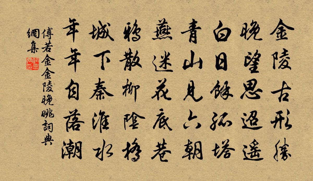 詩詞名句歷史字典書法欣賞書法字典國語詞典說文解字康熙字典古漢語字典標 題 作 者 詩 句 金陵晚眺作者:傅若金 朝代:元代金陵晚眺原文金陵古形勝,晚望思迢遙。白日余孤塔,青山見六朝。燕迷花底巷,鴉散柳陰橋。城下秦淮水,年年自落潮。詩詞問答問:金陵晚眺的作者是誰?答:傅若金問:金陵晚眺寫於哪個朝代?答:元代問:金陵晚眺是什麼體裁?答:五律傅若金金陵晚眺書法欣賞金陵晚眺書法作品注釋元詩別裁集詩詞推薦晚春二首呂祖謙〔宋代〕捲地狂風殿晚春,落花蓋水俗成雲。向人不改故時面,惟有蒼官與此君。禪人並化主寫真求贊釋正覺〔宋代〕江湖之秋,清入雙眸。草木之春,溫生兩唇。髑髏眉底自照眼,赤肉團上無位人。門門得用,薄藝隨身。觀身因緣送嚴詵擢第歸蜀岑參〔唐代〕巴江秋月新,閣道發征輪。戰勝真才子,名高功世人。工文能似舅,擢第去榮親。十月天官待,應須早赴秦。句李燾〔宋代〕山繞一城藏幾寺,江連二水送孤舟。再題趙蕃〔宋代〕舊歲只五日,晚梅能機枝。婆娑一尊酒,陶冶數篇詩。窗靜游蜂寂,檐深立雀窺。書齋寂寞里,藉爾對支頤。一日歸行王安石〔宋代〕賤貧奔走食與衣,百日奔走一日歸。平生歡意苦不盡,正欲老大相因依。空房蕭瑟施繐帷,青燈半夜哭聲稀。音容醉蓬萊(書院延桂有集,不及與)李曾伯〔宋代〕自鷲峰曾見,金粟如來,猶有英烈。碧玉琅玕,點綴碎瓊屑。不御紛華,獨餐沆瀣,比眾芳殊別。好向涼宵,無風答高才卿二絕洪咨夔〔宋代〕煙波只艇著吾徒,蓴膾秋風早憶吳。左蟹右杯東計決,醉來萬事付含糊。念奴嬌(用傳安道和朱希真梅詞韻)朱熹〔宋代〕臨風一笑,問群芳誰是,真香純白。獨立無朋,算只有、姑射山頭仙客。絕艷誰憐,真心自保,邈與塵緣隔。天然玩丹砂 因觀無為庵記憶鬍子金馬鈺〔元代〕霞友中條鬍子金。金波玉灩滌胸襟。襟襟雲水到如今。今看無為庵妙記,記中字字燦予衿。衿托光彩怎生禁。彈子岩題名吳居仁〔宋代〕吾儕生江南,遠近俱鄰鄉。一官皆為貧,餬口走四方。遇合良獨難,動如參與商。誰知自有時,朋盍聚炎荒。外台句錢昭度〔宋代〕風欲拋高雨壓沉,黃昏前後五更深。送吳子隆節推之官信州五首陳造〔宋代〕連城照乘動分珍,他日詞壇著散人。詩筆有神官有暇,楚鱗燕翼要頻頻。讀嚴光傳二首劉克莊〔宋代〕一棲岩壑一衝霄,冠履聯翩建武朝。招得故人來話舊,也呼文叔作唐堯。頌古十首釋普岩〔宋代〕如是如何下法眼,驀然突出破沙盆。依稀渭北春天樹,仿佛江東日暮雲。辛亥去國陳宗之胡希聖送行避謗不敢見希聖贈劉克莊〔宋代〕苛留不覺夏徂秋,甚笑周顒卻效尤。往聖明言衰戒得,先賢亦謂耄宜休。空疏謁帝無高論,老退明農已熟籌。慚愧門外獨望陸游〔宋代〕離離遠樹傍煙津,又見清秋一歲新。老眼厭看南北路,流年暗換往來人。鑄金遺像誰能記?執玉來朝適已陳。況我擬古五首方回〔宋代〕江南九月後,無日非重陽。十月十一月,豈不雪且霜。嚴凍殺百草,菊花彌更黃。於茲偶有酒,十觴至百觴。□□和玉泉達老餉筍李洪〔宋代〕籜龍孤介亦駢闐,不比花蔫與柳眠。雪裡頓超千佛地,風來應上四禪天。飽參玉版頭頭是,秀出薌林個個圓。知我寄徐直翁侍郎二首劉克莊〔宋代〕憶昨紛紛眾喙鳴,怪君噤齘久無聲。得非家客留廷尉,或是閨人沮仲卿。白璧微瑕終古在,黃金橫帶霎時榮。從來名句推薦一樹斜陽蟬更咽,曾綰灞陵離別納蘭性德《淡黃柳·詠柳》 深秋寒夜銀河靜,月明深院中庭。尹鶚《臨江仙·深秋寒夜銀河靜》 凡學之道,嚴師為難。戴聖《禮記·學記》 狎興生疏,酒徒蕭索,不似少年時。柳永《少年游·長安古道馬遲遲》 江春不肯留歸客,草色青青送馬蹄。劉長卿《送李判官之潤州行營》 臨水整烏紗。兩鬢蒼華。故鄉心事在天涯。吳琚《浪淘沙·岸柳可藏鴉》 寂寂柴門村落里,也教插柳記年華。趙鼎《寒食》 賢達哀樂,不在窮通禍福之間。脫脫《遼史·列傳·卷三十四》 食之以時,用之以禮。孟子《孟子·盡心章句上·第二十三節》 江山留勝跡,我輩復登臨。孟浩然《與諸子登峴山》