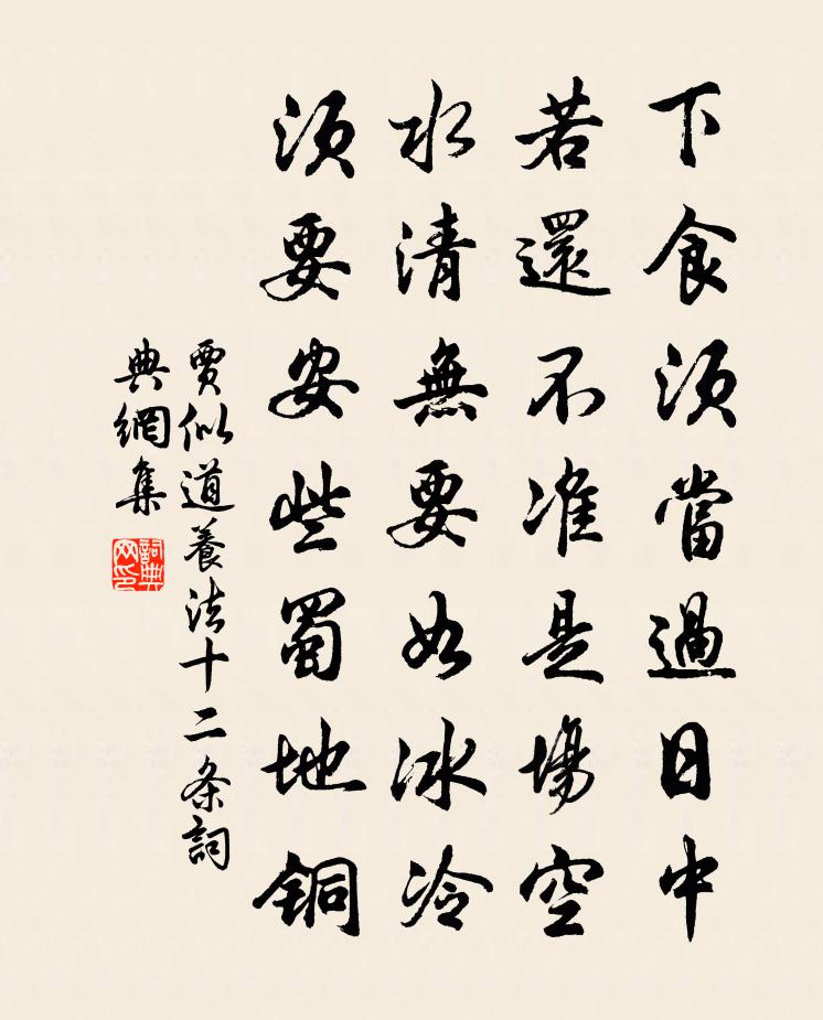 詩詞名句歷史字典書法欣賞書法字典國語詞典說文解字康熙字典古漢語字典標 題 作 者 詩 句 養法十二條作者:賈似道 朝代:宋代養法十二條原文下食須當過日中,若還不準是場空。水清無要如冰冷,須要安些蜀地銅。詩詞問答問:養法十二條的作者是誰?答:賈似道問:養法十二條寫於哪個朝代?答:宋代賈似道養法十二條書法欣賞養法十二條書法作品詩詞推薦送毅父弟使江東孔武仲〔宋代〕人生何能為,寄跡夢寐中。之子又遠去,扁舟逐江風。而我獨棲棲,弱羽掛樊籠。袖手欲大呼,窘如猿檻窮。逼迫表忠觀董嗣杲〔宋代〕錢子欣然著羽衣,何須學賦鑑湖詩。帝俞清獻垂情疏,人讀文忠敘事碑。五廟袞土榮祖節,千年香火托孫枝。雲林唐多令 和劉改之張之翰〔元代〕何處是滄洲。寒波不盡流。恰登舟、便過城樓。一片錦雲三萬頃,常記得、藕花秋。漁父雪蒙頭。此情知道否。說詠老贈夢得白居易〔唐代〕與君俱老也,自問老何如。眼澀夜先臥,頭慵朝未梳。有時扶杖出,盡日閉門居。懶照新磨鏡,休看小字書。情於依韻和武平苕霅二水梅堯臣〔宋代〕昔愛伊與洛,今逢苕與霅。南郭復西城,曉色明於甲。塵纓庶可濯,白鳥誰來狎。落日潭上歸,魚歌自相答。次韻喻存道二首郭印〔宋代〕訪道尋師積有年,晚逢夫子嘆高堅。玄關啟處功深矣,妙指傳來意豁然。氣會三宮馳聖轂,理歸一轍棄塵編。工夫風入松(溪山堂竹·別本作子昂竹石卷子)張炎〔宋代〕新篁依約佩初搖。老石潤山腰。逸人未必猶酣酒,正溪頭、風雨瀟瀟。礪齒猶隨市隱,虛心肯受春招。從教三逕入奉和聖制早發三鄉山行張九齡〔唐代〕羽衛森森西向秦,山川歷歷在清晨。晴雲稍卷寒岩樹,宿雨能銷御路塵。聖德由來合天道,靈符即此應時巡。遣賢蘇潛聖輓詞蘇軾〔宋代〕妙齡馳譽百夫雄,晚節忘懷大隱中。悃愊無華真漢吏,文章爾雅稱吾宗。趨時肯負平生志,有子還應不死同。惟我題霍山秦尊師(一作鄭遨詩)杜光庭〔唐代〕老鶴玄猿伴采芝,有時長嘆獨移時。翠娥紅粉嬋娟劍,殺盡世人人不知。送李宣叔倅漳州王安石〔宋代〕閩山到漳窮,地與南越錯。山川郁霧毒,瘴癘春冬作。荒茅篁竹閒,蔽虧有城郭。居人特鮮少,市井宜蕭索。野花感昔陸游〔宋代〕老君洞外小朱扉,雲壓寒空雪欲飛。結陣弓刀邊壘去,掛鞍狐兔獵場歸。到朱方寄智夫時為戶部官吳則禮〔宋代〕逐客藜糝大官羊,蓬廬畫省遙相望。囊中錐處吾罷矣,地上錢流君未央。一身投老雞豚社,百戰平生翰墨場。拍拍三門諺佚名〔唐代〕古無門匠墓。和令狐相公詠梔子花劉禹錫〔唐代〕蜀國花已盡,越桃今已開。色疑瓊樹倚,香似玉京來。且賞同心處,那憂別葉催。佳人如擬詠,何必待寒梅。山中獨吟白居易〔唐代〕人各有一癖,我癖在章句。萬緣皆已消,此病獨未去。每逢美風景,或對好親故。高聲詠一篇,恍若與神遇。自為和三兄之山陽省孀姊書懷韓維〔宋代〕君子蹈仁我,近自親愛始。當行豈顧留,千里猶舉趾。伯氏有東役,駕言適淮涘。離西半球未及展,濁醪未及灑。小本蘭亭二種方回〔宋代〕子云可擬易論無,頗似蘭亭細字模。始信聖經非小藝,不羞依樣畫葫蘆。睡起龍輔〔宋代〕下幃恣午睡,怪殺鳥相呼。起來慵刺繡,窗下理菖蒲。題村學圖陳鑒之〔宋代〕田父龍鍾雪色髯,送兒來學尚腰鎌。先生莫厭村醪薄。醴酒雖家有楚鉗。名句推薦年年躍馬長安市。客舍似家家似寄。劉克莊《玉樓春·戲林推》 一樹春風千萬枝,嫩於金色軟於絲。白居易《楊柳枝詞》 彩線輕纏紅玉臂,小符斜掛綠雲鬟。蘇軾《浣溪沙·端午》 送客自傷身易老,不知何處待先生。劉滄《贈道者》 掩柴扉,謝他梅竹伴我冷書齋。沈自晉《玉芙蓉·雨窗小詠》 形影忽不見,翩翩傷我心。曹植《雜詩六首·其一》 攀荷弄其珠,蕩漾不成圓。李白《折荷有贈》 但東望、故人翹首。戴復古《賀新郎·寄豐真州》 夫子循循然善誘人孔子弟子《論語·子罕篇》 一郡官閒唯副使,一年冷節是清明。王禹偁《清明日獨酌》