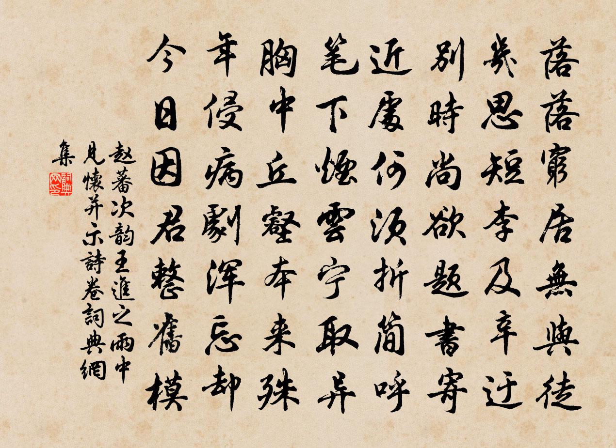 詩詞名句歷史字典書法欣賞書法字典國語詞典說文解字康熙字典古漢語字典標 題 作 者 詩 句 次韻王進之雨中見懷並示詩卷作者:趙蕃 朝代:宋代原文落落窮居無與徒,幾思短李及辛迂。別時尚欲題書寄,近處何須折簡呼。筆下煙雲寧取異,胸中丘壑本來殊。年侵病劇渾忘卻,今日因君整舊模。詩詞問答問:《次韻王進之雨中見懷並示詩卷》的作者是誰?答:趙蕃問:該詩寫於哪個朝代?答:宋代書法欣賞次韻王進之雨中見懷並示詩卷書法作品詩詞推薦野花(一作羅鄴詩)羅隱〔唐代〕萬點紅芳血色殷,為無名字對空山。多因戲蝶尋香住,少有行人輟棹攀。若在侯門看不足,為生江岸見如閒。結根真游覓唐輿題詩不見有懷其人八首趙蕃〔宋代〕去矣不為難,山長水又寬。未曾搖短棹,已自失危欄。厚意煩三友,相要下急灘。雖然賒執手,顧免別辭酸。四伯父生日項安世〔宋代〕春入芳蘭喜氣濃,天風吹下慶重重。大兒穩護梁州罽,小女登高監宅龍。南畝新年付熊驥,北窗長日慕喬松。阿鹹春晚客懷 其一王冕〔元代〕春事已過半,客懷何悵然?鳥啼雲外樹,花落雨余田。沽酒不成醉,解衣徒自憐。五湖煙水遠,未得問歸船。七夕日遊仙人洞朱翌〔宋代〕蟬引秋風上桂枝,登山臨水不勝悲。獸蹲虎踞石見怪,天劃神刓洞出奇。無復碧藍雞刷羽,空餘青栗蝟攢皮。儻分答劉正之見招四絕黃榦〔宋代〕君因戇直招時論,我以疎愚厭俗紛。萬事不須開著眼,蒼山白醑對西曛。搗練子宋先生〔宋代〕真水火,謝師傳。黑鉛紅汞鼎中煎。現神光,滿目前。丹砂就,是神仙。金鼎捉住壽同天。待功成,玉帝宣。次韻酬其又方岳〔宋代〕心事一鷗輕,郵簽夜卜程。春寒眼對雨,別久語連明。硯有詩能秀,山於夢亦清。歙溪多老石,一一待題名。送李庶子致仕還洛楊炯〔唐代〕此地傾城日,由來供帳華。亭逢李廣騎,門接邵平瓜。原野煙氛匝,關河游望賒。白雲斷岩岫,綠草覆江沙。詔賜偈二首釋擇崇〔宋代〕西山青,無謂情。洪井碧,無涓滴。西山人,見曷親。西山事,無可似。若是靈利底舉著便知,懵懂者付與德山臨念奴嬌(夏夜流螢照窗)陳著〔宋代〕暑天向晚,最相宜、一簇涼生新竹。瀟灑軒窗還此景,此景真非凡俗。猿鶴相隨,煙霞自在,與我交情熟。人生如答叔剛見貽孫應時〔宋代〕流復辭家客鳳城,小樓在書寫蘭亭。從教佩印榮蘇子,豈為鋤金動管寧。尚有故人同一笑,何妨時俗忌偏醒。君知奧村晚望黃公度〔宋代〕山逐寒雲斷,天隨暮靄低。稻畦迷上下,樵逕自東西。故國存書劍,他鄉尚鼓鼙。涓埃期補報,未敢卜幽棲。偈六十九首釋道寧〔宋代〕琉璃殿上,古佛舒光。明月堂前,曇華布影。不用南詢彌勒,何須東覓文殊。華藏門開,任君瞻仰。或舒或卷,塵皇帝閣春帖子許應龍〔宋代〕三白從來兆歲豐,幾看瑞雪舞迴風。蒼龍掛闕農祥正,擊壤行歌我稼同。次韻蔡仲平察院中秋葛立方〔宋代〕素魄經秋分外明,桂枝濃傍蕊淵清。人寰散影千山白,愁絕村村砧杵鳴。唐享太廟樂章。雍和二首張說〔唐代〕在滌嘉豢,麗碑敬牲。角握之牝,色純之騂。火傳陽燧,水溉 * 。太公胖俎,傅說和羹。俎豆有馥,齊盛潔豐。春寒陸游〔宋代〕滔天來洚水,震瓦戰昆陽。此敵猶能御,春寒不可當。傷白積殿丞林逋〔宋代〕吏散門牆轉寂然,疏狂投分向生前。苦無名位高今世,空有文章出古賢。遺傳得誰修闕下,孤墳應祇客江邊。池陽春雨王安石〔宋代〕苦霧藏春色,愁霖病物華。幽奇無可奈,強釂一杯霞。名句推薦春衫著破誰針線,點點行行淚痕滿。黃公紹《青玉案·年年社日停針線》 夫以奢侈之君,御好淫僻之民,欲國無亂,不可得也。墨子《墨子·06章 辭過》 天意憐幽草,人間重晚晴。李商隱《晚晴》 朝真暮偽何人辨,古往今來底事無。白居易《放言五首·其一》 失天下也,失其民也;失其民者,失其心也。孟子《孟子·離婁章句上·第九節》 楊花落,燕子橫穿朱閣。李清臣《謁金門·楊花落》 亂花漸欲迷人眼,淺草才能沒馬蹄。白居易《錢塘湖春行》 櫪馬苦踡跼,籠禽念遐征。張九齡《秋晚登樓望南江入始興郡路》 二月春花厭落梅。仙源歸路碧桃催。渭城絲雨勸離杯。晏幾道《浣溪沙·二月春花厭落梅》 君家玉女從小見,聞道如今畫不成。黃庭堅《謝張仲謀端午送巧作》