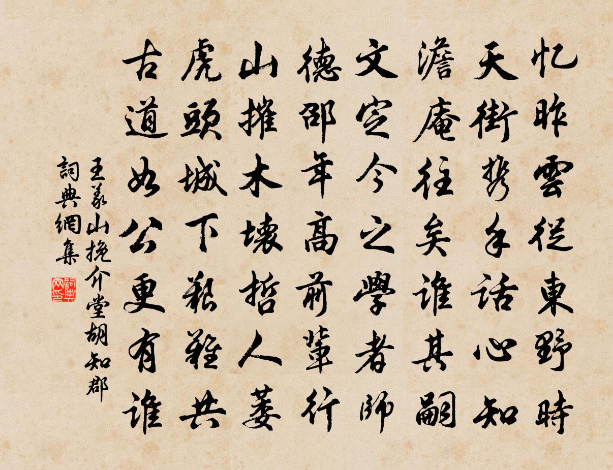 詩詞名句歷史字典書法欣賞書法字典國語詞典說文解字康熙字典古漢語字典標 題 作 者 詩 句 挽介堂胡知郡作者:王義山 朝代:宋代挽介堂胡知郡原文憶昨雲從東野時,天街攜手話心知。澹庵往矣誰其嗣,文定今之學者師。德邵年高前輩行,山摧木壞哲人萎。虎頭城下艱難共,古道如公更有誰。詩詞問答問:挽介堂胡知郡的作者是誰?答:王義山問:挽介堂胡知郡寫於哪個朝代?答:宋代王義山挽介堂胡知郡書法欣賞挽介堂胡知郡書法作品詩詞推薦新蟬寇準〔宋代〕寂寂宮槐雨乍晴,高枝微帶夕陽明。臨風忽起悲秋思,獨聽新蟬第一聲。頌古三十一首釋梵琮〔宋代〕怪雨狂風勢欲傾,陰垂六合見雲騰。一條瀑布岩前落,界破青山千萬層。南嶽魏監廟曩自請奉祠恬於聲利十餘年來益閉牟巘五〔宋代〕全真閉戶魏不琢,二紀怡然外世榮。留得詩名皮陸集,到君句法有餘清。酹江月譚處端〔元代〕玉花漸吐,被清風。催結金蓮光聚。歷劫昏迷齊照破,直透無為門戶。七返回光,三空覺照,間隔金花處。殷勤鍛秋懷十首以竹藥閉深院琴樽開小軒為韻陸游〔宋代〕短裘入重雲,長鑱求靈藥。人葠四體具,狗杞群吠惡。采實去條枚,摘花棄跗萼。長嘯忽躡空,天台赴幽約。為章道祖頗及葛藤錦薰闔葛立方〔宋代〕窈窕軒窗小闔深,種花卜得半晴陰。眼根忽隨錦繡谷,鼻觀如游檐卜林。莫問花枝有開落,須知法性勿來今。色香夜泊虹縣同施景仁太博河上納涼書事梅堯臣〔宋代〕與君愛清風,移榻就明月。月落見星繁,星繁如晝熱。沾衣輕露墜,響岸崩湍齧。坐思都城時,誰許腳不鞋。題雪竇飛雪亭高元之〔宋代〕危亭上拂煙霧光,蒼崖深到蛟螭穴。天河飛來破山翠,寒入疏林風自發。翻珠錯玉無時歇,岩前散作千秋雪。寒聲清平樂晁補之〔宋代〕寒風雁度。聲向千門去。也到文闈校文處。也到文君繡戶。背燈解帶驚魂。長安此夜秋聲。早是夜寒不寐,五更風畫松景雲〔唐代〕畫松一似真松樹,且待尋思記得無。曾在天台山上見,石橋南畔第三株。送王明叟起秀州法掾強至〔宋代〕去去持丹筆,當官議是非。壯心低仕路,戀涕濕親衣。汲浪檣烏急,吳霜稻蟹肥。論文杯酒後,從此故人稀。贈僧釋智圓〔宋代〕諸祖參尋遍,消搖發未華。舊房扃海外,孤跡寄天涯。琢句秋窗月,觀空晚砌華。時來說高趣,終去隱煙霞。蝶戀花袁去華〔宋代〕十二峰前朝復暮。空憶蘭台,公子高唐句。斷雨殘雲無覓處。古來離合歸冥數。咫尺明河無限路。牛女佳期,猶解不寐顧禧〔宋代〕英雄不世出,豎子自成名。誰諛美新筆,曾憐覆楚兵。輕霜零病葉,急雁過寒城。入夜愁無似,悲笳處處聲。淳化中朝會二十三首佚名〔宋代〕聖皇御宇,仁灶誕彰。在郊旅貢,游疇呈祥。星辰是稟,草木無傷。紀異信史,登歌太常。獨宿峴首憶長安故人孟郊〔唐代〕月迥無隱物,況復大江秋。江城與沙村,人語風颼飀。峴亭當此時,故人不同游。故人在長安,亦可將夢求。【雙調】胡十八張養浩〔元代〕正妙年,不覺的老來到。思往常,似昨朝,好光陰流水不相饒,都不如醉了,睡著。任金烏搬廢興,我只推不知道段都尉別業竇庠〔唐代〕曾識將軍段匹磾,幾場花下醉如泥。春來欲問林園主,桃李無言鳥自啼。見學院諸生作詩因和呂希純〔宋代〕騏驥方騰踏,蚊虻敢撲緣。明年小期集,請看十廬鞭。禹碑劉贄〔宋代〕壇峙 * 石,溪忘夏禹碑。物神人所貴,世事遠誰知。名句推薦忽見陌頭楊柳色,悔教夫婿覓封侯。王昌齡《閨怨》 不蔽人之善,不言人之惡劉向《戰國策·楚一·江乙為魏使於楚》 林壑斂暝色,雲霞收夕霏。謝靈運《石壁精舍還湖中作》 夜市賣菱藕,春船載綺羅。杜荀鶴《送人游吳》 落花狼藉酒闌珊,笙歌醉夢間。李煜《阮郎歸·呈鄭王十二弟》 桃花塢裏桃花庵,桃花庵裏桃花仙。唐寅《桃花庵歌》 妙年出補父兄處,公自才力應時須黃庭堅《送范德孺知慶州》 蠟淚惱東風,舊壘眠新燕。納蘭性德《生查子·鞭影落春堤》 遠水難救近火,遠親不如近鄰。佚名《增廣賢文·上集》 秋到邊城角聲哀,烽火照高台。陸游《秋波媚·七月十六日晚登高興亭望長安南山》
