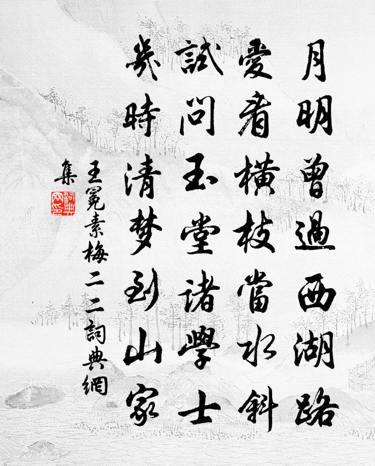 詩詞名句歷史字典書法欣賞書法字典國語詞典說文解字康熙字典古漢語字典標 題 作 者 詩 句 素梅 二二作者:王冕 朝代:元代素梅 二二原文月明曾過西湖路,愛看橫枝當水斜。試問玉堂諸學士,幾時清夢到山家?詩詞問答問:素梅 二二的作者是誰?答:王冕問:素梅 二二寫於哪個朝代?答:元代問:素梅 二二是什麼體裁?答:七絕問:王冕的名句有哪些?答:王冕名句大全王冕素梅 二二書法欣賞素梅 二二書法作品詩詞推薦廣支蘇才翁輓詞三首梅堯臣〔宋代〕自昔愛春物,樽深眼底紅。日斜花在落,身醉客西東。歿嘆千年隔,生悲百事空。君嘗知此理,不悞學陶公。漁家傲佚名〔宋代〕頻伽。三十六般包一袋。膿囊臭穢猶貪愛。恰似蜣螂推糞塊。無停待。朝朝只在塵中。若解堅心生重悔。寧拘惡逆贈常庵江羽士徐清叟〔宋代〕九曲溪頭活計,三生石上精魂,沓沓間云何處,空山明月啼猿。棘刺雕猴韓非〔先秦〕燕王好微巧,衛人請以棘刺之端為母猴。燕王說之,養之以五乘之奉。王曰:“吾視觀客為棘刺之母猴。”客曰:春台引陳子昂〔唐代〕感陽春兮生碧草之油油。懷宇宙以傷遠,登高台而寫憂。遲美人兮不見,恐青歲之遂遒。從畢公以酣飲,寄林塘而次韻蔡子駿瓊花秦觀〔宋代〕無雙亭上傳觴處,最惜人歸月上時。相見異鄉心欲絕,可憐花與月應知。探春慢(四明除夜)趙以夫〔宋代〕屑璐飄寒,鏤金獻巧,妝成水晶亭榭。飛絮悠揚,散花零亂,絕勝翠嬌紅冶。粉艷嘻嘻道,盡飛上、使君鬚也。多聞紅鶴有感張耒〔宋代〕東風吹曉麥青青,柯山樹頭紅鶴嗚。窗間夢斷客嘆息,憶我去年臨汝城。平池朱閣花如雪,峴山少室兩奇絕。豈知殘句:惟有南宮竇員外王禹偁〔宋代〕惟有南宮竇員外,為予垂淚閤門前。雜詠一百首緹縈劉克莊〔宋代〕天子覽書悲,肉刑無復施。不惟嘉烈女,亦自活神醫。都中書懷二首戴復古〔宋代〕雪化晴檐雨,爐烘凍壁春。窮猶戀詩酒,懶不正衣巾。寂寞安吾分,賓士失我真。枯桐就煨燼,容有賞音人。菩薩蠻蔡伸〔宋代〕金鋪半掩銀蟾滿。個人應恨歸來晚。軋軋櫓聲遲。那知心已飛。迎門一笑粲。嬌困橫波慢。偎倚綠窗前。今宵人月春到湖莊曹彥約〔宋代〕飽綠勻楊柳,殷紅茁海棠。將春至昌谷,及早下湖莊。祠事三年樂,邊心萬里長。新來和氣好,吉報已占祥。句張繼〔唐代〕漢月經時掩,胡塵與歲深。(《詠鏡》,見《詩式》)。第二百四十三卷同樊潤州游郡東山皇甫冉〔唐代〕北固多陳跡,東山復盛游。鐃聲發大道,草色引行騶。此地何時有,長江自古流。頻隨公府步,南客寄徐州。感歸鳥趙蕃〔宋代〕鳥雀知既夕,相逢如擇棲。嗟余獨何者,失侶自東西。贈畫工王三錫傳神魏了翁〔宋代〕氣質紛不齊,四海無似人。藉令貌相近,氣有醇不醇。善觀人品者,儀觀與機神。正邪眸子見,善惡眉間分。且如子經昔有黃筌玉筍圖故人陳眾仲題詩其上後為胡仲弓〔宋代〕春雷仇仇盎中鳴,籜龍驚起頭角獰。斕斑裂土穿石出,長鑱斸下津浮玉。山人嗜之比八珍,畫師寫生傳千春。纖纖題長樂驛壁佚名〔宋代〕三十驊騮一烘塵,來時不鎖杏園春。楊花滿地如飛雪,應有偷游曲水人。過秦樓·紺玉波寬周密〔宋代〕紺玉波寬,碧雲亭小,苒苒水楓香細。魚牽翠帶,燕掠紅衣,雨急萬荷喧睡。臨檻自采瑤房,鉛粉沾襟,雪絲縈指名句推薦秋色漸將晚,霜信報黃花。葉夢得《水調歌頭·秋色漸將晚》 多情只有春庭月,猶為離人照落花。張泌《寄人》 飄零疏酒盞,離別寬衣帶。秦觀《千秋歲·水邊沙外》 小山重疊金明滅,鬢雲欲度香腮雪。溫庭筠《菩薩蠻·小山重疊金明滅》 聽元宵,今歲嗟呀,愁也千家,怨也千家。王磐《古蟾宮·元宵》 受任於敗軍之際,奉命於危難之間諸葛亮《前出師表》 憶昨車聲寒易水,今朝,慷慨還過豫讓橋。陳維崧《南鄉子·邢州道上作》 楊花落盡子規啼,聞道龍標過五溪。李白《聞王昌齡左遷龍標遙有此寄》 巧笑倩兮,美目盼兮,素以為絢兮。孔子弟子《論語·八佾篇》 蜀天常夜雨,江檻已朝晴。杜甫《水檻遣心二首》