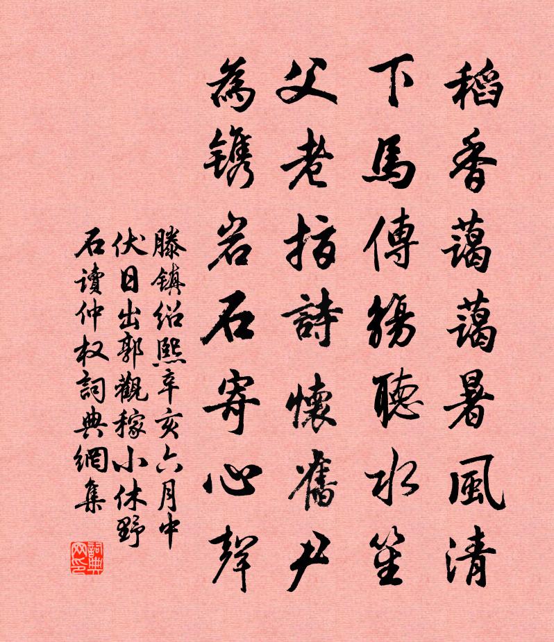 詩詞名句歷史字典書法欣賞書法字典國語詞典說文解字康熙字典古漢語字典標 題 作 者 詩 句 紹熙辛亥六月中伏日出郭觀稼小休野石讀仲權作者:滕鎮 朝代:宋代原文稻香藹藹暑風清,下馬傳觴聽水笙。父老指詩懷舊尹,為鐫岩石寄心聲。詩詞問答問:《紹熙辛亥六月中伏日出郭觀稼小休野石讀仲權》的作者是誰?答:滕鎮問:該詩寫於哪個朝代?答:宋代書法欣賞紹熙辛亥六月中伏日出郭觀稼小休野石讀仲權書法作品詩文賞析【原題】:紹熙辛亥六月中伏日出郭觀稼小休野石讀仲權正字壁間所題詩因次韻詩詞推薦惜竹孔武仲〔宋代〕老蘚牆陰夕照間,何人折我翠琅玕。即茲綠葉隨塵化,猶有低枝帶露殘。不放雲梢侵霰雪,因嗟世故足波瀾。故園與蘇州守十詩以兵衛森畫戟燕寢凝清香為韻周麟之〔宋代〕洞庭雨斷兼天碧,松江月明波動色。剪橘霜包照座黃,鱠鱸雪縷堆盤白。秋到湖山最佳處,此景付公天不惜。英名滿庭芳 骷髏樣馬鈺〔元代〕樣子骷髏,偏能販骨,業緣去去來來。騁馳伶俐,不肯暫心灰。轉換無休無歇,騰今古、更易形骸。空貪壽,饒經大滌洞天留題二首秘仲威〔宋代〕紫府清都不可梯,何年宮闕下遷移。飛來殿閣風雷架,逼近岩崖日月馳。境靜固宜真聖宅,地靈唯許列仙知。想應古意宋祁〔宋代〕持鷸蚌謀壯,貪蟬鵲意深。漁人一拱手,彈者笑依林。次韻和江鄰幾送客回同過金明池二首梅堯臣〔宋代〕送別西亭車馬塵,天池回傍欲迷津。畫船龍尾何時發,丹杏梢頭漏泄春。將至泗上微雪快晴吳則禮〔宋代〕僧伽憐吾來,娛我六出英。又復憂吾寒,迎我以好晴。何以謝僧伽,汲水添淨瓶。頌古二十五首釋崇岳〔宋代〕百丈狸奴面,溈山鬼睛眼。見人空解笑,弄物不知名。次王帥韻後詩呈葉教授陳造〔宋代〕功名回首負年華,梨棗諸雛未克家。老計生涯須下澤,才非世用但匏瓜。為儒僅博肱三折,謀食寧羞手一叉。青眼次梁教授見貽韻五首陳造〔宋代〕誰向仙曹接勝譚,金泥天篆署冰銜。如聞不惜蜚霞佩,乞與耕莘與築岩。天仙子 用韻和趙平原折贈黃香梅之作,並序盧摯〔元代〕始華,折枝走,仍賦樂府天仙子,藉以見晌,用韻和之,聊答盛意半額淡妝鸞影翠。約略玉人新病起。碧彝金雀暗重會岩郭鳳〔宋代〕重華人逸夏商前,奚取名岩紫洞巔。深入才如窺寸管,仰瞻早已到中天。仙田有跡閒芳草,韶樂無聲奇滴泉。遐想王深道別酒走筆秋韻葛紹體〔宋代〕取友但聞道,不問年先後。西澗吾世交,豈在接杯酒。言歸復言歸,光怪願袖手。樓崎靈泉山,松柏歲寒友。次韻范參政書懷陸游〔宋代〕養氣頹然似木雞,謗讒寧復問端倪。生塵甑暖喜炊黍,轑釜羹香忘糝藜。萬里曾游雲棧北,一庵今臥鏡湖西。殘年漢宮詞(一作韓翃詩)李益〔唐代〕漢室長陵小市東,珠簾繡戶對春風。君王昨日移仙仗,玉輦將迎入漢中。書適陸游〔宋代〕老翁垂七十,其實似童兒。山果啼呼覓,鄉儺喜笑隨。群嬉累瓦塔,獨立照盆池。更挾殘書讀,渾如上學時。偈頌一百零二首釋紹曇〔宋代〕八月初,何處熱。出門荒草離披,四壁寒蛩淒切。衲僧家眼裡著得須彌山,耳里著得四大海。聲色純真,只得一橛沁園春(春寒)徐寶之〔宋代〕水榭春寒,梅雪漫階,竹雲墮牆。數花時近也,采芳香徑,舊情著處,看月西窗。十二樓中,玉妃臥冷,懶掬胭脂誡兒侄八百字范質〔宋代〕去上初釋褐,一命列蓬丘。青袍春草色,白紵棄如仇。適會龍飛慶,王澤天下流。爾得六品階,無乃太為優。凡登琴歌趙摶〔唐代〕綠琴制自桐孫枝,十年窗下無人知。清聲不與眾樂雜,所以屈受塵埃欺。七弦脆斷蟲絲朽,辨別不曾逢好手。琴聲名句推薦躞蹀御溝上,溝水東西流卓文君《白頭吟》 憑高眺遠,見長空萬里,雲無留跡。蘇軾《念奴嬌·中秋》 前經洛陽陌,宛洛故人稀。王維《送魏郡李太守赴任》 深村時節好,應為去年豐。范成大《寒食郊行書事》 長江一帆遠,落日五湖春。劉長卿《餞別王十一南遊》 宜未雨而綢繆,毋臨渴而掘井。朱柏廬《朱子家訓·全文》 含煙御柳拂旌旗,帶露宮花迎劍戟。施耐庵《水滸傳·第一回》 姑蘇城外一茅屋,萬樹梅花月滿天。唐寅《把酒對月歌》 草木搖殺氣,星辰無光彩。李白《經亂離後天恩流夜郎憶舊遊書懷贈江夏韋太守良宰》 閉心塞意,不高瞻覽者,死人之徒也哉。王充《論衡·卷十三·別通篇》