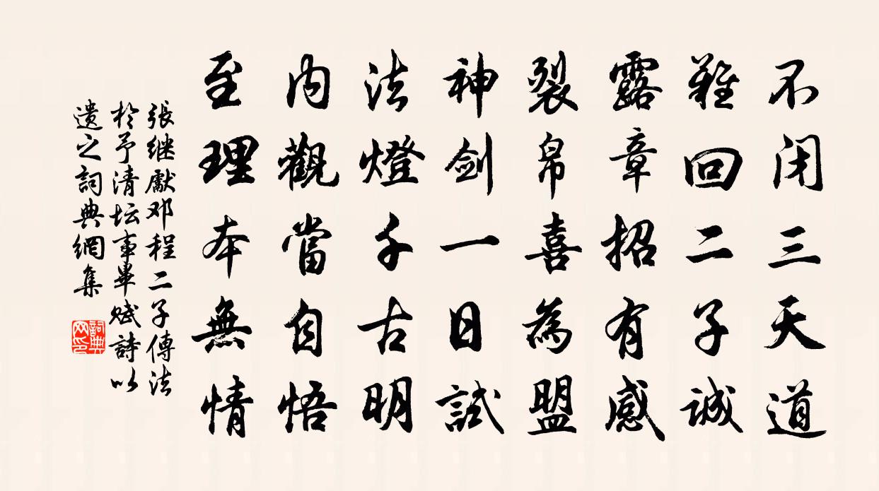 詩詞名句歷史字典書法欣賞書法字典國語詞典說文解字康熙字典古漢語字典標 題 作 者 詩 句 鄧程二子傳法於予清壇事畢賦詩以遺之作者:張繼先 朝代:宋代原文不閉三天道,難回二子誠。露章招有感,裂帛喜為盟。神劍一日試,法燈千古明。內觀當自悟,至理本無情。詩詞問答問:《鄧程二子傳法於予清壇事畢賦詩以遺之》的作者是誰?答:張繼先問:該詩寫於哪個朝代?答:宋代書法欣賞鄧程二子傳法於予清壇事畢賦詩以遺之書法作品詩詞推薦八月初一夜聞雨鄭剛中〔宋代〕過山秋雨響臨池,深夜書齋枕獨欹。正似蓬船倚江浦,夢回牢落聽潮時。感遇之廿八陳子昂〔唐代〕昔日章華宴。荊王樂荒淫。霓旌翠羽蓋。射兕雲夢林。朅來高唐觀。悵望雲陽岑。雄圖今何在。黃雀空哀吟。贈陳處士呂岩〔唐代〕青霄一路少人行,休話興亡事不成。金榜因何無姓字,玉都必是有仙名。雲歸入海龍千尺,雲滿長空鶴一聲。深謝陸嚴州赴召喜成三詩張鎡〔宋代〕知已從來自有天,除書寧復待人傳。青雲直上非逾分,占上聲名五十年。贈戴石屏王伯大〔宋代〕詩老相過鬢已星,吟牟未減昔年清。揮毫不著笑埃語,盡把梅花巧琢成。林和靖祠葉茵〔宋代〕鶴去山孤草亦荒,旋吟長句謁虛堂。束芻尚擬人如玉,一朵梅花當瓣香。曾英發運乾頃攜二詩相過今復寄贈大篇且惠漢周必大〔宋代〕君家奕葉播芳馨,室有圖書暴兩榮。詩什編成風雅頌,寶章臨遍草真行。興來文陣千軍掃,醉後談鋒一座傾。已許有小白馬乘馭多時奉使東行至稠桑驛溘然而斃…題二十韻白居易〔唐代〕能驟復能馳,翩翩白馬兒。毛寒一團雪,鬃薄萬條絲。皂蓋春行日,驪駒曉從時。雙旌前獨步,五馬內偏騎。芳草彥通叔祖約游雲水寺二首楊萬里〔宋代〕出門天色陰晴半,著雨途間進退難。知得招提在何許,只憑田父指林間。故市王洋〔宋代〕頻陽田宅就荒墟,十室居人九室虛。驃騎將軍無甲第,書名竹帛又何如。次韻楊宰對雪有感陳造〔宋代〕生世波上舟,高下隨掀簸。樓閣或藩溷,風花聽飛墮。榮利計圭黍,光陰付膏火。胡不養弘大,而顧蹈嵬瑣。君看酬劉谷立春日吏隱亭見寄李郢〔唐代〕孤亭遙帶寺,靜者獨登臨。楚霽江流慢,春歸澤氣陰。野田青牧馬,幽竹暖鳴禽。日日年光盡,何堪故國心。枯菊陸游〔宋代〕龍山落帽未多時,陳跡依然使我悲。粲粲菊花何似好,階前惟見束枯枝。西江月(十之三)夏元鼎〔宋代〕太一畫前是道,全憑龍虎成丹。九還七返保長年。好個逍遙閒漢。日詣金門玉殿,青衣引贊無言。迴風混合萬神安投贈張端公(一作贈裴樞端公)孟郊〔唐代〕君子量不極,胸吞百川流。嫉邪霜氣直,問俗春辭柔。日戶晝輝靜,月杯夜景幽。詠驚芙蓉發,笑激風飈秋。鸞步司馬懿陳杰〔宋代〕本祖賊為媒,聊同漢報仇。機深螳後雀,禍隱馬中牛。夷甫毋專罪,江生足遠猷。誰開千古恨,落日淡神州。梅花王炎〔宋代〕園林都未覺春風,蓓蕾枝頭茁小紅。要識十分清絕處,暗香疏影月明中。題長松二首何耕〔宋代〕路窮山百轉,雲擁木千章。蕞爾人間世,蕭然古道場。龍神森拱衛,旱魃走祈禳。地遠齋廚薄,重來剩裹糧。夏至張耒〔宋代〕長養功已極,大運忽雲遷。人間漫未知,微陰生九原。殺生忽更柄,寒暑將成年。崔巍乾雲樹,安得保芳鮮。幾微頌古釋道顏〔宋代〕掌中擎白日,舌上覆金錢。壁立爭千仞,毫光徹梵天。名句推薦蕭蕭梧葉送寒聲,江上秋風動客情。葉紹翁《夜書所見》 落梅庭榭香,芳草池塘綠。晏幾道《生查子·落梅庭榭香》 是以其財不足以待凶飢、振孤寡,故國貧而民難治也。墨子《墨子·06章 辭過》 梁園日暮亂飛鴉,極目蕭條三兩家。岑參《山房春事二首》 李白能詩復能酒,我今百杯復千首。唐寅《把酒對月歌》 香爐初上日,瀑水噴成虹。孟浩然《彭蠡湖中望廬山》 野老念牧童,倚杖候荊扉。王維《渭川田家》 東風吹我過湖船。楊柳絲絲拂面。張孝祥《西江月·問訊湖邊春色》 不信比來長下淚,開箱驗取石榴裙。武則天《如意娘》 江山如畫,一時多少豪傑蘇軾《念奴嬌·赤壁懷古》