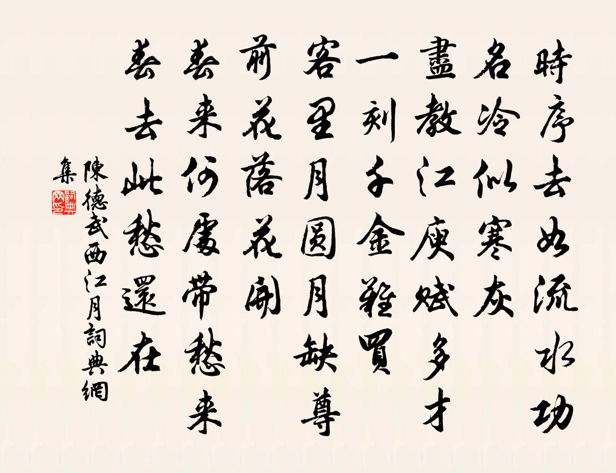 詩詞名句歷史字典書法欣賞書法字典國語詞典說文解字康熙字典古漢語字典標 題 作 者 詩 句 西江月作者:陳德武 朝代:宋代西江月原文時序去如流水,功名冷似寒灰。盡教江庾賦多才。一刻千金難買。客里月圓月缺,尊前花落花開。春來何處帶愁來。春去此愁還在。詩詞問答問:西江月的作者是誰?答:陳德武問:西江月寫於哪個朝代?答:宋代問:西江月是什麼體裁?答:詞陳德武西江月書法欣賞西江月書法作品詩詞推薦和聖俞農具詩十五首其十三襏襫王安石〔宋代〕采采霜露下,披披煙雨中。薄茅以為友,短褐相與同。勿妒市門人,綺紈被奴僮。當慚邊城戍,擐甲徂春冬。己卯十月一日至燕越五日罹狴犴有感而賦文天祥〔宋代〕心期耿耿浮雲上,身事悠悠落日西。千古興亡何限錯,百年生死本來齊。沙邊莫待哀黃鵠,雪裡何須問牧羝。此處慶清朝(木芙蓉)佚名〔宋代〕碧玉雲深,彤綃雲薄,芳叢亂迷秋渚。重城傍水,中有 * 儔侶。應是瓊樓夜冷,月明誰伴乘鸞女。仙遊處。翠帟走筆和張功父玉照堂十絕楊萬里〔宋代〕年年春信遣人疑,賺出詩人枉覓詩。著意探梅偏不發,月斜偶見一橫枝。滿江紅佚名〔宋代〕雪壓梅敧,寫不就、歲寒清絕。正閬苑、五分里過了,三分臘月。送觀過免舉赴省沈說〔宋代〕樽前逢臘近,行李獨西征。事歷風霜慣,春回雨露生。一經家自學,千佛世題名。昨夜瞻奎宿,寒芒萬丈明。【雙調】凌波仙鍾嗣成〔元代〕菊栽栗里晉淵明,瓜種青門漢邵平,愛月香水影林和靖,憶蓴鱸張季鷹,占清高總是虛名。光祿酒扶頭醉,大官羊挽伏德華主簿陽枋〔宋代〕黌堂深惜昔,六典共尋源。合遂齊飛鶚,嘉逾競化鵾。紅顏君早去,白髮我空存。方寸千年事,悽然誰與論。偶成二首鄧肅〔宋代〕我生詩酒弄林泉,紫詔三呼出洞天。高視塵寰但蚊睫,冷看時輩聳鳶肩。山間已袖嬰鱗手,物外今還釣月船。若使緣識宋太宗〔宋代〕無窮思廣大,幽隱便知深。智達千經論,方關一寸心。聰明懷往古,曩劫順從今。此理人須信,周旋子細尋。遊仙詞三十三首王鎡〔宋代〕寶花如雨落龍樓,上界遙觀下界秋。金鳳一聲天欲曉,銀河光趁月西流。題東坡遺墨卷後蘇轍〔宋代〕少年喜為文,兄弟俱有名。世人不妄言,知我不如兄。篇章散人間,墮地皆瓊英。凜然自一家,豈與餘人爭。多難因會來詩再賡元韻鄭清之〔宋代〕組練橫陳壯士貔,想因舞羽去窮奇。千山白髮存公道,十日清吟費老詩。待伴易鎖春有腳,交光最勝月如眉。只愁句王灣〔唐代〕月華照杵空隨妾,風響傳砧不到君。(見《河嶽英靈集》)別敬侍郎杜荀鶴〔唐代〕交道有寒暑,在人無古今。與君中夜話,盡我一生心。所向未得志,豈惟空解吟?何當重相見,舊隱白雲深。春秋戰國門樊姬周曇〔唐代〕側影頻移未退朝,喜逢賢相日從高。當時不有樊姬問,令尹何由進叔敖。偶作釋文珦〔宋代〕風露洗空寒,秋清四體安。偶扶筇杖出,因採菊花餐。老覺心情懶,閒知世界寬。寒山詩一卷,隨意作經看。赴南中留別褚七少府湖上林亭(一作劉長卿詩)李嘉祐〔唐代〕種田東郭傍春陂,萬事無情把釣絲。綠竹放侵行徑里,青山常對捲簾時。紛紛花發門空閉,寂寂鶯啼日更遲。從此浣溪沙 臨川別席張翥〔元代〕昨夜花前送玉鍾。綠鬟歌罷落梅風。不知離思為誰濃。醉語低回銀燭背,夢雲重疊繡幃中。只愁歸路見芙蓉。泊舟嚴灘真山民〔宋代〕天色微茫入暝鍾,嚴陵灘上系孤篷。水禽與我共明月,蘆葉同誰吟晚風。隔浦人家漁火外,滿江愁思笛聲中。雲開名句推薦若待上林花似錦,出門俱是看花人。楊巨源《城東早春》 自從明宰投巫後,直至如今鬼不神汪遵《西河》 侵陵雪色還萱草,漏泄春光有柳條。杜甫《臘日》 分明小像沉香縷,一片傷心欲畫難。納蘭性德《於中好·送梁汾南還為題小影》 恭敬不如從命。曹雪芹《紅樓夢·第六十二回》 神女生涯原是夢,小姑居處本無郎。李商隱《無題·重幃深下莫愁堂》 孤兔淒涼照水,曉風起、銀河西轉。吳文英《玉漏遲·瓜涇度中秋夕賦》 上邪,我欲與君相知,長命無絕衰。佚名《上邪》 天秋日正中,水碧無塵埃。柳宗元《湘口館瀟湘二水所會》 綠楊帶雨垂垂重。五色新絲纏角粽。歐陽修《漁家傲·五月榴花妖艷烘》