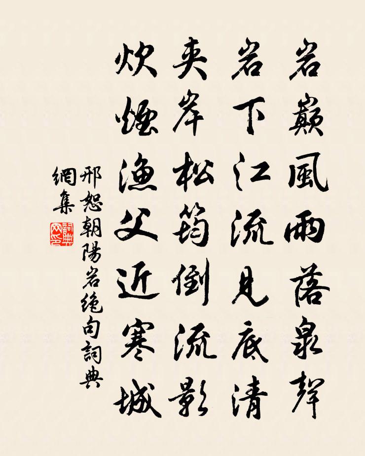 詩詞名句歷史字典書法欣賞書法字典國語詞典說文解字康熙字典古漢語字典標 題 作 者 詩 句 朝陽岩絕句作者:邢恕 朝代:宋代朝陽岩絕句原文岩巔風雨落泉聲,岩下江流見底清。夾岸松筠倒流影,炊煙漁父近寒城。詩詞問答問:朝陽岩絕句的作者是誰?答:邢恕問:朝陽岩絕句寫於哪個朝代?答:宋代邢恕朝陽岩絕句書法欣賞朝陽岩絕句書法作品詩詞推薦鄭子家告趙宣子左丘明〔先秦〕晉侯合諸侯於扈,平宋也。 於是晉侯不見鄭伯,以為貳於楚也。鄭子家使執訊而與之書,以告趙宣子曰:“寡宴桃源/如夢令曹遇〔宋代〕西湖辟暑棹扁舟。忘機狎白鷗。荷香十里供瀛洲。山光翠欲流。歌浩浩,思悠悠。詩成興未休。清風明月解相留。撒金錢袁綯〔宋代〕頻瞻禮。喜昇平、又逢元宵佳致。鰲山高聳翠。對端門、珠璣交制。似嫦娥降仙宮,乍臨凡世。恩露勻施,憑御欄西施篇釋智圓〔宋代〕採蓮越溪上,皆謂尋常女。正位吳中宮,眾品方傳美。視聽猒歌舞,衣裳賤羅綺。賢哉鄰家人,昔年知學嚬。雨霽池上作呈侯學士韋莊〔唐代〕鹿巾藜杖葛衣輕,雨歇池邊晚吹清。正是如今江上好,白鱗紅稻紫蓴羹。句陸扆〔唐代〕今秋已約天台月。十詠 腳下履沈約〔南北朝〕丹墀上颯香。玉殿下趨鏘。逆轉珠佩響。先表繡袿香。裾開臨舞席。袖拂繞歌堂。所嘆忘懷妾。見委入羅床。初渡淮北岸楊凝〔唐代〕別夢雖難覺,悲魂最易銷。殷勤淮北岸,鄉近去家遙。口號十首呈程殿撰陳造〔宋代〕帝所鄉關等是家,奚囊納納盡天葩。西湖久待公題品,莫遣波神妒九華。秋夜葉茵〔宋代〕秋滿讀書林,篝燈報夜深。肯閒詩有趣,為拙仕無心。驚鵲擇枝宿,幽蟬抱葉吟。未能游夢境,何處搗衣砧。睡起行北園吳潛〔宋代〕睡起卸冠簪,園行獨自吟。山昏知雨到,樹密覺春深。竹外童相報,門前客見尋。歸來即敗意,誰者是知心。鼓笛慢(甲申五月仙源試新水。雨過絲生荷香襲人,因感而賦此詞。時病眼)趙長卿〔宋代〕暑風吹雨仙源過,深院靜,涼於水。蓮花郎面,翠幢紅粉,烘人香細。別院新番,曲成初按,詞清聲脆。奈難堪羞秋獮詩歐陽修〔宋代〕豳龠迎寒至,商飈應節流。戎容修大獮,殺氣順行秋。多稼登方茂,三農隙始休。飲歸軍實獻,誓眾黻為裘。索享望思台汪遵〔唐代〕不憂家國任奸臣,骨肉翻為驀路人。巫蠱事行冤莫雪,九層徒築見無因。臘夜普明寺睡覺楊萬里〔宋代〕旅夢忘為客,檐聲忽嘆愁。親庭未差遠,佛屋不勝秋。只麽功名是,如今悟鮮不?十年行路飽,誰不遣吾休。題會稽溪口躬師上人房施昌言〔宋代〕溪口佳山水,高人住此中。生台下沙鳥,疏磐逐江風。倚檻千岩寂,焚香萬法空。如何憑小筆,一為寫衰翁。九日感懷吳芾〔宋代〕淡雲籠日秋容薄,淅淅西風度簾幕。籬邊 * 自重陽,天外幽人正離索。登高那可望長安,記得當年醉豐樂。十千與羅邵諸公同游陳氏園分江頭千樹人慾暗得樹李彌遜〔宋代〕春風譜世情,去我若馳鶩。北枝未破粉,斷萼已飄素。殷勤南郭綦,邀我速冠屨。著鞭向晴原,盤傳咄嗟具。移樽滿庭芳(西園月夜賞花)毛滂〔宋代〕馬絡青絲,障開紅錦,小晴初斷香塵。芳醪滿載,持燭有佳人。飛蓋西園午夜,花梢冷、雲月朧明。折還惜,留花呈陳深交二首趙蕃〔宋代〕役役到番國,悠悠誰故人。僧房半牢落,湖水失清淪。我豈倚樓趙,君真驚座陳。何為辱傾倒,相與盡情親。名句推薦柳色披衫金縷鳳,縴手輕拈紅豆弄,翠蛾雙斂正含情。和凝《天仙子·柳色披衫金縷鳳》 雨色秋來寒,風嚴清江爽。李白《酬裴侍御對雨感時見贈》 春雲吹散湘簾雨,絮黏蝴蝶飛還住。納蘭性德《菩薩蠻·春雲吹散湘簾雨》 越梅半拆輕寒里,冰清淡薄籠藍水。和凝《菩薩蠻·越梅半拆輕寒里》 無聊成獨臥,彈指韶光過。納蘭性德《菩薩蠻·新寒中酒敲窗雨》 獨睡起來情悄悄,寄愁何處好。納蘭性德《謁金門·風絲裊》 四邊伐鼓雪海涌,三軍大呼陰山動。岑參《輪台歌奉送封大夫出師西征》 君子愛財,取之有道。佚名《增廣賢文·上集》 燕山雪花大如席,片片吹落軒轅台。李白《北風行》 絲長魚誤恐,枝弱禽驚踐。崔護《五月水邊柳》