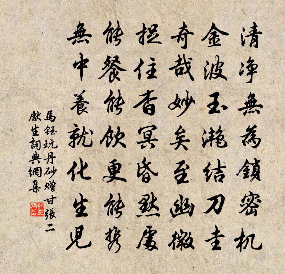 詩詞名句歷史字典書法欣賞書法字典國語詞典說文解字康熙字典古漢語字典標 題 作 者 詩 句 玩丹砂 贈甘張二先生作者:馬鈺 朝代:元代玩丹砂 贈甘張二先生原文清淨無為鎖密機。金波玉灩結刀圭。奇哉妙矣至幽微。捉住杳冥昏默處,能餐能飲更能攜。無中養就化生兒。詩詞問答問:玩丹砂 贈甘張二先生的作者是誰?答:馬鈺問:玩丹砂 贈甘張二先生寫於哪個朝代?答:元代問:玩丹砂 贈甘張二先生是什麼體裁?答:詞馬鈺玩丹砂 贈甘張二先生書法欣賞玩丹砂 贈甘張二先生書法作品詩詞推薦和山水吟趙希逢〔宋代〕七閩佳山水,秀氣鬱蒼蒼。種而為人物,事業亦叵量。我生古瀛州,地匪中州愧。雖然得文公,木舌而金口。自惟題會江驛徐清叟〔宋代〕高閣盈千盡,征人借一棲。水連天上下,山會浙東西。炊甑榮枯幻,浮雲出處齊。感時心欲醉,風雨更淒迷。和游南岩汪應辰〔宋代〕南峰不藏善,逢人說南岩。南岩亦何好,造化秘此緘。煙雲印全提,松竹色半酣。去郭十里贏,守戒僧二三。乞身宣知客歸江心釋智愚〔宋代〕風帽雲巾歷所期,問津保似到家時。曲闌半倚重楊外,潮落潮生祗自知。安西馬吳泳〔宋代〕月脅霜飛鏡夾瞳,龍媒婦盡朔庭空。沙丘尚有真驪牡,端自方皋一雇中。挽參政王公汪應辰〔宋代〕轍跡環吳蜀,艱難嘆委頻。秉鈞才數月,去國竟終身。文武才猷遠,經綸事業新。襄陽耆舊傳,寧復有斯人。探芳信吳文英〔宋代〕為春瘦。更瘦如梅花,花應知否。任枕函雲墜,離懷半中酒。雨聲樓閣春寒里,寂寞收燈後。甚年年、鬥草心期,江亭送眉州辛別駕升之(得蕪字)杜甫〔唐代〕柳影含雲幕,江波近酒壺。異方驚會面,終宴惜征途。沙晚低風蝶,天晴喜浴鳧。別離傷老大,意緒日荒蕪。古艷詩二首元稹〔唐代〕春來頻到宋家東,垂袖開懷待好風。鶯藏柳暗無人語,惟有牆花滿樹紅。深院無人草樹光,嬌鶯不語趁陰藏。等閒西遊書懷溫庭筠〔唐代〕渭川通野戍,有路上桑乾。獨鳥青天暮,驚麏赤燒殘。高秋辭故國,昨日夢長安。客意自如此,非關行路難。阮郎歸(客有舉詞者,因以其韻賦之)韓淲〔宋代〕小樓秋霽碧闌乾。中人初薄寒。霜風吹我到湖山。平林斜照殘。空闊里,有無間。牽蘿翠袖閒。籃輿興盡卻愁還。老將釋智圓〔宋代〕畫堂升降子孫扶,白髮毿毿膽尚粗。不省時清身已老,逢人猶說斬單于。江漢佚名〔先秦〕江漢浮浮,武夫滔滔。匪安匪游,淮夷來求。既出我車,既設我旟。匪安匪舒,淮夷來鋪。江漢湯湯,武夫洸洸。秋夜丘葵〔宋代〕紛紛敗葉已辭林,四顧淒涼夜色深。月伴征人驚夢枕,風搖戍婦搗衣砧。失群孤雁千山景,無數寒蟲四壁音。滿目江寺春殘寄幕中知己二首齊己〔唐代〕誰遣西來負岳雲,自由歸去竟何因。山龕薜荔應殘雪,江寺玫瑰又度春。早歲便師無學士,臨年卻作有為人。何妨扇子詩李石〔宋代〕吐火生熱風生涼,自家富貴他人忙。不為求蛇熏老鼠,翻成打鴨驚鴛鴦。偈頌一百六十首釋宗杲〔宋代〕投子下繩床,今朝為舉揚。驢前馬後漢,切忌亂承當。雜記六言五首劉克莊〔宋代〕曾何薰兮琴調,亦聞鏗爾瑟聲。愛清廟音倡嘆,嫌玉台體浮輕。隴西行謝惠連〔南北朝〕運有榮枯。道有舒屈。潛保黃裳。顯服朱黻。誰能守靜。棄華辭榮。窮谷是處。考盤是營。千金不回。百代傳名。送李按蔡之任王之奇〔宋代〕先生持使節,極力救生民。郡縣寧無弊,朝廷未有聞。某官貪可去,若事屈宜伸。更為君生說,如今可用文。名句推薦唯有門前鏡湖水,春風不改舊時波。賀知章《回鄉偶書二首》 腳踏車欲問邊,屬國過居延。王維《使至塞上》 禍之所由生也,生自纖纖也。荀子《荀子·大略》 雪似梅花,梅花似雪。呂本中《踏莎行·雪似梅花》 多情卻似總無情,唯覺樽前笑不成。杜牧《贈別》 料因循誤了,殘氈擁雪,故人心眼。張炎《解連環·孤雁》 半盞屠蘇猶未舉,燈前小草寫桃符。陸游《除夜雪》 古宮閒地少,水港小橋多。杜荀鶴《送人游吳》 不恨古人吾不見,恨古人不見吾狂耳。辛棄疾《賀新郎·甚矣吾衰矣》 八百里分麾下炙,五十弦翻塞外聲。辛棄疾《破陣子·為陳同甫賦壯詞以寄之》