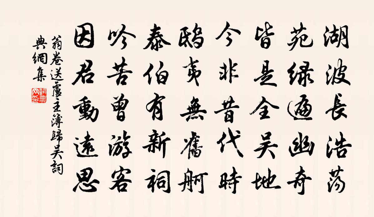 詩詞名句歷史字典書法欣賞書法字典國語詞典說文解字康熙字典古漢語字典標 題 作 者 詩 句 送盧主簿歸吳作者:翁卷 朝代:宋代送盧主簿歸吳原文湖波長浩蕩,苑綠遍幽奇。皆是全吳地,今非昔代時。鴟夷無舊舸,泰伯有新祠。吟苦曾遊客,因君動遠思。詩詞問答問:送盧主簿歸吳的作者是誰?答:翁卷問:送盧主簿歸吳寫於哪個朝代?答:宋代翁卷送盧主簿歸吳書法欣賞送盧主簿歸吳書法作品詩詞推薦仲觀有詩來謝次韻樓鑰〔宋代〕危機屢見劍頭炊,喜及掛冠神武時。從此含藏三寸舌,算來插得幾張匙。讀書窗下病勤舊,攻媿庵中老住持。速辦憶秦娥吳潛〔宋代〕嬌滴滴。嬋娟影里贈橫笛。曾橫笛。一聲腸斷,一番愁織。隔牆頻聽無訊息。龍吟海底難重覓。難重覓。梅花殘了和湯倅春雪虞儔〔宋代〕雪瑞元來竟不空,豐年訊息喜潛通。故憐梅老扶衰白,未放桃夭嫁小紅。夜動檐花猶帶雨,晴看隴麥待搖風。強顏采菱曲楊維楨〔元代〕若下清塘好,清塘勝若耶。鴛鴦飛鏡浦,鴛鴦睡銀沙。兩槳夾螳臂,雙榔交犬牙。照波還自惜,艷色似荷花。袖惹中秋夜南樓寄友人無可〔唐代〕海月出白浪,湖光射高樓。朗吟無綠酒,賤價買清秋。氣冷魚龍寂,輪高星漢幽。他鄉此夜客,對酌經多愁。治圃雜書二十首方回〔宋代〕猿鶴閒朋友,知予近況無。春遊靴露指,夜讀燭燃須。醉苦鄰僧強,飢從小僕逋。山農來賣筍,與米富青蚨。送柳淡扶侍赴洪州(此子素少宦情共予有西山之好)皎然〔唐代〕中林許師友,忽阻夙心期。自顧青緺好,來將黃鶴辭。少年輕遠涉,世道得無欺。煙雨孤舟上,晨昏千里時。離魂和周明瞻秋香五首吳芾〔宋代〕落葉初辭萬木林,誰將悲翠悄寒金。朝來散入亭前樹,著處幽香欲滿襟。和提刑郎中閱兵之什文同〔宋代〕曉營金革列周遭,大纛長牙擁帳高。虎豹用韜傳妙略,龍蛇供陣役群豪。言初撫處如蕭纊,恩盡均時若楚醪。敢謂偈頌七十六首釋師範〔宋代〕一陽來復,萬匯發生。寒谷回春,冰河解凍。遠懷二首蘇泂〔宋代〕去國三千里,書來一再行。過從應夙數,契闊更殊鄉。沙草留徐步,溪鷗傍晚涼。人間無限事,獨自有難忘。跋趙唐卿所藏訪戴圖張元乾〔宋代〕王孫胸次足丘壑,幻出山陰訪載圖。草屋柴扉閉風雨,客來空去得知無。句趙葵〔宋代〕多謝君恩好歸去,夜來小泊小孤山。題沈少府書齋皎然〔唐代〕不下南昌縣,書齋每日閒。野花當砌落,溪鳥逐人還。有興常臨水,無時不見山。千峰數可盡,不出小窗間。弟子求衣缽釋道濟〔宋代〕來時無一物,去時無一物,若要我衣缽,兩個光卵核。草亭獨坐陸游〔宋代〕掃地垂簾坐草亭,東風吹頰醉初醒。睡蛇死後魔無力,疾豎降來藥有靈。在手殘梅香淡泊,傍檐幽鳥語丁寧。老人春日秦國懷古周朴〔唐代〕荒郊一望欲消魂,涇水縈紆傍遠村。牛馬放多春草盡,原田耕破古碑存。雲和積雪蒼山晚,煙伴殘陽綠樹昏。數里送沈沅陵趙蕃〔宋代〕世官花古所譏,花世祿今不花。要之苟有人,二者非苦背。君祖我曾祖,紹聖同廷對。素風我莫嗣,清德君可輩。題集山橋游冠卿〔宋代〕南橋頹廢長官羞,新作川梁代濟舟。上應星文橫北極,下飛虹影落中流。慚無子產乘輿惠,謾絕襄公茀道憂。路接關中言懷黃滔〔唐代〕三秦五嶺意,不得不依然。跡寓枯槐曲,業蕪芳草川。花當落第眼,雨暗出城天。層閣浮雲外,何人動管弦。名句推薦木從繩則正,後從諫則聖。佚名《尚書·商書·說命上》 遠夢歸侵曉,家書到隔年。杜牧《旅宿》 握手一長嘆,淚為生別滋蘇武《留別妻》 馬先馴而後求良,人先信而後求能。劉安及其門客《淮南子·說林訓》 舉物而暗,無務博聞。墨子《墨子·02章 修身》 木與木相摩則然,金與火相守則流莊子《莊子·雜篇·外物》 愛之欲其生,惡之欲其死。釋原妙《偈頌六十七首》 林中有奇鳥,自言是鳳凰。阮籍《詠懷八十二首·其七十九》 惟天地萬物父母,惟人萬物之靈。佚名《尚書·周書·泰誓》 明年豈無年,心事恐蹉跎。蘇軾《守歲》