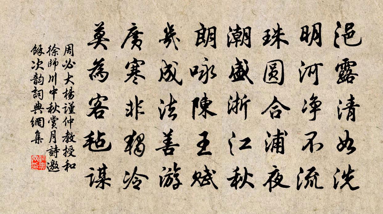 詩詞名句歷史字典書法欣賞書法字典國語詞典說文解字康熙字典古漢語字典標 題 作 者 詩 句 楊謹仲教授和徐師川中秋賞月詩邀余次韻作者:周必大 朝代:宋代原文浥露清如洗,明河淨不流。珠圓合浦夜,潮盛浙江秋。朗詠陳王賦,幾成法善游。廣寒非獨冷,莫為客氈謀。詩詞問答問:《楊謹仲教授和徐師川中秋賞月詩邀余次韻》的作者是誰?答:周必大問:該詩寫於哪個朝代?答:宋代書法欣賞楊謹仲教授和徐師川中秋賞月詩邀余次韻書法作品詩詞推薦詩品二十四則。勁健司空圖〔唐代〕行神如空,行氣如虹。巫峽千尋,走雲連風。飲真茹強,蓄素守中。喻彼行健,是謂存雄。天地與立,神化攸同。虞美人陳允平〔宋代〕彩雲別後房櫳悄。愁立西風曉。倚闌無語對黃花。惆悵玉郎應在、楚江涯。鈿箏空貯芳塵滿。寂寞朱弦斷。夜來一清明日送韋侍御貶虔州白居易〔唐代〕寂寞清明日,蕭條司馬家。留餳和冷粥,出火煮新茶。欲別能無酒,相留亦有花。南遷更何處?此地已天涯。十蟲吟舒岳祥〔宋代〕蟲有蛀地牛,曲吻利如鉤。趯取尾作首,倒行腹為頭。燥土作陷沙,露喙伺其幽。小蟲誤過之,一入出無由。小兒沁園春(送趙江陵東歸,再用前韻)辛棄疾〔宋代〕佇立瀟湘,黃鵠高飛,望君不來。被東風吹墮,西江對語,急呼斗酒,旋拂征埃。卻怪英姿,有如君者,猶欠封侯己卯歲除文天祥〔宋代〕歲除破衣裳,夜半刺針線。遊子長夜思,佳人不可見。草枯稚驢吼,燈暗飢鼠現。深室閉星斗,輕裘臥風霰。大化水調歌頭(將遷新居不成有感戲作。時以病止酒,且遺去者。末□及之)辛棄疾〔宋代〕我亦卜居者,歲晚望三閭。昂昂千里,泛泛不作水中鳧。好在書攜一束,莫問家徒四壁,往日置錐無。借車載家具公邁何遄曾豐〔宋代〕公之東矣,蜀人是戀,潭人是羨。詔予油幢,亟哉往殿。列城既傾,列騎既迎。日裴月徊,倘其未行。潭人曰噢,玉樓春尹詞客〔宋代〕浣花溪上風光主。燕集瀛洲開幕府。商岩本是作霖人,也使閒花沾雨露。誰憐氏族傳簪組。狂跡偶為風月誤。願教呈吳門王治中元俞都中參政伯大孫先人同榜方回〔宋代〕君家兩參預,漢代韋平民。留耕而耕存,惟有是以似。乃祖忠文公,補天扶國是。乃父敬愍侯,浮海將使指。直諫送喻舜舉歸壽乃翁七十林景熙〔宋代〕聞君有奇氣,千岩在胸中。歲晚攜甘旨,歸以獻乃翁。乃翁松柏姿,深村侶樵農。風塵了不識,七十顏如童。舉桉大劍送別劉右史盧照鄰〔唐代〕金碧禺山遠,關梁蜀道難。相逢屬晚歲,相送動征鞍。地咽綿川冷,雲凝劍閣寒。倘遇忠孝所,為道憶長安。雜劇·包待制智斬魯齋郎關漢卿〔元代〕楔子(沖末扮魯齋郎引張龍上,詩云)花花太歲為第一,浪子喪門再沒雙。街市小民聞吾怕,則我是權豪勢要魯齋拾翠羽張孝祥〔宋代〕春入園林,花信總諸遲速。聽鳴禽、稍遷喬木。夭桃弄色,海棠芬馥。風雨霽,芳徑草心頻綠。禊事才過,相次禁浣溪沙(為王參議壽)趙長卿〔宋代〕密葉陰陰翠幄深。梅黃弄雨正頻頻。榴花照眼一枝新。緱嶺有人今毓粹,飛鳧不日簉嚴宸。一尊敬壽太夫人。酬李處士山中見贈儲光羲〔唐代〕厥初游太學,相與極周旋。含采共朝暮,知言同古先。孟陽題劍閣,子云獻甘泉。斯須曠千里,婉娩將十年。今來寄題西湖並送淨慈顯老三絕范成大〔宋代〕中秋月了又黃花,卯後新醅午後茶。別沒工夫譚不二,文殊休更問毗耶。清心堂為余宰題程應申〔宋代〕靈台元自與天通,一點塵飛失太空。六鑿爾時俱偃息,八窗何處不玲瓏。公田有秫猶難色,暮夜無金即直躬。要識新豐折臂翁-戒邊功也白居易〔唐代〕新豐老翁八十八,頭鬢眉須皆似雪。玄孫扶向店前行,左臂憑肩右臂折。問翁臂折來幾年,兼問致折何因緣。翁雲塞翁吟仇遠〔宋代〕風柳吹殘醉,推枕夢便難尋。小院靜,曲屏深。翦不斷輕陰。新蠶乍掃鵝毛細,縴手鏤葉如針。又負了,賞花心。名句推薦四月十七,正是去年今日,別君時。韋莊《女冠子·四月十七》 曲則全,枉則直,窪則盈,敝則新,少則得,多則惑。老子《老子·道經·第二十二章》 群燕辭歸鵠南翔,念君客游多斷腸。曹丕《燕歌行》 小雨纖纖風細細,萬家楊柳青煙里。朱服《漁家傲·小雨纖纖風細細》 數聲風笛離亭晚,君向瀟湘我向秦。鄭谷《淮上與友人別》 梨花淡白柳深青,柳絮飛時花滿城。蘇軾《東欄梨花》 酌酒以自寬,舉杯斷絕歌路難。鮑照《擬行路難·其四》 垂柳覆金堤,蘼蕪葉復齊。薛道衡《昔昔鹽》 豆蔻連梢煎熟水,莫分茶。李清照《攤破浣溪沙·病起蕭蕭兩鬢華》 歲華向晚愁思,誰念玉關人老?蔡挺《喜遷鶯·霜天秋曉》
