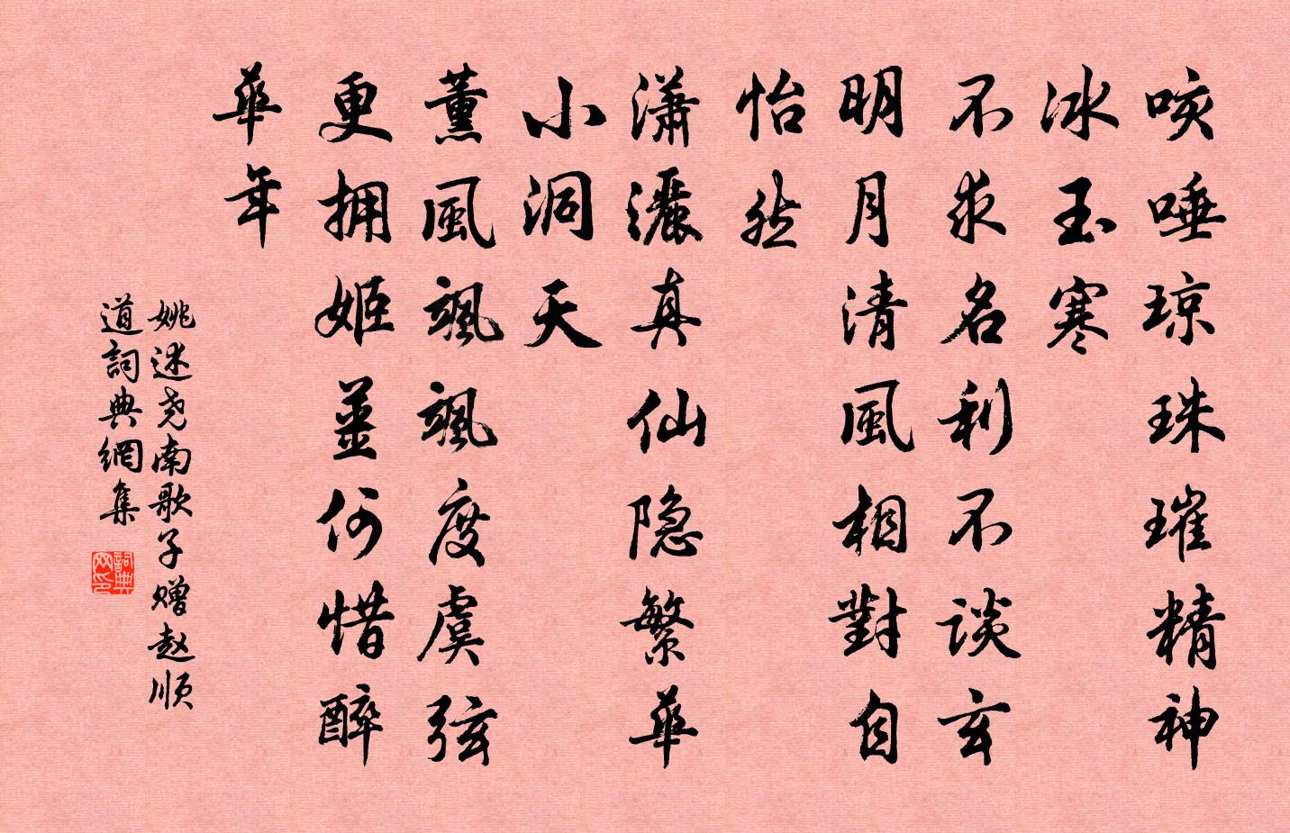詩詞名句歷史字典書法欣賞書法字典國語詞典說文解字康熙字典古漢語字典標 題 作 者 詩 句 南歌子(贈趙順道)作者:姚述堯 朝代:宋代南歌子(贈趙順道)原文咳唾瓊珠璀,精神冰玉寒。不求名利不談玄。明月清風相對、自怡然。瀟灑真仙隱,繁華小洞天。薰風颯颯度虞弦。更擁姬姜何惜、醉華年。詩詞問答問:南歌子(贈趙順道)的作者是誰?答:姚述堯問:南歌子(贈趙順道)寫於哪個朝代?答:宋代問:南歌子(贈趙順道)是什麼體裁?答:詞姚述堯南歌子(贈趙順道)書法欣賞南歌子(贈趙順道)書法作品詩詞推薦用鍾侍郎韻贈懶谷洪咨夔〔宋代〕 * 竹几妙高台,瞑坐何能放眼開。門外白雲多事在,又將飛雨出山來。句祝文〔宋代〕季鷹滿眼杯傾淥,魯望長吟鬢欲斑。悼劉仲遠趙蕃〔宋代〕朝共阿戎飯,暮同烏戍舟。新詩蒙惠好,顧我闕賡酬。化鶴驚何往,觀魚事已休。音容無日見,巾屨想神遊。宮詞宋白〔宋代〕東宮鸞鳳卦中飛,花燭熒煌夜納妃。明日龍樓歌舞罷,門前掃聚碎珠璣。減蘭十梅(早)李子正〔宋代〕陽和初布。入萼春紅才半露。暖律潛催。與占百花頭上開。香英微吐。折贈一枝人已去。楊柳貪眠。不道春風已暗竹溪直院盛稱起予草堂詩之善暇日覽之多有可劉克莊〔宋代〕偶弄閒花久,春濃晚露晞。是誰設香供,終日滿人衣。戲把繁枝玩,常愁一片飛。疑薰沉水過,似惹御壚歸。若愛送柯祕書三子歸泉應詔蔡襄〔宋代〕祕書昔共官臨漳,時呼三子侍側傍。修瞳闊顙善應對,舉措不類群兒行。遙知成就在他日,爾時迄今十載強。閩州武岡葉使君寄詩次韻二首劉克莊〔宋代〕詞客紛紛載後車,誰能遠寄病相如。雙旌已拜湖南牧,尺素猶題嶺外書。詩句騎驢游蜀後,情懷賦鵩吊湘餘。似聞滿江紅張孝祥〔宋代〕秋滿漓源,瘴雲淨、曉山如簇。動遠思、空江小艇,高丘喬木。策策西風雙鬢底,暉暉斜日朱欄曲。試側身、回首臨江仙·探梅辛棄疾〔宋代〕老去惜花心已懶,愛梅猶繞江村。一枝先破玉溪春。更無花態度,全有雪精神。剩向空山餐秀色,為渠著句清新。群玉山董居誼〔宋代〕經台石磴郁深幽,曲折中藏自一邱。鑿破藩籬都是路,從今任是泳人游。洛陽感寓張祜〔唐代〕擾擾都城曉四開,不關名利也塵埃。千門甲第身遙入,萬里銘旌死後來。洛水暮煙橫莽蒼,邙山秋日露崔嵬。須知和答詩十首。和松樹白居易〔唐代〕亭亭山上松,一一生朝陽。森聳上參天,柯條百尺長。漠漠塵中槐,兩兩夾康莊。婆娑低覆地,枝幹亦尋常。八月題武陵洞五首曹唐〔唐代〕此生終使此身閒,不是春時且要還。寄語桃花與流水,莫辭相送到人間。溪口回舟日已昏,卻聽雞犬隔前村。殷勤四月二十九日早起行園方回〔宋代〕白髮蕭蕭一禿翁,披襟扶杖早涼中。偶因不飲全無寐,自笑能詩例得窮。梅雨園林江橘綠,竹風庭院海榴紅。若非相和歌辭烏夜啼李群玉〔唐代〕曾波隔夢渚,一望青楓林。有烏在其間,達曉自悲吟。是時月黑天,四野煙雨深。如聞生離哭,其聲痛人心。悄悄送徐靈淵永州司量翁卷〔宋代〕君向零陵日,分攜又雪天。地遙行幾郡,官小度三年。蘭芷芳條潔,瀟湘翠色連。從來苦吟思,歸賦若多篇。明月篇蒲壽宬〔宋代〕海賈不愛死,適值驪龍眠。深淵頃刻命,平地千丈川。丈夫豈無志,固為兒女煎。彼美頭上粲,它人口中涎。鮫人句嚴中和〔宋代〕潤水活不凍,山楓老自靈。次韻蒲左丞游虎丘十首朱長文〔唐代〕層巒稍稍暮雲歸,喬木森森眾鳥依。再踏石花尋去路,畫船十隻帶斜暉。名句推薦孰知不向邊庭苦,縱死猶聞俠骨香。王維《少年行四首》 衣貴潔,不貴華。上循分,下稱家。李毓秀《弟子規·謹》 改章難於造篇,易字艱於代句劉勰《文心雕龍·附會》 智欲圓而行欲方,膽欲大而心欲小。程登吉《幼學瓊林·卷三·人事》 春未來時,酒攜不到千岩路。吳文英《點絳唇·越山見梅》 有鳥鷙立,羽翼張。柳宗元《唐鐃歌鼓吹曲十二首·其四》 春田龜坼苗不滋,猶賴立春三日雪。王士禎《春不雨》 中心愿,平虜保民安國。宋江《滿江紅·喜遇重陽》 夫寵而不驕,驕而能降,降而不憾,憾而能珍者鮮矣。左丘明《左傳·隱公·隱公三年》 尊前故人如在,想念我、最關情。周邦彥《綺寮怨·上馬人扶殘醉》