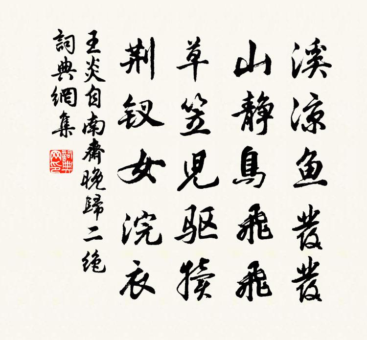 詩詞名句歷史字典書法欣賞書法字典國語詞典說文解字康熙字典古漢語字典標 題 作 者 詩 句 自南齋晚歸二絕作者:王炎 朝代:宋代自南齋晚歸二絕原文溪涼魚發發,山靜鳥飛飛。草笠兒驅犢,荊釵女浣衣。詩詞問答問:自南齋晚歸二絕的作者是誰?答:王炎問:自南齋晚歸二絕寫於哪個朝代?答:宋代王炎自南齋晚歸二絕書法欣賞自南齋晚歸二絕書法作品詩詞推薦甲午秋作四壁絕題窗間劉宰〔宋代〕驛使掛來郡吏批,丁寧急急趁符移。兒童駭汗催科急,趣賀元來荷聖慈。送韋員外還京崔峒〔唐代〕十年離亂後,此去若為情。春晚香山綠,人稀豫水清。野陂看獨樹,關路逐殘鶯。前殿朝明主,應憐白髮生。持節和王樞密三首曹勛〔宋代〕稍陪酬唱與榮觀,聲並琳琅和八鑾。可但文華迎日麗,自然符采照人寒。笑談殊喜親犀麈,接侍終慚戴鶡冠。公等行香子(壽鄧宰母·二月初五)傅大詢〔宋代〕玉佩簪纓。羅襪生塵。問何時、來到湘濱。堯蓂五葉,二月陽春。一霎時風,一霎時雨,一霎時晴。有子鳴琴。有送史同叔赴宮教釋寶曇〔宋代〕便催絳帳入王扉,肯落先公第二機。一鶚未嘗憑薦口,諸生今始識摳衣。寬如北海何妨醉,清似西湖不解肥。但得過忠州酆都觀袁說友〔宋代〕古柏修篁萬木顛,盤山百折叩真仙。便疑腳踏如來地,已覺身游洞府天。空翠遐觀浮海日,偃雲時汲濯纓泉。我來初六日絕湖趙蕃〔宋代〕政爾喧豗浪如屋,忽焉熨帖紋如縠。大船雙櫓鳴鸛鵝,小艇孤橈亂鳧鶩。金沙粲粲列宿明,君山宛宛修眉綠。囊無如夢令劉辰翁〔宋代〕寂歷柳風斜倚。錯莫夢雲難記。花影為誰重,一握鮫人絲淚。何事。何事。歷歷臉潮羞起。和溫仲舒感懷四錫〔宋代〕郡齋松蓋翠斜欹,客到鳴琴凡酒巵。江上正當搖落景,天涯空惜太平時。雪殘幽谷春難到,蘭茂深林眾豈知。上國春日雪酬潘孟陽回文權德輿〔唐代〕酒杯春醉好,飛雪晚庭閒。久憶同前賞,中林對遠山。荔枝二首徐夤〔唐代〕朱彈星丸粲日光,綠瓊枝散小香囊。龍綃殼綻紅紋粟,魚目珠涵白膜漿。梅熟已過南嶺雨,橘酸空待洞庭霜。蠻山和孫廷平坦嵩山十首漁舟火韓維〔宋代〕拖網潭上歸,孤煙出峰背。稍沒寒霧中,微明秋雨外。起我江湖心,鱸魚方可膾。用一代不數人百年能幾見為韻詩賦十章呈陳君趙蕃〔宋代〕流傳昔多聞,邂逅今既見。顧我何足收,期公示深眷。玉麟堂會諸司觀牡丹酴醾三絕范成大〔宋代〕洛園姚魏碧雲愁,風物江東亦上游。憶起遨頭八年夢,彭州花檻滿西樓。禪人並化主寫真求贊釋正覺〔宋代〕鼻直口闊,目深眉低。燈連少室,派接曹溪。恰恰混不得,堂堂類不齊。把手共語,出力相攜。春風浩浩,秋風淒普通禪寺釋德惠〔宋代〕古寺何年有,巍峨入杳冥。水如僧眼碧,山作佛頭青。瓦礫皆能說,虛空亦解聽。道人心已死,窗下卷殘經。問訊十月中浣酒熟客至分韻得菊字方回〔宋代〕亂離脫此生,真復類殘菊。嚴霜百草死,愧我一影獨。鄉鄰豪奪兒,豈不金滿屋。或乃盜賊起,全家被屠戮。賈禍題西湖山岩二首林票〔宋代〕坐從對高舂放衙,舂米和石也穿芽。鷗邊雲闊三千頃,樹杪煙橫數萬家。貯月未圓松瑣碎,怯風無力竹欹斜。叮嚀無夢令馬鈺〔元代〕潑殺無明業火。保守爐中水火。固養本根源,決要水中生火。生火。生火。便是山侗真火。珊瑚花郭印〔宋代〕彼美珊瑚樹,扶疏著絳英。佳名為世重,貴相亦天生。日裡顏尤耐,人來眼目明。貧家還有此,玉石謾夸爭。名句推薦一事真,百事真。馮夢龍《醒世恆言·卷十六》 春江潮水連海平,海上明月共潮生。張若虛《春江花月夜》 流年莫虛擲,華發不相容。方乾《送從兄郜 / 韋郜 / 途中別孫璐》 一時寵利有盡,千秋青史難欺。張廷玉《明史·列傳·卷一百三十三》 謾道愁須殢酒,酒未醒、愁已先回秦觀《滿庭芳·碧水驚秋》 教小兒宜嚴,嚴氣足以平躁氣王永彬《圍爐夜話·第八則》 小山重疊金明滅,鬢雲欲度香腮雪。溫庭筠《菩薩蠻·小山重疊金明滅》 柳外輕雷池上雨,雨聲滴碎荷聲。小樓西角斷虹明。歐陽修《臨江仙·柳外輕雷池上雨》 終然獨不見,流淚空自知。李白《獨不見》 疲馬山中愁日晚,孤舟江上畏春寒。張謂《杜侍御送貢物戲贈》