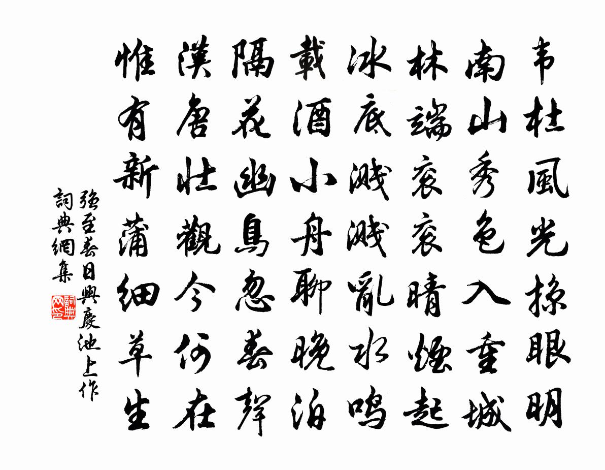 詩詞名句歷史字典書法欣賞書法字典國語詞典說文解字康熙字典古漢語字典標 題 作 者 詩 句 春日興慶池上作作者:強至 朝代:宋代春日興慶池上作原文韋杜風光掠眼明,南山秀色入重城。林端袞袞晴煙起,冰底濺濺亂水鳴。載酒小舟聊晚泊,隔花幽鳥忽春聲。漢唐壯觀今何在,惟有新蒲細草生。詩詞問答問:春日興慶池上作的作者是誰?答:強至問:春日興慶池上作寫於哪個朝代?答:宋代強至春日興慶池上作書法欣賞春日興慶池上作書法作品詩詞推薦雜興盧仝〔唐代〕意智未成百不解,見人富貴亦心愛。等閒對酒呼三達,屠羊殺牛皆自在。放心為樂笙歌攢,壯氣激作風霜寒。廚中積雨寫懷陳普〔宋代〕識道知時乃聖賢,合人統物一之天。兩間惟有心長在,萬變鹹歸理自然。王屋大行從艮止,北溟南海謹坤先。行藏一翦梅(聞箜篌)韓淲〔宋代〕縹渺神仙雲霧窗。說與蘇州,未斷人腸。帶湖煙月墮蒼茫。喚醒嫦娥,春筍纖長。馬上琵琶半額妝。撥盡相思,十錢塘江上楊蟠〔宋代〕一氣連江色,寥寥萬古清。客心兼浪涌,時事與潮生。路轉青山出,沙空白鳥行。幾年滄海夢,吟罷獨含情。送朝邑張明府(此公善琴)盧綸〔唐代〕千室暮山西,浮雲與樹齊。剖辭雲落紙,擁吏雪成泥。野火蘆千頃,河田水萬畦。不知琴月夜,誰得聽烏啼。和將志父春風亭韻李曾伯〔宋代〕不須舉扇障西風,且付黃花一笑中。漸喜盧{皴去皮加兔}成兩斃,仍愁蜂蟻起群雄。未能長策轅從北,果有真儒奉和示內人詩庾信〔南北朝〕燃香鬱金屋。吹管鳳凰台。春朝迎雨去。秋夜隔河來。聽歌雲即斷。聞琴鶴倒回。春窗刻鳳下。寒壁畫花開。定取偶見官舍梅花作劉翼〔宋代〕對坐茶甌日兩回,胸懷真率向人開。茶甌對客如前度,不見先生杖屨來。次程斗山村居韻十首楊公遠〔宋代〕茅結兩閒月,白雲分半間。利名俱拚舍,雲月共清閒。來轍元無俗,論交賴有山。謝渠樑上燕,社後又飛還。寄關彥長鄭獬〔宋代〕黃金斗印未垂腰,繞舍湖山弄翠濤。飢鳳羽毛寒不鎩,臥龍頭角老方高。樽前襟抱生平盡,醉里文章氣格豪。休論桃源憶故人 思遼陽高巨才馬鈺〔元代〕桃源憶故人歸去。別後常懷無緒。未審官游何處。忘了當初遇。我今物外修行做。但願他家開悟。猛棄榮華貴富。路傍堠(以下四篇並元和十四年出為潮州作)韓愈〔唐代〕堆堆路傍堠,一雙復一隻。迎我出秦關,送我入楚澤。千以高山遮,萬以遠水隔。吾君勤聽治,照與日月敵。臣愚和夾谷書隱先生寄題蛟峰石峽書院三十韻何夢桂〔宋代〕堪輿運玄化,萬物品彙分。狉狉鹿豕群,中吸五色麟。聖哲不出世,郊囿可能馴。粵從光岳分,鴻靈鹹糾紛。征役江城子劉秉忠〔元代〕松蒼竹翠歲寒天。雁山前。鳳城邊。回首燕南,一別又三年。長愛故人心似月,人不見,月還圓。小窗寂寂鎖凝煙南嶽路口懷胡氏兄弟項安世〔宋代〕奕奕神山照遠天,美人家在此山前。待儂了卻公家事,來借書堂十日眠。月夜憶舍弟杜甫〔唐代〕戍鼓斷人行,邊秋一雁聲。(邊秋 一作:秋邊)露從今夜白,月是故鄉明。有弟皆分散,無家問死生。寄書長不書懷胡仲弓〔宋代〕貧居無外事,圖得念頭情。冷眼觀時政,平心閱世情。好花臨水種,瘦竹傍牆生。自足供幽致,何須隱姓名。自閔陸游〔宋代〕破帽羸驂厭垢氛,掛冠歸伴故溪雲。年光疾病占強半,日景睡眠居七分。廬冢蕭條頻霣涕,交朋零落久離群。殘年失調名佚名〔宋代〕恐伊不信是龍頭,和書寄與三題草。暑退病起沐罷倦臥得芸叟詩招為草堂紫閣之游李復〔宋代〕八月秋高肺病蘇,深居吾亦愛吾廬。晚風剡剡初衣裌,白髮蕭蕭不滿梳。困著藜床眠北牖,遠飛蝶夢訪清都。覺來名句推薦我當二十不得意,一心愁謝如枯蘭。李賀《開愁歌》 江水漾西風,江花脫晚紅。王安石《江上》 烽火平安夜,歸夢到家山。崔與之《水調歌頭·題劍閣》 運退黃金失色,時來鐵也生光。馮夢龍《醒世恆言·卷三》 秋靜見旄頭,沙遠席羈愁李賀《塞下曲》 花徑不曾緣客掃,蓬門今始為君開。杜甫《客至》 心多過慮,何異杞人憂天;事不量力,不殊夸父追日。程登吉《幼學瓊林·卷一·天文》 千尋鐵鎖沉江底,一片降幡出石頭。劉禹錫《西塞山懷古》 酷暑天,葵榴發,噴鼻香十里荷花。白樸《得勝樂·夏》 半夜呼兒趁曉耕,羸牛無力漸艱行。顏仁郁《農家》