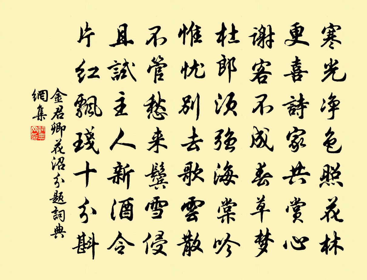 詩詞名句歷史字典書法欣賞書法字典國語詞典說文解字康熙字典古漢語字典標 題 作 者 詩 句 花沼分題作者:金君卿 朝代:宋代花沼分題原文寒光淨色照花林,更喜詩家共賞心。謝客不成春草夢,杜郎須強海棠吟。惟憂別去歌雲散,不管愁來鬢雪侵。且試主人新酒令,片紅飄琖十分斟。詩詞問答問:花沼分題的作者是誰?答:金君卿問:花沼分題寫於哪個朝代?答:宋代金君卿花沼分題書法欣賞花沼分題書法作品詩詞推薦沖虛宮陸游〔宋代〕林館松門白晝扃,驂鸞人去已千齡。基存舊宅樓台古,地有遺丹草木靈。滿洞曉雲春釀雨,一池秋水夜涵星。 * 酹江月(武昌懷古)葛長庚〔宋代〕漢江北瀉,下長淮、洗盡胸中今古。樓櫓橫波征雁遠,誰見魚龍夜舞。鸚鵡洲雲,鳳凰池月,付與沙頭鷺。功名何歲晏晁公溯〔宋代〕歲晏天益寒,短景殊未長。曉日出愈遲,翳翳迷扶桑。微陽不破霧,仿佛光有芒。開門視屋瓦,北風吹朝霜。起坐水調歌頭李處全〔宋代〕明月浸瑤碧,河漢水交流。偏來照我,知我白髮不勝愁。客里山中三載,枕上人間一夢,曾憶到瀛洲。矯首蓬壺路巴東寒食寇準〔宋代〕春雨蕭蕭寒食天,遠行猶在楚江邊。人思故國迷殘照,鳥隔深花語斷煙。薄宦未能酬壯節,良時空自感流年。因循南樓陸游〔宋代〕十年不把武昌酒,此日闌邊感慨深。舟楫紛紛南復北,山川莽莽古猶今。登臨壯士興懷地,忠義孤臣許國心。倚杖出山吟白居易〔唐代〕朝詠遊仙詩,暮歌採薇曲。臥雲坐白石,山中十五宿。行隨出洞水,回別緣岩竹。早晚重來游,心期瑤草綠。頌證道歌證道歌釋印肅〔宋代〕病遇醫王爭得瘥,盧醫體貌殊嚴怪。我見堂堂心膽驚,不領仙丹從此壞。行歌四首周文璞〔宋代〕先秦古書世已稀,國風雅頌聲又微。彼美人兮在天路,馬蜷局兮將安歸。古人所懷已汩汩,今人所懷又忽忽。我亦九張機佚名〔宋代〕一張機。採桑陌上試春衣。風晴日暖慵無力。桃花枝上,啼鶯言語,不肯放人歸。梅花劉克莊〔宋代〕小園風月不多寬,一樹梅花開未殘。剝啄敲門嫌特地,緩拖藤杖隔籬看。書韓隱人壁趙湘〔唐代〕雨黑徑垂莎,全家在薜蘿。樹高穿井出,門掩燒痕過。寫易澌生硯,懸壺月上柯。近來山屐老,枯齒旅無多。題劉正之所得綿州摹本畫鷹趙蕃〔宋代〕姿態何雄傑,盤拿更崛奇。曾聞左綿畫,舊熟少陵詩。說似殊方寄,還容老眼窺。君手速收卷,燕雀恐驚疑。偈頌一百一十七首釋紹曇〔宋代〕六月苦炎熱,蠟人何似生。火雲烹得解,解後卻完全。堪笑雲門老,杲制風顛,通身臭汗。微涼生殿閣,打失鬼精家園即事十三首鄭清之〔宋代〕綠陰樂靜未號蟬,藕葉扶嬌泛水眠。輸殺蜂屯深閉壁,峙糧宿飽蜜中邊。壽昌元夕建醮陳杰〔宋代〕爐穟無風直,燈蓮有月嬌。我常占樂歲,人自看元宵。印信烽煙息,光輝玉燭調。平生笑徼福,今夕為民徼。戎州汪元量〔宋代〕害馬勞人事已灰,長安無復使臣來。滿園蓊蔚千千樹,儘是楊妃死後栽。孤山桃花二首周文璞〔宋代〕天上仙人休擲火,塵中道士莫燒香。可憐絳雪渾無賴,一簇千枝對草堂。金人捧露盤(水仙花)高觀國〔宋代〕夢湘雲,吟湘月,吊湘靈。有誰見、羅襪塵生。凌波步弱,背人羞整六銖輕。娉娉裊裊,暈嬌黃、玉色輕明。香心讀易象周敦頤〔宋代〕書房兀坐萬機休,日暖風和草色幽。誰道二千年遠事,而今只在眼前頭。名句推薦又是春將暮,無語對斜陽。葛長庚《水調歌頭·江上春山遠》 歸雲一去無蹤跡,何處是前期?柳永《少年游·長安古道馬遲遲》 倍道而妄行,則天不能使之吉。荀子《荀子·天論》 試澆橋下水,今夕到湘中。陳與義《臨江仙·高詠楚詞酬午日》 小立紅橋柳半垂,越羅裙颺縷金衣。納蘭性德《山花子·小立紅橋柳半垂》 為地戰者不能成王,為祿仕者不能成政劉向《說苑·君道》 衙齋臥聽蕭蕭竹,疑是民間疾苦聲。鄭燮《濰縣署中畫竹呈年伯包大中丞括 / 墨竹圖題詩》 相思相見知何日?此時此夜難為情!李白《三五七言 / 秋風詞》 宮衣亦有名,端午被恩榮。杜甫《端午日賜衣》 輦轂繁華事可傷,師師垂老過湖湘劉子翬《汴京紀事》