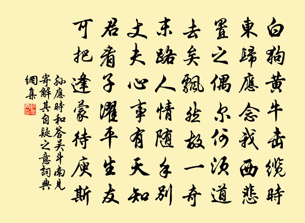 詩詞名句歷史字典書法欣賞書法字典國語詞典說文解字康熙字典古漢語字典標 題 作 者 詩 句 和答吳斗南見寄解其自疑之意作者:孫應時 朝代:宋代原文白狗黃牛擊纜時,東歸應念我西悲。置之偶爾何須道,去矣飄然故一奇。末路人情隨手別,丈夫心事有天知。君看子濯平生友,可把逢蒙待庾斯。詩詞問答問:《和答吳斗南見寄解其自疑之意》的作者是誰?答:孫應時問:該詩寫於哪個朝代?答:宋代書法欣賞和答吳斗南見寄解其自疑之意書法作品詩詞推薦臥治齋夜坐楊萬里〔宋代〕今年一雪遍江淮,半月晴光凍不開。孤坐郡齋人寂寂,一枝紅燭兩瓶梅。李參政生日魏了翁〔宋代〕天馬流行不見痕,黃鐘吹簽煦乾坤。坎離互處靈根峙,剝復機中碩果存。金剛隨機無盡頌一體同觀分第十八釋印肅〔宋代〕室內千燈晃,佛有何形狀。如淨琉璃中,內現真金相。鏡湖夜泊有懷(東晉太守馬臻所築)李頻〔唐代〕廣水遙堤利物功,因思太守惠無窮。自從版築興農隙,長與耕耘致歲豐。漲接星津流蕩漾,寬浮雲岫動虛空。想當端午五言三首劉克莊〔宋代〕雜遝今觀渡,依稀昔浴沂。居人空巷出,幾個詠而歸。句羅椿〔宋代〕露濕看花腳,鶯啼欲曉山。句諶祜〔宋代〕花柳晴光新態度,江湖春夢老英雄。樵趙友直〔宋代〕踏破芒鞋力已疲,朝還礪斧採薪兒。雲深迷卻山頭路,戴笠回來雨濕衣。華亭十詠陵機宅唐詢〔宋代〕舊諜傅遺趾,悠然歷祀深。人無令威至,門異下邽箴。谷水當年溜,崑山昔日陰。魯堂那復見,絲竹若為尋。與林大夫謝靈壽杖韓維〔宋代〕萬歲山中美木成,古今靈壽得嘉名。龍鱗未測他年化,蝸角先從每節生。禪擬問來須便打,醉思吟後不妨行。使君客懷陸游〔宋代〕客懷耿耿向誰語,世事茫茫空自知。堅坐嬾窮牛渚怪,倦遊何恨雁門踦。眼前客共一杯酒,身後人傳千首詩。報與挽恭靖司法兄九首劉宰〔宋代〕踏遍山崖與水邊,要教皇澤下氓編。祗今桐汭民猶活,問訊南昌尉已仙。春江花月夜張若虛〔唐代〕春江潮水連海平,海上明月共潮生。灩灩隨波千萬里,何處春江無月明?江流宛轉繞芳甸,月照花林皆似霰。空里使東川夜深行元稹〔唐代〕夜深猶自繞江行,震地江聲似鼓聲。漸見戍樓疑近驛,百牢關吏火前迎。段宥廳孤桐王昌齡〔唐代〕鳳凰所宿處,月映孤桐寒。槁葉零落盡,空柯蒼翠殘。虛心誰能見,直影非無端。響發調尚苦,清商勞一彈。宿青綏鋪童蒙〔宋代〕跋涉千千里,我行亦良勤。戒途桂林臘,解轡盱水春。赤石照病眼,紅泉濯征塵。 * 顧我笑,問別何所因。憶昨偈頌二十一首釋普寧〔宋代〕七佛引其膠,維摩接其後。一盲引眾盲,至今不唧{左口右留}。遊園葉茵〔宋代〕碧琅玕裹幾亭台,萬朵芙蕖照水開。可醉可吟尤可臥,主人無暇客長來。題翠岩丈室舒坦〔宋代〕別移寶所出埃塵,無限金光欲照人。斤斧不驚龍象伏,棟樑特地水雲新。千峰坐斷人間路,一榻分來月裹身。更著酬李紺歲除送酒雍陶〔唐代〕歲盡貧生事事須,就中深恨酒錢無。故人充壽能分送,遠客消愁免自沽。一夜四乘傾鑿落,五更三點把屠蘇。已供名句推薦天秋木葉下,月冷莎雞悲。李白《秋思》 芳菊開林耀,青松冠岩列。陶淵明《和郭主簿·其二》 不是花中偏愛菊,此花開盡更無花。元稹《菊花》 紅酥手,黃縢酒,滿城春色宮牆柳。陸游《釵頭鳳·紅酥手》 箭在弦上,不得不發羅貫中《三國演義·第三十二回》 睡起莞然成獨笑,數聲漁笛在滄浪。蔡確《夏日登車蓋亭》 數點雨聲風約住,朦朧淡月雲來去李冠《蝶戀花·春暮》 誰念遷客歸來,老大傷名節。李綱《六么令·次韻和賀方回金陵懷古鄱陽席上作》 將軍角弓不得控,都護鐵衣冷難著。岑參《白雪歌送武判官歸京》 驚沙獵獵風成陣,白雁一聲霜有信。元好問《玉樓春·驚沙獵獵風成陣》