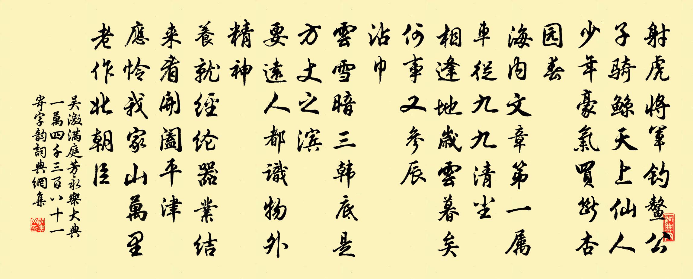 詩詞名句歷史字典書法欣賞書法字典國語詞典說文解字康熙字典古漢語字典標 題 作 者 詩 句 滿庭芳 永樂大典一萬四千三百八十一寄字韻作者:吳激 朝代:金代原文射虎將軍,釣鰲公子,騎鯨天上仙人。少年豪氣,買斷杏園春。海內文章第一,屬車從、九九清塵。相逢地,歲雲暮矣,何事又參辰。沾巾。雲雪暗,三韓底是,方丈之濱。要遠人都識,物外精神。養就經綸器業,結來看、開闔平津。應憐我,家山萬里,老作北朝臣。詩詞問答問:《滿庭芳 永樂大典一萬四千三百八十一寄字韻》的作者是誰?答:吳激問:該詩寫於哪個朝代?答:金代問:該詩是什麼體裁?答:詞書法欣賞滿庭芳 永樂大典一萬四千三百八十一寄字韻書法作品詩詞推薦和劉建昌除夕有欠我飲屠蘇之句姜特立〔宋代〕閒愁客底費驅除,可復先生得自娛。商陸火添人獨坐,沉檀香冷歲還徂。望家年甲那堪數,祭酒詩神合少蘇。來歲題義亭鋪任希夷〔宋代〕昨侍吾翁一再經,眼中歷歷短長亭。五年人事隨陵谷,今夕重來淚雨零。歲晏思歸五首宋庠〔宋代〕世有功名羨,人將躁靜殊。冥鴻專避弋,斗鶡喜捐軀。駕敗誰矜巧,山移卻信愚。白雲無誚我,歸意本區區。減字木蘭花姚述堯〔宋代〕琴堂無事。滿酌金罍承帝祉。樂奏簫韶。更與封人共祝堯。君王萬歲。歲歲今朝歌既醉。主聖臣賢。從此鴻圖萬萬驀山溪張表臣〔宋代〕樓橫北固,盡日厭厭雨。欸乃數聲歌,但渺漠、江山煙樹。寂寥風物,三五過元宵,尋柳眼,覓花英,春色知何處乙巳暮春初六日晚對新月汪莘〔宋代〕春來風雨耿黃昏,初見青青月一痕。憶自消魂南浦後,不禁描出向前村。次姜堯章贈詩卷中韻陳造〔宋代〕詩傳侯王家,翰墨到省寺。姜郎粲然文,群蜚見孔翠。論交辱見予,盧馬果同異。念君聚百指,一飽仰台饋。我亦永嘉端午行葉適〔宋代〕行春瓶橋東峙岩瓶北,大舫瓶移家住無瓶隙。立瓶若羅銀價踴,冰衫雪袴胭脂勒。使君勸客親付標,兩朋予奪懸分上元後一日往山莊訪子仁,中塗望見莊裡李花楊萬里〔宋代〕李花十里縱長圍,漏出桃花片子兒。千丈越羅初水凍,中間一點涴燕脂。病起十首劉克莊〔宋代〕暮年字字費冥搜,少作如山棄不收。作美新文生失節,留封禪草死包羞。懷中探錦都無幾,身後懸金未易求。懊恨讀史有感陸游〔宋代〕昔人識不過十字,富貴封侯渠自如;龜堂閉門萬卷讀,一字不肯供時須。平塘三首次子輝韻陶夢桂〔宋代〕歸來荒卻舊田園,手自誅鋤又一番。江上清風終耐久,依然和月到柴門。二絕寄章氏女子鄭剛中〔宋代〕女子有家難戀汝,外甥似舅豈忘渠。春風萬里空相憶,但願平安數寄書。一落索(送王伯紹帥慶)王安中〔宋代〕塞柳未傳春信。霜花侵鬢。送君西去指秦關,看日近、長安近。玉帳同時英俊。合離無定。路逢新雁北來歸,寄一無夢令 贈宋知柔馬鈺〔元代〕歡樂滌除煩惱。清靜自無塵惱。真氣遍三田,結聚琉璃瑪瑙。瑪瑙。瑪瑙。自是還金補腦。燈穆修〔宋代〕杳杳有時當永恨,依依何處照閒眠。靜臨客枕愁寒雨,遠逐魚篷秋暝煙。纖影乍欹還復立,冷花時結不成圓。銷魂鄠杜郊居溫庭筠〔唐代〕槿籬芳援近樵家,壟麥青青一徑斜。寂寞遊人寒食後,夜來風雨送梨花。裘父見和複次韻曾協〔宋代〕郢質由來迥不同,曾當巧匠運斤風。肯過異縣尋痴叔,聊遣高談慰病翁。骯髒吾甘才苕霅,飛騰君合上昆蓬。祗今惜花三首張碧〔唐代〕千枝萬枝占春開,彤霞著地紅成堆。一窖閒愁驅不去,殷勤對爾酌金杯。老鴉拍翼盤空疾,準擬浮生如瞬息。阿母櫻桃煎楊萬里〔宋代〕含桃丹更圜,輕質觸必碎。外看千粒珠,中藏半泓水。何人弄好手?萬顆搗虛脆。印成花鈿薄,染作水澌紫。北果名句推薦燕子飛時,綠水人家繞。枝上柳綿吹又少。蘇軾《蝶戀花·春景》 遙知不是雪,為有暗香來。王安石《梅花》 雨恨雲愁,江南依舊稱佳麗。王禹偁《點絳唇·感興》 春朝物候妍,愁婦鏡台前。鄭愔《春怨》 指點江山,激揚文字,糞土當年萬戶侯 * 《沁園春·長沙》 誰謂傷心畫不成,畫人心逐世人情。韋莊《金陵圖》 洛陽親友如相問,一片冰心在玉壺。王昌齡《芙蓉樓送辛漸》 人事有代謝,往來成古今。孟浩然《與諸子登峴山》 但使情親千里近,須信。無情對面是山河。辛棄疾《定風波·席上送范廓之游建康》 小雨濕黃昏。重午佳辰獨掩門。李之儀《南鄉子·端午》