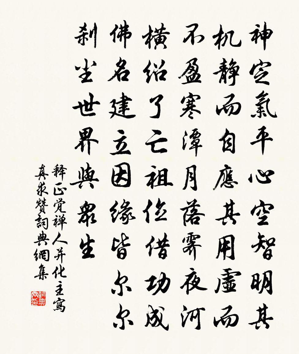 詩詞名句歷史字典書法欣賞書法字典國語詞典說文解字康熙字典古漢語字典標 題 作 者 詩 句 禪人並化主寫真求贊作者:釋正覺 朝代:宋代禪人並化主寫真求贊原文神定氣平,心空智明。其機靜而自應,其用虛而不盈。寒潭月落,霽夜河橫。紹了亡祖位,借功成佛名。建立因緣皆爾爾,剎塵世界與眾生。詩詞問答問:禪人並化主寫真求贊的作者是誰?答:釋正覺問:禪人並化主寫真求贊寫於哪個朝代?答:宋代釋正覺禪人並化主寫真求贊書法欣賞禪人並化主寫真求贊書法作品詩詞推薦荊釵曲楊維楨〔元代〕扶風女,行如有嬖,貌如鍾離春。三十不肯嫁,獨識五噫君。荊釵服終身,井臼操必親。舉案上食如大賓。如何會相見歡(見月聞笛八月五夜)李處全〔宋代〕新涼襟袂冷然。乍晴天。風送誰家羌管、月便娟。雲散盡,秋空碧,玉鉤懸。洗耳時聽三弄、等團圓。偈頌二十三首釋雲岫〔宋代〕西風凋木葉,蟋蟀啼壞牆。明月照破屋,露冷黃金床。藏經一卷,儒書一章。讀不成句,書不成行,天空地闊誰商奉和七夕兩儀殿會宴應制李乂〔唐代〕桂宮明月夜,蘭殿起秋風。雲漢彌年阻,星筵此夕同。倏來疑有處,旋去已成空。睿作鈞天響,魂飛在夢中。落梅徐集孫〔宋代〕春雨敲花逐水流,游蜂催課未知休。生來獨冷嫌無雪,別去相逢又隔秋。紫蒂窠窠凝酒恨,蒼苔點點落詩愁。黃昏望江南/憶江南邵伯溫〔宋代〕百尺長藤垂到地,千株喬木密參天。只在郡城邊。瑞鷓鴣仲殊〔宋代〕融融十月小春天。翼翼清都降聖賢。大抵龍飛雲必動,請觀二十七年前。方今龍又當天德,即日雲將擁地仙。富(擬水西寺東峰亭九詠垂澗藤梅堯臣〔宋代〕澗深連石壁,石上生長藤。孤猿來自熟,緣之下復登。賴無樵人跡,且免束薪蒸。伯兄新樓十首王柏〔宋代〕月滿闌乾風滿衿,浪因景物動清吟。鍾驚老鶴翻金剎,角引棲鴉投暮林。移使鄂州,次峴陽館懷舊居劉長卿〔唐代〕多慚恩未報,敢問路何長。萬里通秋雁,千峰共夕陽。舊遊成遠道,此去更違鄉。草露深山裡,朝朝落客裳。挽蔡久軒吳勢卿〔宋代〕識見先幾炳蔡著,艱難國事慮阽危。龜山如用求得半,君實未亡猶可為。人渺江濤已如此,公騎箕尾欲何之。門生次韻參寥師寄秦太虛三絕句時秦君舉進士不得蘇軾〔宋代〕得喪秋毫久已冥,不須聞此氣崢嶸。何妨卻作參寥子,無數新詩咳唾成。江梅引 寧海范明叔邀飯,覽月桂花王哲〔元代〕凌晨靜至樂倍,倚闌隈。*奇材。正是蟾宮。餘影世間來。遂得晴空甘露力,潤根*,發修條,偉又瑰。能綻粉苞六月望夜紀飲陳藻〔宋代〕年老聊依年少游,月圓庭上似中秋。舉杯問月爭多少,一度猶行甲子周。和陶止酒蘇軾〔宋代〕時來與物逝,路窮非我止。與子各意行,同落百蠻里。蕭然兩別加,各攜一樨子。子室有孟光,我室惟法喜。相逢句石延年〔宋代〕孟郊天地窄,楊朱歧路多。東林寺張至龍〔宋代〕滿院香風乍熟楂,猴孫抱子坐枯槎。頭陀不慣迎賓客,自折芙蓉供釋迦。初至法會鄭剛中〔宋代〕正愧修途煩仆馬,忽投幽寺息塵埃。杜門隻影惟便靜,覽鏡雙眉未忍開。春色更兼山色好,雨聲常帶生聲來。呼童頌古九十八首釋印肅〔宋代〕初心入處不為難,迷源逐境萬重山。觀音妙智慈悲力,連擊三聲體自閒。□去今何處去,悠悠空鎖白雲關。贈蕭巽齋文天祥〔宋代〕未有大撓書,先有伏羲易。古人尚卜筮,今人信命術。八卦與五行,皆自河圖出。易中元有命,道一萬事畢。卦義名句推薦瞿塘嘈嘈十二灘,此中道路古來難。劉禹錫《竹枝詞九首·其七》 公子王孫逐後塵,綠珠垂淚滴羅巾。崔郊《贈去婢》 與朋友交,言而有信。孔子弟子《論語·學而篇》 不須更上新亭望,大不如前灑淚時。虞集《挽文丞相》 五更鼓角聲悲壯,三峽星河影動搖。杜甫《閣夜》 春風不相識,何事入羅幃。李白《春思》 暗凝佇。近重陽、滿城風雨。周密《掃花游·九日懷歸》 不忍覆余觴,臨風淚數行納蘭性德《菩薩蠻·催花未歇花奴鼓》 重簾不捲留香久,古硯微凹聚墨多。曹雪芹《紅樓夢·第四十八回》 生民之本,要當稼稽而食,桑麻以衣。顏之推《顏氏家訓·治家篇》
