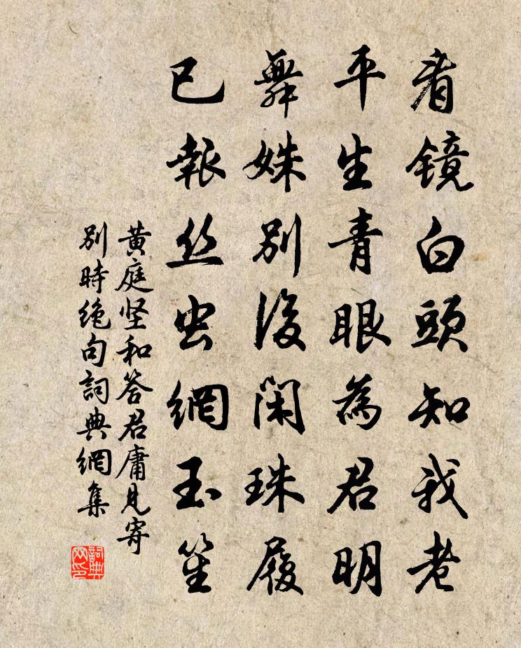 詩詞名句歷史字典書法欣賞書法字典國語詞典說文解字康熙字典古漢語字典標 題 作 者 詩 句 和答君庸見寄別時絕句作者:黃庭堅 朝代:宋代和答君庸見寄別時絕句原文看鏡白頭知我老,平生青眼為君明。舞姝別後閒珠履,已報絲蟲網玉笙。詩詞問答問:和答君庸見寄別時絕句的作者是誰?答:黃庭堅問:和答君庸見寄別時絕句寫於哪個朝代?答:宋代問:黃庭堅的名句有哪些?答:黃庭堅名句大全黃庭堅和答君庸見寄別時絕句書法欣賞和答君庸見寄別時絕句書法作品詩詞推薦過翻陽湖趙崇嶓〔宋代〕煙波三萬頃,著我木蘭船。望際疑無地,寰中別有天。長空孤鳥沒,四海一雲連。浩蕩平生意,南風正渺然。峽橋喻良能〔宋代〕驚流落石震林坰,一洗紅塵耳目醒。妙語曾聞杜陵老,高江急峽斗雷霆。答問詩十二篇寄呈滿子權其二耒答鎛三首王令〔宋代〕我用常在金,任金適由木。苟得金為用,何惜木微曲。幸得主人隨,不恤汗行犢。必求隨主人,我用諴不足。水龍吟(次李起翁中秋)趙以夫〔宋代〕誰家明鏡飛空,海天紺碧浮秋霽。西風淡盪,纖雲卷盡,小星疑墜。宇宙冰壺,襟懷玉界,飄然仙思。炯靈犀一點黃檗館權德輿〔唐代〕驅車振楫越山川,候曉通宵冒煙雨。青楓浦上魂已銷,黃檗館前心自苦。朝中措(賀益齊仿嗣娶婦)趙必〔宋代〕鳳凰台上聽 * 。銀燭萬紅搖。要覓瓊漿玉飲,隔牆便是藍橋。大兒清徹,小喬初嫁,雨膩雲嬌。愁怕沈郎銷瘦,謝兩知縣送鵝酒羊面二首陳造〔宋代〕僧樣齋廚冰樣官,飢憑脫粟食無單。不因同里兼同姓,肯念先生苜蓿盤。枯樹林景熙〔宋代〕凋悴緣何事,青青憶舊叢。有枝撐夜月,無葉起秋風。暑路行人惜,寒巢宿鳥空。倘留心不死,噓拂待春工。懷歸趙善漣〔宋代〕遊子何時返,家山萬里余。望雲愁思切,對月賞心疏。相嚴煩龜卜,頻逢絕雁書。浮名在京國,系我欲如何。和史魏公荷花釋寶曇〔宋代〕瀟然獨出泥滓外,不待好風相濯磨。紅如鹹池浴朝日,瑩若璧月沉秋波。強將國色斗清絕,輒莫天人誰敢過。香閣汪漕使即梅圃作浮月亭追和古詩餘亦補和魏了翁〔宋代〕一元播群卉,其氣清以馥。詩人競稱許,胡然於梅獨。黃宮播雷鞀,玉管動葭轂。惟梅命於陽,清 * 朴蔌。正冬社前一日用中秋夜未盡韻方回〔宋代〕清晨毛視園樹,槁葉脫梧檟。鄰家饋彘毛,里巷作秋社。報賽有故常,民欲其敢罷。勾龍得無羞,土毛旱欲赭。貧惜雙雙 溪橋寄意張先〔宋代〕城上層樓天邊路。殘照里,平無綠樹。傷遠更惜春暮。有人還在高高處。斷夢歸雲經日去。無計使,哀弦寄語。相次醉中歌敖陶孫〔宋代〕犢車油壁塵紛紛,恨君不識如花人。金鞭爭道誰家郎,出門三日香入休。春風酒面吹微鱗,主人拔釵留上賓。洞房舟泊嚴灘釋紹嵩〔宋代〕萬里春流繞釣磯,扁舟系柳向朱扉。悠然到此忘情處,默默無言對落暉。侄孫昺以東野農歌一編來細讀足以起予七言有戴復古〔宋代〕吾宗有東野,詩律頗留心。不學晚唐體,曾聞大雅音。霜空孤鶴唳,雲洞老龍吟。群噪無才思,昏鴉自滿林。吏責陸游〔宋代〕吏責何時得暫停,年來減盡鬢邊青。高談正樂催迎客,美睡方酣報掣鈴。安得雲山長在眼,便從樵牧與忘形。詩成送元宗簡張籍〔唐代〕貂帽垂肩窄皂裘,雪深騎馬向西州。暫時相見還相送,卻閉閒門依舊愁。上運使工部強至〔宋代〕網紀提諸郡,朝廷重外台。舉今持使柄,第一議公才。心計籠寰宇,時名薄斗魁。邦家經費足,山海利源開。待哺題余不溪廢寺皎然〔唐代〕武原離亂後,真界積塵埃。殘月生秋水,悲風起故台。居人今已盡,棲鴿暝還來。不到無生理,應堪賦七哀。名句推薦又似賈客蜀道間,千鐸萬磬鳴空山牛殳《琵琶行》 垂柳覆金堤,蘼蕪葉復齊。薛道衡《昔昔鹽》 記年時、舊宿淒涼,暮煙秋雨野橋寒。吳文英《霜花腴·重陽前一日泛石湖》 雲淡風高葉亂飛,小庭寒雨綠苔微,深閨人靜掩屏帷。顧敻《浣溪沙·雲淡風高葉亂飛》 木葉紛紛下,東南日煙霜。劉昚虛《暮秋揚子江寄孟浩然》 芳菊開林耀,青松冠岩列。陶淵明《和郭主簿·其二》 已訝衾枕冷,復見窗戶明。白居易《夜雪》 不見去年人,淚濕春衫袖。歐陽修《生查子·元夕》 君子和而不流;強哉矯。中立而不倚;強哉矯。國有道,不變塞焉;強哉矯。國無道,至死不變;強哉矯。子思《中庸·第十章》 須愁春漏短,莫訴金杯滿。韋莊《菩薩蠻·勸君今夜須沈醉》