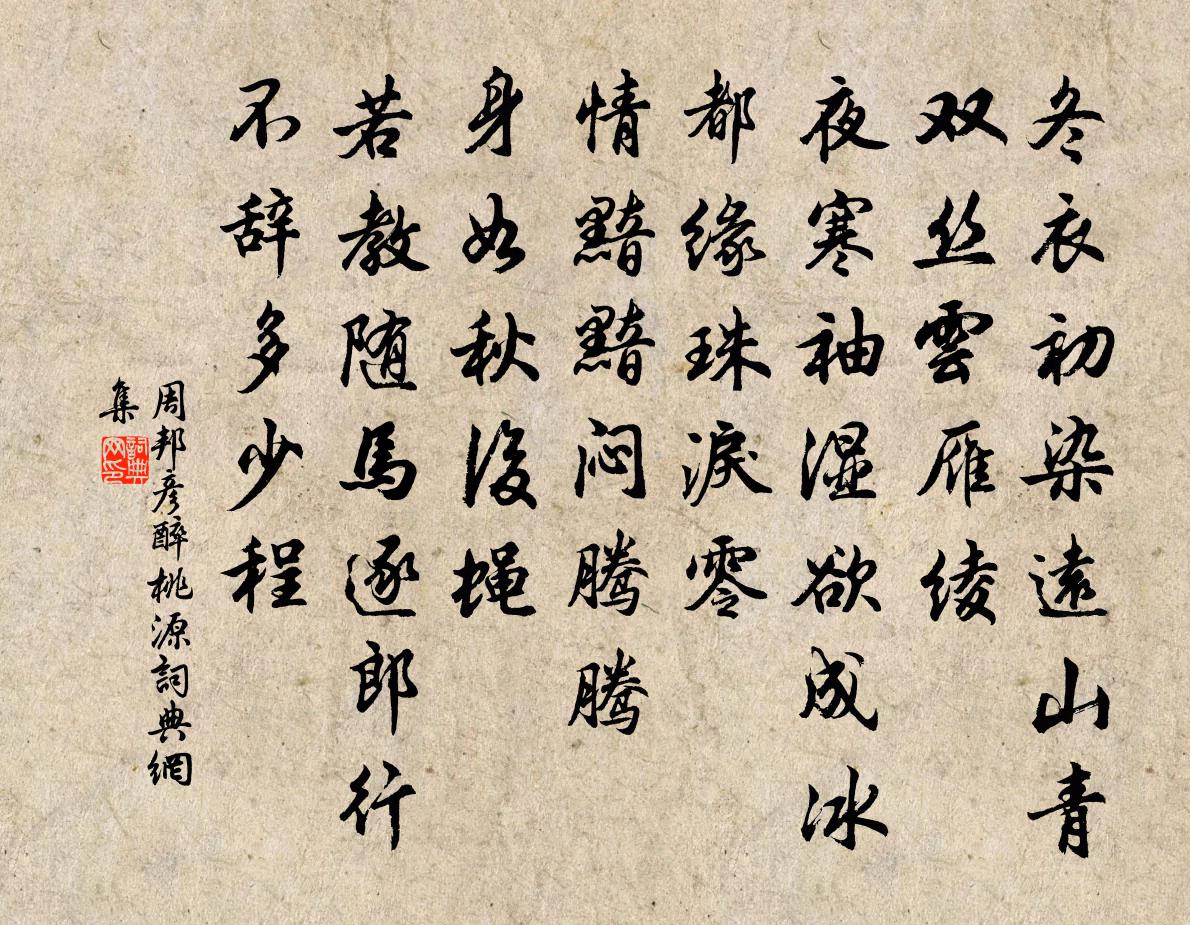 次句著重寫衣上的花紋。“雙絲”,言此衣質地精緻;“雲雁”指衣上花紋 。這種精心描繪婦女衣飾的手法 ,在溫庭筠詞里很常見,如“鳳凰相對盤金縷”(《菩薩蠻 》),說衣上的花紋是一對用金線繡成的鳳凰 ;“金雁一雙飛,淚痕沾繡衣”(《菩薩蠻》),這金雁雖可解釋成箏柱或首飾,但也可解釋成衣服上繡著一雙金碧輝煌的雁 ;至於“ 新貼繡羅襦,雙雙金鷓鴣 ”(《菩薩蠻》),更把這“襦”(短襖)的美寫得無以復加了。從溫詞的“鳳凰相對”、“金雁一雙”、“雙雙金鷓鴣”來看,無不寓有物則成雙、人則孤淒的內涵。這裡周邦彥用的是“雲雁”字樣,但雁從來不單飛。所不同的是,溫詞寓意易現,周詞寓意頗深,須婉曲才達。