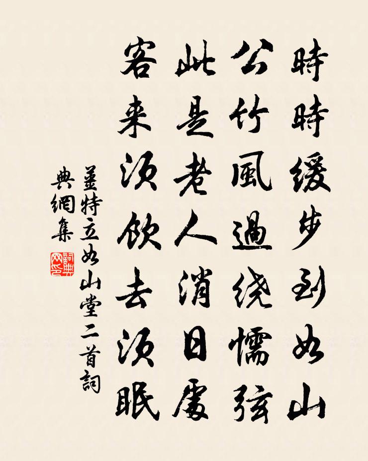 詩詞名句歷史字典書法欣賞書法字典國語詞典說文解字康熙字典古漢語字典標 題 作 者 詩 句 如山堂二首作者:姜特立 朝代:宋代如山堂二首原文時時緩步到如山,公竹風過繞懦弦。此是老人消日處,客來須飲去須眠。詩詞問答問:如山堂二首的作者是誰?答:姜特立問:如山堂二首寫於哪個朝代?答:宋代姜特立如山堂二首書法欣賞如山堂二首書法作品詩詞推薦將還河北留別堯夫先生邢恕〔宋代〕先生抱道隱牆東,心跡兼忘出處通。圯下每慚知孺子,床前曾憶拜龐公。已將目擊存微妙,直把神交寄始終。此日送盧徹之太原謁馬尚書司空曙〔唐代〕榆落雕飛關塞秋,黃雲畫角見并州。翩翩羽騎雙旌後,上客親隨郭細侯。遷客鄭谷〔唐代〕離夜聞橫笛,可堪吹鷓鴣。雪冤知早晚,雨泣渡江湖。秋樹吹黃葉,臘煙垂綠蕪。虞翻歸有日,莫便哭窮途。新荷葉史浩〔宋代〕真隱先生,家居近在東湖。茅屋三椽,自有一種清虛。秫來釀酒,便無後、也解賒沽。只愁客至,不能拚此芳壺。句蕭德藻〔宋代〕信腳到太古。長安春夜宿開元觀楊憑〔唐代〕霓裳下晚煙,留客杏花前。遍問人寰事,新從洞府天。長松皆掃月,老鶴不知年。為說蓬瀛路,雲濤幾處連。王殿丞舉通判桂州楊億〔宋代〕科名得玉向昆邱,家世長淮入海流。通籍殿中鉤盾省,頒條嶺外桂林州。漢皇前席期清夜,楚客歸帆指素秋。父老春日田園雜興青山白雲〔宋代〕昨夜東風雨一梨,曉晴科巷共熙熙。遮門勝喜有桑櫥,輪國不憂無地絲。小婦餉耕因廢識,老夫觀社忽成詩。眼前【越調】小桃紅_壽筵添上小盧摯〔元代〕壽筵添上小桃紅,妝點壺天供,茜蕊冰痕半浮動。彩雲中,生香喚醒羅浮夢。銀杯綠蟻,瓊枝清唱,金勝醉鰲峰。初夏陸游〔宋代〕白白餈筒美,青青米果新。衰遲重時節,薄少遍鄉鄰。梅市花成幄,蘭亭草作茵。極知歡意盡,強起伴遊人。行路難齊己〔唐代〕下浸與高盤,不為行路難。是非真險惡,翻覆作峰巒。漆愧同時黑,朱慚巧處丹。令人畏相識,欲畫白雲看。念奴嬌(梅)趙長卿〔宋代〕蘭枯菊槁。是返魂香入,江南春早。谷靜林幽人不見,夢與梨花顛倒。雪刻檀心,玉勻豐頰,妝趁嚴鍾曉。海山么趙待制輓詞樓鑰〔宋代〕詩近劉賓客,手追歐率更。雙旌古良吏,萬卷老書生。世諦浮雲薄,生緣曉夢驚。吁嗟東向議,何日遂施行。蘇祠部通判洪州梅堯臣〔宋代〕飛鷁去江西,秋飈滿桂旗。蘆洲花白處,楓岸處丹時。沙鳥看來沒,雲山愛後移。高才屬滕閣,家擅子卿詩。禁菸留題錦屏山下四首邵雍〔宋代〕寒食風煙錦屏下,憑高把酒興何如。滿川桃李方妍媚,不忍重為風破除。燕李中〔唐代〕豪家五色泥香,銜得營巢太忙。喧覺佳人晝夢,雙雙猶在雕梁。和性之見寄韻胡仲參〔宋代〕窗燭銷殘轉寂寥,柴門無復野僧敲。偶來枕上吟詩就,記向心頭欠筆抄。鳴筆數聲疑雪片,尋梅清夢到山坳。世情依韻和達觀文鑒雨中見懷梅堯臣〔宋代〕出浦候波平,石尤風未止。密雨長蒲牙,輕泥隨燕子。寒侵遠客衣,岸起新痕水。各各欲還山,還山能幾里。浪淘沙·海底飛塵終有日白居易〔唐代〕海底飛塵終有日,山頭化石豈無時。誰道小郎拋小婦,船頭一去沒回期。奉和太子納妃太平公主出降三首裴守真〔唐代〕瑜珮升青殿,穠華降紫微。還如桃李發,更似鳳凰飛。金屋真離象,瑤台起婺徽。彩纓紛碧坐,繢羽泛褕衣。雲路名句推薦龍蛇四海歸無所,寒食年年愴客心。屈大均《壬戌清明作》 時人不識凌雲木,直待凌雲始道高。杜荀鶴《小松》 下謀上以術,術有窮者以力。來俊臣《羅織經·謀劃卷第九》 蓮渚收香,蘭皋浮爽,涼思頓欺班扇。王月山《齊天樂·夜來疏雨鳴金井》 一種相思,兩處閒愁。李清照《一剪梅·紅藕香殘玉簟秋》 茅檐人靜,蓬窗燈暗,春晚連江風雨。陸游《鵲橋仙·夜聞杜鵑》 年年郡縣送征人,將與遼東作丘坂。王建《遼東行》 鬢髮已甘塵路白,菊花猶送塞垣黃。齊之鸞《九日登清水營城》 過五關,斬六將馮夢龍《喻世明言·卷三十一》 楚江湄,湘娥乍見,無言灑清淚周密《繡鸞鳳花犯·賦水仙》