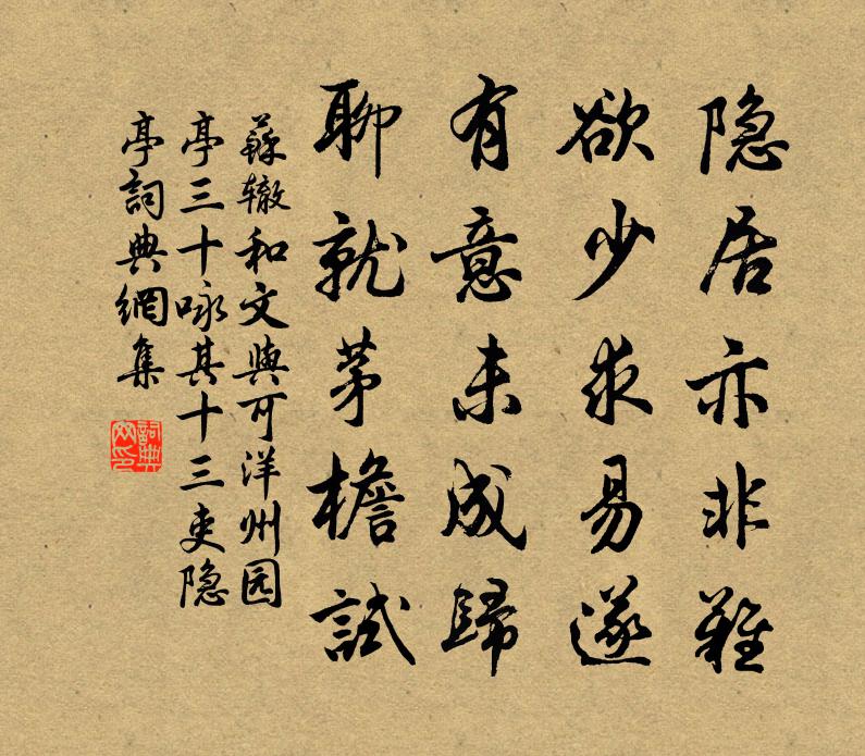 詩詞名句歷史字典書法欣賞書法字典國語詞典說文解字康熙字典古漢語字典標 題 作 者 詩 句 和文與可洋州園亭三十詠其十三吏隱亭作者:蘇轍 朝代:宋代原文隱居亦非難,欲少求易遂。有意未成歸,聊就茅檐試。詩詞問答問:《和文與可洋州園亭三十詠其十三吏隱亭》的作者是誰?答:蘇轍問:該詩寫於哪個朝代?答:宋代問:蘇轍的名句有哪些?答:蘇轍名句大全書法欣賞和文與可洋州園亭三十詠其十三吏隱亭書法作品詩詞推薦齊天樂(慶湖北漕知鄂州李樓峰)文天祥〔宋代〕南樓月轉銀河曙,玉簫又吹梅早。鸚鵡沙晴,葡萄水暖,一縷燕香清裊。瑤池春透。想桃露霏霞,菊波沁曉。袍錦賦蓮城堂姜特立〔宋代〕此是吾邦別洞天,樓台高下白雲邊。鳥聲人語相酬答,山影溪光共接連。便欲棄家來學道,不須航海去求仙。愧無寶陀岩陳岩〔宋代〕陰磴層崖洞室寬,奇花異草幾多般。彩雲不動金光起,便作金蓮法界看。齊天樂 澤國樓偶賦陳允平〔宋代〕湖光祗在闌乾外,憑虛遠迷三楚。舊柳猶青,平蕪自碧,幾度朝昏煙雨。天涯倦旅。愛小卻游鞭,共揮談塵。頓覺自詠瘦悴范成大〔宋代〕皮下多無肉,秋來瘦不禁。骨棱春焙銙,筋蹙海山沉。蟣虱從何有,蚊蠅枉見侵。惟余老筇杖,相伴兩虛心。初夏即事十二解楊萬里〔宋代〕密有花紅綠剌長,似來作伴石榴芳。金櫻身子玫瑰臉,更吃餳枝蜜果香。久雨釋永頤〔宋代〕山房十日雨,仰棟持行蝸。筍暗風庭竹,萱凝晚砌花。罌紅留夕火,焙綠薦春芽。滴滴西窗下,清泉滿石窪。重九偶成姚孝錫〔宋代〕天邊今日又重陽,隴樹紅飛雁信霜。且插茱萸慰衰鬢,莫將詩句撓迴腸。歌勤皓齒人俱醉,舞戀晴暉蝶也忙。來日奉和襲美茶具十詠茶塢陸龜蒙〔唐代〕茗地曲隈回,野行多繚繞。向陽就中密,背澗差還少。遙盤雲髻慢,亂簇香篝小。何處好幽期,滿岩春露曉。木蘭花慢元好問〔金代〕擁都六冠蓋,瑤圃秀,轉春暉。悵華屋生存,丘山零落,事往人非。追隨。舊家誰在,但千年、遼鶴去還歸。系馬題烏江湯泉寄老庵賀鑄〔宋代〕西庵松竹深,薄暮更微雨。山禽不畏人,嘲哳方對語。而余倦宦者,罷日今可數。京邑夙所懷,其如惡塵土。行復舟中徐集孫〔宋代〕厭 * 間名利忙,我忘名利只詩狂。雅陪雲衲三生話,分得漁舟半日涼。傍水細看鷗鷺浴,隔蘆吹過芰荷香。從容閒坐海觀興致悠然是時月白如晝蒲壽宬〔宋代〕一笑靈龜尾曳塗,扁舟聊復寄菰蒲。潮生潮落帆來去,雲捲雲舒山有無。風定若教胥怒息,月明空憶蠡游孤。漁翁新秋即事三首皮日休〔唐代〕痴號多於顧愷之,更無餘事可從知。酒坊吏到常先見,鶴料符來每探支。涼後每謀清月社,晚來專赴白蓮期。共君楊柳枝白居易〔唐代〕前有別楊柳枝,夢得繼和有“春盡絮飛”之句。又復戲答。柳老春深日又斜,任他飛向別人家。誰能更學孩童戲,錦津舟中對酒別劉善充楊慎〔明代〕錦江煙水星橋渡,惜別愁攀江上樹。青青楊柳故鄉遙,渺渺征人大荒去。蘇武匈奴十九年,誰傳書札上林邊。北風和曾吉父飲南坡四詩王洋〔宋代〕終年困塵土,一日同宴嬉。詩價重車渠,酒色空琉璃。月出散林莽,攬之有餘輝。山林信可樂,所樂無四時。況渠登敬亭山南望懷古贈竇主簿李白〔唐代〕敬亭一回首,目盡天南端。仙者五六人,常聞此游盤。溪流琴高水,石聳 * 壇。白龍降陵陽,黃鶴呼子安。羽化望江南/憶江南楊慧淑〔宋代〕江北路,一望雪皚皚。萬里打圍鷹隼急,六軍刁斗去還來。歸客別金台。江北酒,一飲動千杯。客有黃金如糞土,成都送別費冠卿陸暢〔唐代〕紅椒花落桂花開,萬里同游俱未回。莫厭客中頻送客,思鄉獨上望鄉台。名句推薦凡人之患,蔽於一曲,而闇於大理。荀子《荀子·解蔽》 昨別今已春,鬢絲生幾縷。韋應物《長安遇馮著》 亭皋木葉下,隴首秋雲飛柳惲《搗衣詩》 一切都是命,半點不由人。佚名《增廣賢文·上集》 蓬頭稚子學垂綸,側坐莓苔草映身。胡令能《小兒垂釣》 其交也以道,其接也以禮,斯孔子受之矣。孟子《孟子·萬章章句下·第四節》 江春不肯留歸客,草色青青送馬蹄。劉長卿《送李判官之潤州行營》 興,百姓苦;亡,百姓苦!張養浩《山坡羊·潼關懷古》 雁來音信無憑,路遙歸夢難成。李煜《清平樂·別來春半》 泥上偶然留指爪,鴻飛那復計東西。蘇軾《和子由澠池懷舊》