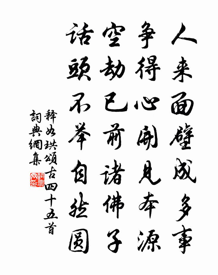 詩詞名句歷史字典書法欣賞書法字典國語詞典說文解字康熙字典古漢語字典標 題 作 者 詩 句 頌古四十五首作者:釋如珙 朝代:宋代頌古四十五首原文人來面壁成多事,爭得心開見本源。空劫已前諸佛子,話頭不舉自然圓。詩詞問答問:頌古四十五首的作者是誰?答:釋如珙問:頌古四十五首寫於哪個朝代?答:宋代釋如珙頌古四十五首書法欣賞頌古四十五首書法作品詩詞推薦池上釋文珦〔宋代〕曉業池上獨憑闌,無限春愁欲訴難。最是閏年時候別,楝花開盡尚清寒。丈人生辰強至〔宋代〕才過中元九日期,人間最重早秋時。當年間傑凝天粹,此際生賢作吏師。候屬金行資義節,氣鍾庚宿究兵奇。願公次韻梅山弟醉吟七首陳著〔宋代〕開眼門外世夢短,忘情樽前閒意長。邂逅當有赤松子,歌舞何用楚蘭香。憲使魏青崖惠拄杖堅多節而色尚黃惟額用白立陳杰〔宋代〕三尺青蛇冷劍鋩,百跗委蛻像生黃。分來上界金神節,堅起平生鐵脊樑。千步已穿蘿逕月,一棱猶帶柏台霜。小煩句陳珏〔宋代〕石洞雲歸春雨足,海門月上夜潮生。次韻幾復和答所寄黃庭堅〔宋代〕海南海北夢不到,會合乃非人力能。地褊未堪長袖舞,夜寒空對短檠燈。相看鬢髮時窺鏡,曾共詩書更曲肱。作個雜詠十首方鳳〔宋代〕蜂房開戶牖,蟻穴有官守。究竟物皆然,夢幻君知否。寄徐季益四首趙蕃〔宋代〕不見徐夫子,於今已二年。轉頭疑夙昔,屈指悟推遷。書欠洪喬寄,詩煩阿買傳。相思到極地,把誦一悠然。西江月(閨思)史達祖〔宋代〕西月淡窺樓角,東風暗落檐牙。一燈初見影窗紗。又是重簾不下。幽思屢隨芳草,閒愁多似楊花。楊花芳草遍天涯弟伋歸寧楊億〔宋代〕一夕西風木葉飛,長安久客念庭闈。去隨塞雁銜臣遠,歸值家雞啄黍肥。負郭生涯同季子,澄江詩景必玄暉。帝城自贊善相王邁〔宋代〕三分相士七分非,又似枯臞又似肥。好待功成名遂後,煩君只畫著蓑衣。次韻林次中九日都下感事二首蘇頌〔宋代〕桃杏初開已去家,又逢蘭菊綻新花。感時謾綴茱萸佩,惜別應憐棠棣華。迢遞宦遊來日下,悠揚歸思繞天涯。一尊頌古釋道顏〔宋代〕胡亂三十年,不少鹽與醬。江西馬大師,南嶽讓和尚。光皇祐二年謁告歸鄉晨至治平二上方得再來愴司馬光〔宋代〕十六載重歸,順塗歌式微。青公弊廬在,白首故人稀。外飾服章改,流光顏貌非。巫鹹舊山色,相見尚依依。賜禁中所種稻米宋祁〔宋代〕中天銅雀長鳴罷,清御滮池告稔初。刈斂方從弄田出,頒分更自導官餘。霜莖矗秀紆宸玩,玉粒凝甘剩禁儲。慚愧秋懷十首張耒〔宋代〕悠悠春與秋,泯泯朝復夜。濟時無遠圖,謀食阻高謝。茫茫兩不可,默默私自詫。疏弦無悅音,失路有迷駕。孟軻沁園春(中秋約僚佐觀擊圓,登懷遠,用前韻)李曾伯〔宋代〕喚麴生來,與常娥約,從太守游。把玉簫聲寄,蕭關短笛,霓裳曲換,清塞重裘。桂影飄搖,桐陰立盡,多少征人詩挽史魏公釋寶曇〔宋代〕一語回天力,終年困五丁。時方相司馬,吾不愧玄齡。遞奏逾金石,斯文粲日星。幡然霖雨手,猶帶御爐馨。偈頌一百零二首釋慧遠〔宋代〕古聖伽藍,一切成見。未跨三門,先跨三門,先見佛殿。句周煇〔宋代〕捲簾試約東君問,花信風來第幾番。名句推薦舉大事必有所資李大師、李延壽《南史·列傳·卷五十三》 花過雨。又是一番紅素。燕子歸來愁不語。李好古《謁金門·花過雨》 人生如夢,一尊還酹江月蘇軾《念奴嬌·赤壁懷古》 有耳莫洗潁川水,有口莫食首陽蕨李白《行路難三首》 不怕風狂雨驟,恰才稱,煮酒箋花。李清照《轉調滿庭芳·芳草池塘》 尋河愁地盡,過磧覺天低。岑參《磧西頭送李判官入京》 冬日之不濫,非愛冰也;夏日之不煬,非愛火也,為不適於身便於體也。管仲《管子·禁藏》 不興其藝,不能樂學。戴聖《禮記·學記》 笑指吾廬何處是?一池荷葉小橋橫。陳繼儒《浣溪沙·初夏夜飲歸》 伏波惟願裹屍還,定遠何鬚生入關。李益《塞下曲》
