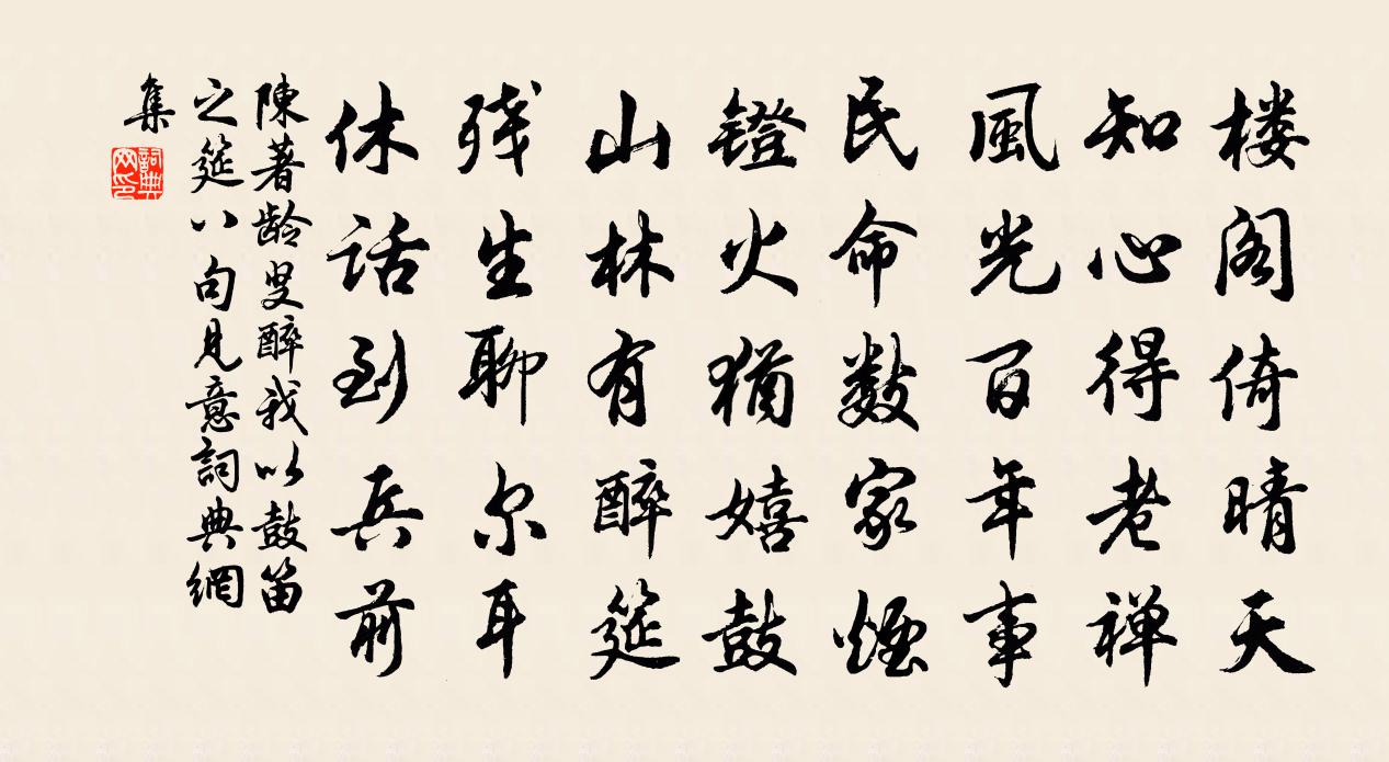 詩詞名句歷史字典書法欣賞書法字典國語詞典說文解字康熙字典古漢語字典標 題 作 者 詩 句 齡叟醉我以鼓笛之筵八句見意作者:陳著 朝代:宋代原文樓閣倚晴天,知心得老禪。風光百年事,民命數家煙。鐙火猶嬉鼓,山林有醉筵。殘生聊爾耳,休話到兵前。詩詞問答問:《齡叟醉我以鼓笛之筵八句見意》的作者是誰?答:陳著問:該詩寫於哪個朝代?答:宋代書法欣賞齡叟醉我以鼓笛之筵八句見意書法作品詩詞推薦用王去非侍郎韻二首送林元質提乾秩滿造朝並劉克莊〔宋代〕戌滿歸來薇亦剛,策名不覺十年彊。素無沂國三場志,曾有西山一瓣香。晁董未能免科舉,孔顏方可語行藏。要為宮詞宋白〔宋代〕樓前宣赦制金雞,大禮新成彩仗歸。萬歲聲高天地喜,慶雲飛上袞龍衣。避地桂陽山門招友人晚飲吳可〔宋代〕荒城住行李,故人亦淹留。稍遷墟丘間,愛此石泉幽。長夏晴復雨,風氣如清秋。開樽茅茨下,焉能消百憂。客懷頌古三十一首釋玿〔宋代〕相逢打鼓弄琵琶,須是還他兩會家。曲罷不知何處去,夕陽斜映暮天霞。無題白居易〔宋代〕引手攀紅櫻,紅櫻落如線。仰首看紅日,紅日走如箭。年光與時景,頃刻互衰變。何當血肉身,安得常強健。人心趙粹彥璨寫予真求贊周必大〔宋代〕王父當年此治中,嗟予鬢角未成童。只因闔郡攀泥軾,何事偏圖鶴髮翁。醉題信夫方丈蘇軾〔宋代〕鶴作精神松作筋,階庭蘭玉一時春。願君且住三千歲,長與東坡作主人。梅花喜神譜小蕊一十六枝宋伯仁〔宋代〕錦囊蘊珠璣,長養南風力。當年東老家,曾代中書筆。見淮東制帥趙南仲侍郎相待厚甚特送買山錢又戴復古〔宋代〕如公當向古人求,識面何須萬戶侯。浪說釣鰲游瀚海,真成騎鶴上揚州。受恩多處難為別,宿酒醒時始覺愁。回首和李光祖吳芾〔宋代〕男子升沉自有詩,莫輕感慨嘆稽遲。古來常患才難得,道在寧憂世不知。會際亨嘉膺晝接,且接粗糲療朝飢。他年呂之壽詩到仍用前韻約為五峰之游同訪老人丘葵〔宋代〕客中枉佳句,三復喜還悲。冉冉歲暮矣,悠悠思何之。桐下不共往,梅花預作期。地爐風雪夜,同訪五峰緇。徐太博母夫人輓詞戴栩〔宋代〕孫榮子貴問何如,籩斝盈庭學魯儒。若盡禮宗天下少,縱修彤史古人無。歸眠山館還知命,賜吉朝衣得暫娛。欲寄頌古三十六首釋惟一〔宋代〕縱火燒山臘月時,衲衣下事為全提。幾多撥草瞻風底,燎盡眉毛總不知。摸魚子趙必岊〔宋代〕倚西風、招鴻送燕,年華今已如客。青奴一餉貪涼夢,昨夜酒紅無力。愁似織。聽鳴葉寒蟬,話到情無極。舞衣春小憩二龍爭珠,蓋兩長嶺夾一圜峰故名。自此楊萬里〔宋代〕田路直復縈,肩輿斜還正。如何晴三日,猶自滑一徑。缺岸有危踐,方軫無穩興。不跌先獨驚,稍坦深自慶。肯信菩薩蠻(寄趙使君)陳師道〔宋代〕清詞麗句前朝曲。使君借與燈前讀。讀罷已三更。寒窗雨打聲。應憐詩客老。要使情懷好。猶有解歌人。尊前未得傅推官勸農七絕句擬和其五田父鄭剛中〔宋代〕老人聽讀勸農章,扶杖興言意味長。但願門前少呼喚,自然工力到耕桑。送毛君致仕還鄉蘇轍〔宋代〕古人避世事,豈問家有無。但言鴻鵠性,不受樊籠拘。公家昔盛時,阡陌連三衢。食廩濟寒餓,婚嫁營羈孤。千金初春陸游〔宋代〕柳拂朱橋湖水生,園林處處聽新鶯。亦知人世當行樂,無奈春陰不肯晴。走馬章台身縱老,看花杜曲眼猶明。只應緣識宋太宗〔宋代〕晴霽夜清秋,星繁月似鉤。樂耶興我意,絕唱入冥搜。名句推薦但見淚痕濕,不知心恨誰。李白《怨情》 善處事者,但就是非可否,審定章程,而不必利於己。王永彬《圍爐夜話·第九則》 客路相逢難,為樂常不足。蘇軾《送頓起》 隔牖風驚竹,開門雪滿山。王維《冬晚對雪憶胡居士家》 貧而無諂,富而無驕孔子弟子《論語·學而篇》 罪人或免人罪,難為亦為也。來俊臣《羅織經·問罪卷第十》 古台搖落後,秋日望鄉心。劉長卿《秋日登吳公台上寺遠眺》 未怪平陽客,雙淚落、笛中哀曲周邦彥《大酺·春雨》 思君令人老,歲月忽已晚。佚名《行行重行行》 紅蓮相倚渾如醉,白鳥無言定自愁。辛棄疾《鷓鴣天·鵝湖歸病起作》
