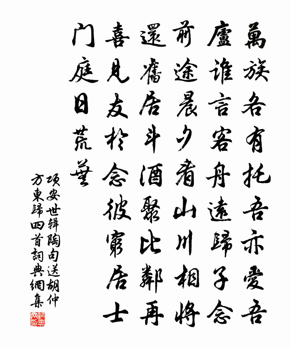 詩詞名句歷史字典書法欣賞書法字典國語詞典說文解字康熙字典古漢語字典標 題 作 者 詩 句 輯陶句送胡仲方東歸四首作者:項安世 朝代:宋代輯陶句送胡仲方東歸四首原文萬族各有托,吾亦愛吾廬。誰言客舟遠,歸子念前途。晨夕看山川,相將還舊居。斗酒聚比鄰,再喜見友於。念彼窮居士,門庭日荒蕪。詩詞問答問:輯陶句送胡仲方東歸四首的作者是誰?答:項安世問:輯陶句送胡仲方東歸四首寫於哪個朝代?答:宋代項安世輯陶句送胡仲方東歸四首書法欣賞輯陶句送胡仲方東歸四首書法作品詩詞推薦蝶戀花晁端禮〔宋代〕瀲灩長波迎鷁首。雨淡煙輕,過了清明候。岸草汀花渾似舊。行人只是添清瘦。瀋水香消羅袂透。雙櫓聲中,午夢寄張珍甫殿院五首李流謙〔宋代〕自是清華選,嘗懷宿昔期。高名推不去,異產買無貲。一日風雲遇,千年簡牘隨。岷峨添岌頁,袖裡著安危。詠史下衛瓘陳普〔宋代〕拓拔枝柯幸少疏,洛陽宮殿已為墟。休論榮晦師田續,忍讀金墉稽顙書。景安和章來再次韻謝設醴四首陳造〔宋代〕玉盤盂側玉為人,插羽瑤觴不計巡。想送客歸回醉盼,司花來夢鬧精神。雪中呈顏使升堅劉過〔宋代〕陰陽舒慘剎那間,刺使天高見一斑。人物眼中如水鑒,世情身外不冰山。滌除瑕垢與掩匿,彈壓風雲俱澀慳。羔酒寄上叔父夷仲三首黃庭堅〔宋代〕少年有功翰墨林,中歲作吏幾陸沈。庖丁解牛妙世故,監市履狶知民心。萬里書來兒女瘦,十月山行冰雪深。夢魂中隱岩李師中〔宋代〕訪隱尋幽緩著鞭,梅花初試小春天。孤峰上下分三洞,一水縈紆溉萬田。好向忙中拋俗事,卻來閒處覓神仙。清虛滿江紅(己未賡李制參直翁俾壽之詞)吳潛〔宋代〕午枕神遊,曉雞唱、城關偷度。俄頃里、筍輿伊軋,征夫前路。路入江南天地闊,黃雲翠浪千千畝。有皤翁、三五馬鞍山方信孺〔宋代〕塹山堙谷浪為謀,餘力猶窮嶺外洲。見說揭竿從壠上,祖龍當日漫東遊。贈謝子傑校勘六言三首劉克莊〔宋代〕功名隨露電過,文字與星斗垂。吾評潞公五福,何如放翁萬詩。奉和中書崔舍人八月十五日夜玩月二十韻劉禹錫〔唐代〕暮景中秋爽,陰靈既望圓。浮精離碧海,分照接虞淵。迥見孤輪出,高從倚蓋旋。二儀含皎澈,萬象共澄鮮。整御留師崇法院丁寶臣〔宋代〕瀕湖三寺倚崢嶸,梵剎相高對縣城。樓殿盡知隨處盛,水林獨愛此中清。翦開木末檐牙出,鑿破岩腰磴道成。悟得行者了寬等題錢買度牒疏四章李昴英〔宋代〕作佛何曾要裹纏,頂門尚欠世間錢。捨身者與舍佛者,選佛場中化有緣。清平樂袁去華〔宋代〕春衫袖窄。燭底橫波溢。困倚屏風無氣力。故故停歌駐拍。夜深滿勸金杯。曲中偷送情來。歸去十分準擬,今宵夢句鄭清之〔宋代〕玉質欲藏如許脆,鐵芒何苦太尖生。朝中措曾覿〔宋代〕西湖南北舊遊空。誰料一尊同。回首四年間事,渾如飛絮濛濛。林花謝了,明年春到,依舊芳容。惟有朱顏綠鬢,題黃山溫泉劉誼〔宋代〕山有靈砂泉色紅,滌除身垢信成功。不除心上無明業,只與山間眾木同。和王君貺禁中寓直宋祁〔宋代〕長樂疏鍾斷,昆池夕照收,晚風生似雨,仙霧爽如秋。鈞曲來深殿,宮花出御溝。雲天正如畫,璧月在西樓。寄鄉中親友二首陳造〔宋代〕棋酒游從嘆離群,酒慶吟筆漫飛塵。潮乎可奈才力老,甫也尚為南北人。主人不隨秋雁到,流年倏復野梅新。南崗巫山一段雲 西江風雪李齊賢〔元代〕雪壓江邊屋,風鳴浦口檣。時登草閣掛南窗。雲海杳茫茫。斫膾銀絲細,開尊綠蟻香。高歌一曲禮成江。腸斷賀頭名句推薦秋花冒綠水,密葉羅青煙。李白《古風·其五十九》 圓行方止,器之異也;金剛水柔,性之 別也。姚察、姚思廉《梁書·列傳·卷二十一》 關山別盪子,風月守空閨。薛道衡《昔昔鹽》 渡頭楊柳青青。枝枝葉葉離情。晏幾道《清平樂·留人不住》 坐蔭從容煩暑退,清心恍惚微香觸。陸容《滿江紅·詠竹》 五嶽尋仙不辭遠,一生好入名山游。李白《廬山謠寄盧侍御虛舟》 寧可信其有,不可信其無。佚名《增廣賢文·上集》 數點雨聲風約住。朦朧淡月雲來去。李冠《蝶戀花·春暮》 過春風十里,盡薺麥青青。姜夔《揚州慢·淮左名都》 別後不知君遠近。觸目淒涼多少悶。歐陽修《玉樓春·別後不知君遠近》
