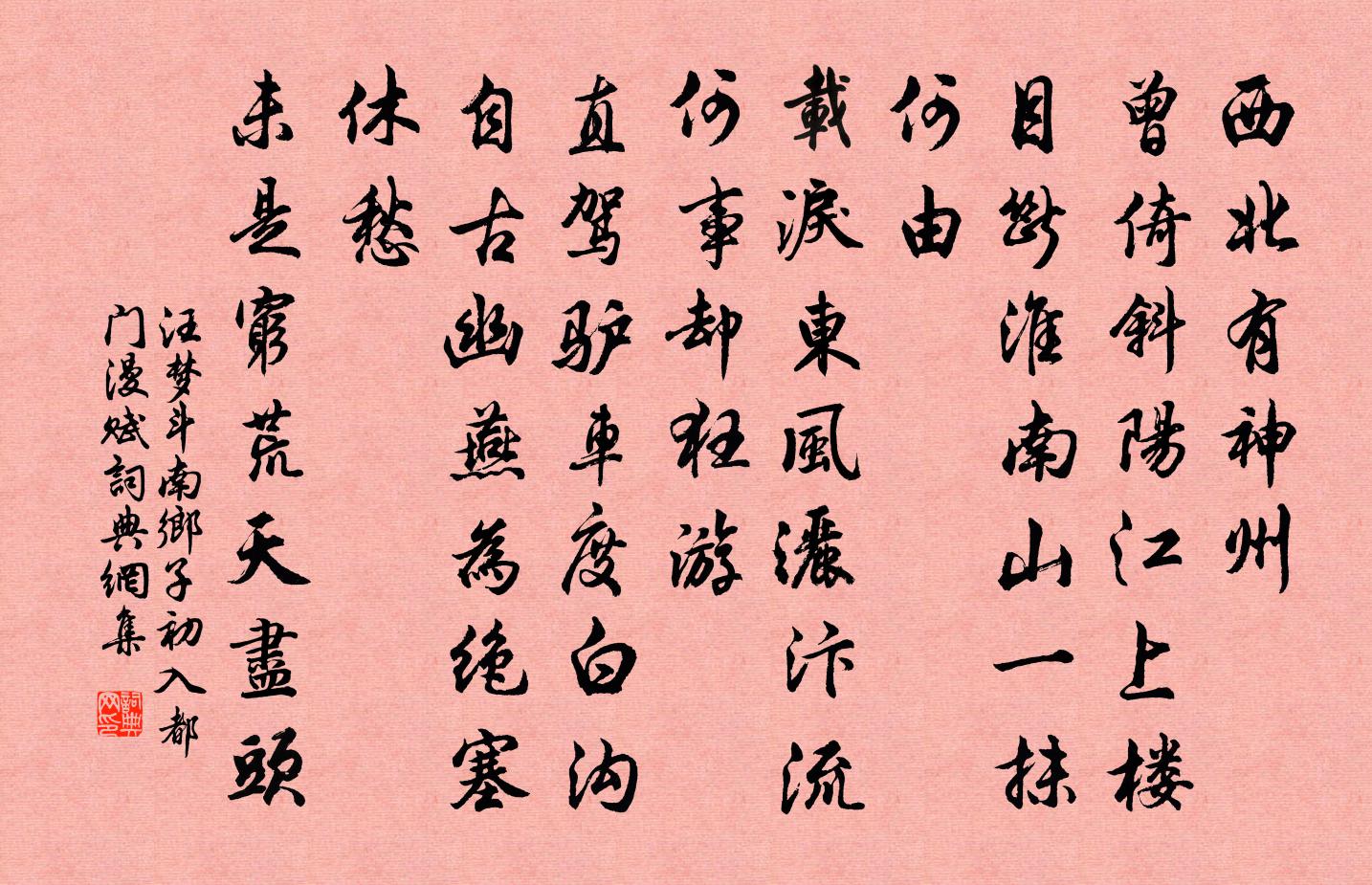 詩詞名句歷史字典書法欣賞書法字典國語詞典說文解字康熙字典古漢語字典標 題 作 者 詩 句 南鄉子(初入都門漫賦)作者:汪夢斗 朝代:宋代南鄉子(初入都門漫賦)原文西北有神州。曾倚斜陽江上樓。目斷淮南山一抹,何由。載淚東風灑汴流。何事卻狂游。直駕驢車度白溝。自古幽燕為絕塞,休愁。未是窮荒天盡頭。詩詞問答問:南鄉子(初入都門漫賦)的作者是誰?答:汪夢斗問:南鄉子(初入都門漫賦)寫於哪個朝代?答:宋代問:南鄉子(初入都門漫賦)是什麼體裁?答:詞汪夢斗南鄉子(初入都門漫賦)書法欣賞南鄉子(初入都門漫賦)書法作品詩詞推薦竹林傷田家易士達〔宋代〕陰陰沈沈雨霏霏,農夫把秧妻抱兒。前村後村歌相答,上畝下畝泥正肥。新谷登場腹不飽,新絲出盎身不絲。膏粱和伯氏用介卿韻惠詩二首蔡沈〔宋代〕悄悄園林世味長,碧雲疏散暮天光。且寬禮樂興江左,厭聽干戈暗洛陽。梨葉盡時無伏暑,竹陰深處有餘涼。從容感遇詩三十八首陳子昂〔唐代〕微月生西海,幽陽始代升。圓光正東滿,陰魄已朝凝。太極生天地,三元更廢興。至精諒斯在,三五誰能征。蘭若和王仲甫病暑晁補之〔宋代〕吳邦憚暑如蜂蠆,河曲還遭長日曬。蔗漿金碗賴蠲煩,內托潛陰數為敗。黃昏乍快風吹髮,驅拊蚊虻坐明發。青衫送黃(一作王)秀才李中〔唐代〕雨余飛絮亂,相別思難任。酒罷河橋晚,帆開煙水深。蟾宮須展志,漁艇莫牽心。岐路從茲遠,雙魚信勿沈。句葛公綽〔宋代〕為是山堂似草堂。自慶生次子王大烈〔宋代〕屈指春歸三月余,蔥蔥佳氣應充閭。人言再入長庚夢,我喜新添萬卷書。眾愛從渠自年少,蘭芬看爾長庭除。吾家水龍吟·雪中登大觀亭鄧廷楨〔清代〕關河凍合梨雲,沖寒猶試連錢騎。思量舊夢,黃梅聽雨,危闌倦倚。披氅重來,不分明出,可憐煙水。算夔巫萬里南鄉子賈奕〔宋代〕閒步小樓前。見個佳人貌類仙。暗想聖情渾似夢,追歡。執手蘭房恣意憐。一夜說盟言。滿掬沉檀噴瑞煙。報導早黎陽作詩曹丕〔魏晉〕奉辭罰罪遐征。晨過黎山巉崢。東濟黃河金營。北觀故宅頓傾。中有高樓亭亭。荊棘繞蕃叢生。南望果園青青。霜次韻趙端明萬花園方岳〔宋代〕和氣能消塞上寒,卻於邊事頗相干。酒旗歌鼓鞦韆外,新綠柔紅又幾般。崑山龔立道昱有月石硯屏斗南君玉諸人皆有詩孫應時〔宋代〕窗間明月鎮長在,此寶如今更有無。看取光輝生筆硯,可無文字繼歐蘇。鄰僧送桃花王洋〔宋代〕性根本自白環宮,分得天邊一種紅。比似將花供金粟,何如乞米送盧仝。冬夜聽雨戲作陸游〔宋代〕遶檐點滴如琴築,支枕幽齋聽始奇。憶在錦城歌吹海,七年夜雨不曾知。山居十三首蔡格〔宋代〕何思何慮只寂然,由來心靜類修禪。一去無多路□□,直啟玄關叩洞天。送黃公擇還故山元溥〔宋代〕惜解鷗邊纜,愁分柳下襟。柴荊方永晝,草樹復連陰。煮茗泉須沽,燒香火放深。是中真富貴,莫受二毛侵。暨陽居四首王令〔宋代〕出無王事牽,入不治居舍。蒿藜入牆屋,塵垢變幾架。糟糠苟無憂,智力取自暇。逢詩即廢日,得客輒忘夜。積懶滕王閣春日晚眺潘興嗣〔宋代〕重疊西屏對面開,巍城穹閣信雄哉。眼中孤鶩雲邊沒,望里長江檻外來。蛺蝶圖成春未晚,柘枝筵動客多才。休論明皇覽鏡妃子剪鬟劉子翬〔宋代〕不復青銅照瘁顏,耄荒從諫若移山。只將女子論賢否,陶母當時亦翦鬟。村家陳必復〔宋代〕繞郭一溪斜,溪村 * 家。招邀過鄰里,款曲話桑麻。老樹低眠石,寒流淺漱沙。吾生尚萍梗,愧爾獨興嗟。名句推薦家貧出孝子,國亂顯忠臣!佚名《增廣賢文·下集》 及茲春未深,數畝猶足佃。王守仁《謫居糧絕請學於農將田南山詠言寄懷》 飛光飛光,勸爾一杯酒。李賀《苦晝短》 綴文者情動而辭發,觀文者披文以入情劉勰《文心雕龍·知音》 路出寒雲外,人歸暮雪時。盧綸《李端公 / 送李端》 荷絲傍繞腕,菱角遠牽衣蕭綱《採蓮曲》 居高位者易驕,處佚樂者易侈。張廷玉《明史·列傳·卷二十四》 明敕星馳封寶劍,辭君一夜取樓蘭。王昌齡《從軍行七首》 淅淅西風淡淡煙,幾點疏疏雨。葛立方《卜運算元·席間再作》 以國為國,以天下為天下。劉向 編《六親五法》