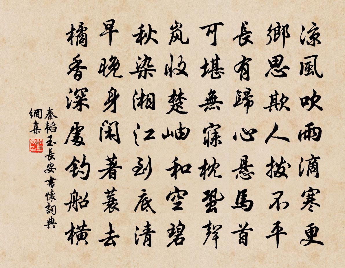 詩詞名句歷史字典書法欣賞書法字典國語詞典說文解字康熙字典古漢語字典標 題 作 者 詩 句 長安書懷作者:秦韜玉 朝代:唐代長安書懷原文涼風吹雨滴寒更,鄉思欺人撥不平。長有歸心懸馬首,可堪無寐枕蛩聲。嵐收楚岫和空碧,秋染湘江到底清。早晚身閒著蓑去,橘香深處釣船橫。詩詞問答問:長安書懷的作者是誰?答:秦韜玉問:長安書懷寫於哪個朝代?答:唐代問:長安書懷是什麼體裁?答:七律秦韜玉長安書懷書法欣賞長安書懷書法作品注釋全唐詩:卷670-1詩詞推薦茅山陳塤〔宋代〕三茅高出七山巔,頓隔塵沙道路千。靈籟蕭蕭風笛弄,奇形奕奕隴牛眠。人間已有嘉平帝,地下誰通句曲天。幸喜贈寇國寶三首陳師道〔宋代〕虎子墮地氣食牛,雀兒浴處魚何求。可奈我衰才亦盡,正須二子與同游。虞美人李曾伯〔宋代〕韶華只隔窗兒外。病起昏於醉。花開花落總相忘。惟有夢隨胡蝶、趁春忙。故園芳草應如舊。只恨人消瘦。擬憑飛題徐浩書法華經王安石〔宋代〕一切法無差,水牛生象牙。莫將無量義,欲覓妙蓮華。題烏程簿廳浮玉亭七首袁說友〔宋代〕霅川今是輞川圖,城郭中藏十頃湖。空說侯門深似海,得如簿領一亭無。春雪不止宋伯仁〔宋代〕春來雪意逾遲遛,又學飛綿過小樓,暖逐樂風雖易化,猛如前月未容休。鶯花訊息孤詩課,蠶麥生涯累客愁。莫道小立陸游〔宋代〕紅樹園廬晚,碧花籬落秋。荒陂船護鴨,斷岸笛呼牛。酒賤村村醉,山寒寺寺幽。聊須岸烏幘,小立埭西頭。高竹八首邵雍〔宋代〕高竹百餘挺,固知為予生。忽忽有所得,時時閒繞行。自信或未至,自知或未明。竊比於古人,不能無愧情。寄題三靈山程先生瑞墨閣金君卿〔宋代〕翼舒層構倚雲霞,日下無雙處士家。千疊靈山橫琬琰,八分宸筆動龍蛇。趨庭素業皆黃卷,揭版新詩半碧紗。我倦喜雨一首呈司錄諸公及諸先輩晁說之〔宋代〕二年七日古人嘆,一雨三時此際心。辛苦禜宗誅大厲,歡欣畢宿散群陰。無煩鐘鼓禽魚樂,便覺來牟波浪深。敢恨王敏肅公輓詞樓鑰〔宋代〕賤子慙生晚,龍門莫部津。詞場沾賸腹,政地仰洪鈞。古栝杏壇舊,東嘉棠蔭新。九京無馥作,知己更何人。青玉案張榘〔宋代〕少時貪看瓊林繞。任馬上、寒威峭。昨暮六花飛逗曉。擁衾慵起,鬢絲籠帽,頓覺年來老。朱闌翠竹枝枝倒。把玉和張周玉訪別吳泳〔宋代〕白露下百草,年光驚易徂。郵亭人折柳,別浦雁銜蘆。社瓮應藏酒,秋盤好斫鱸。賢渠陶靖節,晚歲覺迷塗。禪人並化主寫真求贊釋正覺〔宋代〕松老有骨,竹癯無肉。雪發覆顛,霜眉映目。須菩提坐空而談,維摩詰卷辨而默。拈來何處不相逢,日面佛兮月面高都護驄馬行(高仙芝開元末為安西副都護)杜甫〔唐代〕安西都護胡青驄,聲價欻然來向東。此馬臨陣久無敵,與人一心成大功。功成惠養隨所致,飄飄遠自流沙至。雄姿春晴白玉蟾〔宋代〕宿靄縈余凍,鬆陰挾嫩晴。朝來花萬福,鶯奏起居聲。贈黃山人蘇軾〔宋代〕面頰照人元自赤,眉毛覆眼見來烏。倦遊不擬談玄牝,示病何妨出白須。絕學已生真定惠,說禪長笑老浮屠。東坡登龍興寺閣孟浩然〔唐代〕閣道乘空出,披軒遠目開。逶迤見江勢,客至屢緣回。茲郡何填委,遙山復幾哉。蒼蒼皆草木,處處盡樓台。驟雨牡丹司空圖〔唐代〕得地牡丹盛,曉添龍麝香。主人猶自惜,錦幕護春霜。題華嚴經詩夏竦〔宋代〕黼幄思賢已再三,詔書將拆紫泥緘。嘉言一句利天下,何必金文更徹函。名句推薦醉里且貪歡笑,要愁那得工夫。辛棄疾《西江月·遣興》 嫁得瞿塘賈,朝朝誤妾期。李益《江南曲》 搜句忌於顛倒,裁章貴於順序劉勰《文心雕龍·章句》 兵久則力屈,人悉則變生。范曄《後漢書·列傳·桓譚馮衍列傳上》 相逢不飲空歸去,洞口桃花也笑人。佚名《增廣賢文·上集》 從善如順流,去惡如探湯。房玄齡《晉書·列傳·第五十七章》 一笛當樓,謝娘懸淚立風前史達祖《玉蝴蝶·晚雨未摧宮樹》 君者,舟也;庶人者,水也。水則載舟,水則覆舟。荀子《荀子·哀公》 惜恐鏡中春。不如花草新。張先《菩薩蠻·憶郎還上層樓曲》 高梧百尺夜蒼蒼,亂掃秋星落曉霜。鄭燮《詠梧桐》