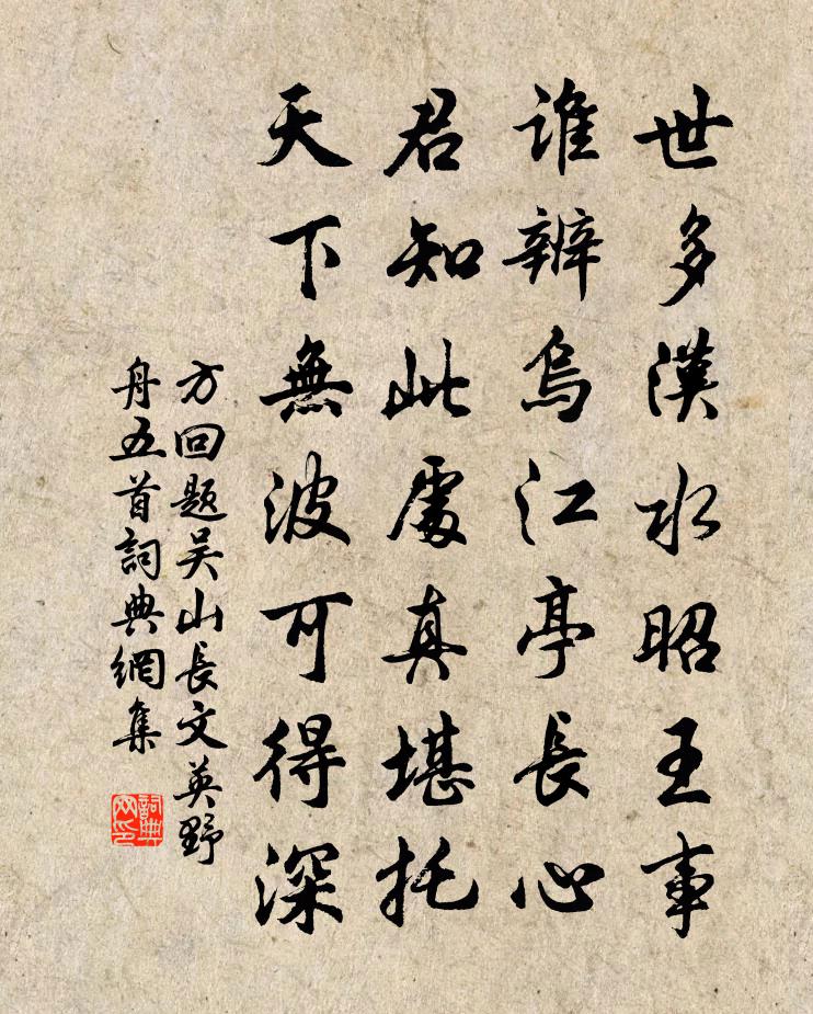 詩詞名句歷史字典書法欣賞書法字典國語詞典說文解字康熙字典古漢語字典標 題 作 者 詩 句 題吳山長文英野舟五首作者:方回 朝代:宋代題吳山長文英野舟五首原文世多漢水昭王事,誰辨烏江亭長心。君知此處真堪托,天下無波可得深。詩詞問答問:題吳山長文英野舟五首的作者是誰?答:方回問:題吳山長文英野舟五首寫於哪個朝代?答:宋代方回題吳山長文英野舟五首書法欣賞題吳山長文英野舟五首書法作品詩詞推薦丁亥沔陽春時即事簡吳叔永李曾伯〔宋代〕朝來漸可試春衣,弩末輕寒力已微。木葉未繁山尚瘦,桃花欲落花初肥。疆陲虜逐征鴻去,庭館人隨社燕歸。紫陌吳王輓詞徐鉉〔唐代〕倏忽千齡盡,冥茫萬事空。青松洛陽陌,荒草建康宮。道德遺文在,興衰自古同。受恩無補報,反袂泣途窮。四言詩十一首 其十嵇康〔兩漢〕羽化華岳。超游清霄。雲蓋習習。六龍飄飄。左配椒桂。右綴蘭苕。凌陽贊路。王子奉軺。婉孌名山。真人是要。送國子令狐博士赴興元覲省劉禹錫〔唐代〕相門才子高陽族,學省清資五品官。諫院過時榮棣萼,謝庭歸去踏芝蘭。山中花帶煙嵐晚,棧底江涵雪水寒。伯仲程楚翁訪考亭舊居著閩山集為題其後馬廷鸞〔宋代〕有客傳吟藁,知渠來自閩。四書猶在魯,六籍不憂秦。太史經鄒嶧,離騷感楚臣。誰知夢奠日,曾憶後庚申。勞劉子儀視作紅花堰晁公溯〔宋代〕冽冽天北風,仰視寒雲繁。蟄蟲亦坯戶,子獨在丘原。路人指此堰,嘖嘖相與言。堙廢將百年,故道今豈存。旁有雜劇·錢大尹智勘緋衣夢關漢卿〔元代〕第一折(沖末扮王員外同嬤嬤上)(王員外雲)耕牛無宿料,倉鼠有餘糧。萬事分已定,浮生空自忙。老夫姓王,既醉佚名〔先秦〕既醉以酒,既飽以德。君子萬年,介爾景福。既醉以酒,爾餚既將。君子萬年,介爾昭明。昭明有融,高朗令終,追送友人李季允歸蜀三首並寄所懷周南〔宋代〕保終無智力,麗澤慨重湖。白水當門戶,清秋送舳艣。他山藏實錄,稚子狎長途。自古多零落,空悲永夜徂。石菊史鑄〔宋代〕花美雖堪寫團扇,艷妖未必入東籬。紀名何取它山物,偏問園官總不知。洛陽吟(時大駕在蜀,巢寇未平,洛中寓居作七言)韋莊〔唐代〕萬戶千門夕照邊,開元時節舊風煙。宮官試馬游三市,舞女乘舟上九天。胡騎北來空進主,漢皇西去竟升仙。如今孫氏林亭方乾〔唐代〕池亭才有二三畝,風景勝於千萬家。瑟瑟林排全巷竹,猩猩血染半園花。並床欹枕逢春盡,援筆持杯到日斜。丱角朝中措佚名〔宋代〕天休令節慶生申。喜動滿城民。十萬兒童踴躍,祝公壽等莊椿。人生最貴,榮登五馬,千里蒙恩。只恐促歸廊廟,題壁劉學箕〔宋代〕午日柳陰正,曉風花氣新。川明魚詠水,林靜鳥啼春。南柯子 與背道者劉志淵〔元代〕久靜還思動,情甘愛海迷。仙凡兩路似雲泥。從此相分,不顧上天梯。莫學鷦鷯志,營營戀小枝。北溟鯤量願君為朝中措(蘇少蓮母生日)洪适〔宋代〕西崑當日下雲駢。采藻奉蘇仙。玉節榮看棠棣,斑衣笑俯芝蘭。壽觴爭舉,歌縈蛾綠,香裊龍涎。須與寄聲鸞鶴,謁石守道呂岩〔唐代〕高心休擬鳳池游,朱紱銀章寵已優。欲待禍來名欲滅,林泉養法預為謀。游雲溪與郡宴用太守韻即事二首戴復古〔宋代〕官府太平無一事,凝香座上著衰翁。飄搖短棹遊方沼,縹緲高樓倚半空。把酒夜深霜落後, * 人在月明中。使君馬上有見李茂復〔唐代〕行盡疏林見小橋,綠楊深處有紅蕉。無端眼界無分別,安置心頭不肯銷。【大石調】青杏子關漢卿〔元代〕離情殘月下西樓,覺微寒輕透衾裯。華胥一枕足彎跧覺,藍橋路遠,玉峰煙漲,銀漢雲收。【麼】天付兩風流,翻名句推薦人不可貌相,海水不可斗量。馮夢龍《醒世恆言·卷三》 集韻增廣,多見多聞。佚名《增廣賢文·上集》 一雙冷眼看世人,滿腔熱血酬知己。袁枚《隨園詩話·卷十六》 天平山上白雲泉,雲自無心水自閒。白居易《白雲泉》 若待明朝風雨過,人在天涯!春在天涯。虞集《南鄉一剪梅·招熊少府》 日光寒兮草短,月色苦兮霜白。李華《弔古戰場文》 日暖泥融雪半消,行人芳草馬聲驕。杜牧《宣州送裴坦判官往舒州時牧欲赴官歸京》 刑過不辟大臣,賞善不遺匹夫。韓非及後人《韓非子·有度》 圖未就之功,不如保已成之業洪應明《菜根譚·概論》 美成在久,惡成不及改莊子《莊子·內篇·人間世》