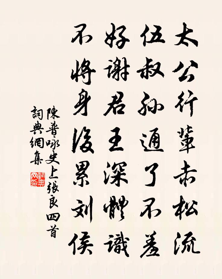詩詞名句歷史字典書法欣賞書法字典國語詞典說文解字康熙字典古漢語字典標 題 作 者 詩 句 詠史上張良四首作者:陳普 朝代:宋代詠史上張良四首原文太公行輩赤松流,伍叔孫通了不羞。好謝君王深體識,不將身後累劉侯。詩詞問答問:詠史上張良四首的作者是誰?答:陳普問:詠史上張良四首寫於哪個朝代?答:宋代陳普詠史上張良四首書法欣賞詠史上張良四首書法作品詩詞推薦和德粹三絕朱槔〔宋代〕心賞南樓一味涼,波光山影豐藜床。莫言體國非吾事,好夢不能千里長。句黃夢得〔宋代〕天意因心旌遺逸。自警劉克莊〔宋代〕筆枯硯燥自傷悲,文體全關氣盛衰。倚馬縱允揮萬字,騎驢尚足課千詩。奉盤誰可推盟主,撼樹人方謗老師。疑有贈宋相士謝枋得〔宋代〕墮甑看無益,乘軒計亦疏。忍貧吾自解,過論子姑徐。但得耆而艾,飽觀詩與書。時乎一杯酒,此外盡從渠。頌古釋道顏〔宋代〕金佛木佛泥佛,度爐度水度火。盡入趙州紅爐,烈焰光中煅過。一聲白雪陽春,萬古無人能和。奉和給事寓直崔峒〔唐代〕桂枝家共折,雞樹代相傳。忝向鸞台下,仍看雁影連。夜閒方步月,漏盡欲朝天。知去丹墀近,明王許薦賢。春分日徐鉉〔唐代〕仲春初四日,春色正中分。綠野裴回月,晴在斷續雲。燕飛猶個個,花落已紛紛。思婦高樓晚,歌聲不可聞。過樊村陳造〔宋代〕幾日囚籠鳥,今朝縱壑魚。空勞計遲速,凡百有乘除。岸勢驚禽過,江聲午夢餘。心融得新句,澄水滴銅蜍。書所見聞示諸友魏了翁〔宋代〕聞說奔軍闖閬州,余州民潰去如流。親曾見虎誠堪怖,只為狐驚亦可羞。念奴嬌張孝祥〔宋代〕星沙初下,望重湖遠水,長雲漠漠。一葉扁舟誰念我,今日天涯飄泊。平楚南來,大江東去,處處風波惡。吳中何水龍吟 代玄覽和東泉學士自壽之作 案此張雨〔元代〕古來宰相神仙,有誰得似東泉老。今朝佳宴,楊枝解唱,花枝解笑。鐘鼎山林,同時行輩,故人應少。問功成身退塞下曲二首·其二王涯〔唐代〕年少辭家從冠軍,金鞍寶劍去邀勛。不知馬骨傷寒水,惟見龍城起暮雲。過曹娥廟黃庚〔宋代〕細雨滿山眉黛斂,怒濤千古哭聲寒。須知此廟關風教,莫作尋常神女看。寄題盧川容膝軒詩王邁〔宋代〕誰將容膝榜軒楣,未見高人心領之。綠綺牙籤無長物,名芝芳茝是佳兒。臥看筆架成江夢,坐揖爐峰讀楚詞。諸謝侍宴歸雁堂虞世南〔唐代〕歌堂面淥水,舞館接金塘。竹開霜後翠,梅動雪前香。鳧歸初命侶,雁起欲分行。刷羽同棲集,懷恩愧稻粱。漢嚴將軍廟聞肇瑝〔宋代〕漢史標名氏,宕梁存慕丘。非惟能抗節,更獨抱先憂。全蜀悲銜璧,孤身欲斷頭。湍奔砥柱屹,果碩剝陽留。片語王廷憑臻知廬州舒城縣楊億〔宋代〕潁水生賢自古奇,西遊聲價滿京師。梁園獻賦天將雪,潘縣臨民鬢未絲。南浦銷魂分袂處,北堂獻壽捧觴時。到官有所思葉茵〔宋代〕仰天有所思,心遠目苦短。西風驅殘雲,千里月華滿。淳熙乙未登科是夏再中教官得綠紹興府教授秋項安世〔宋代〕江南官路接天開,五月長安賜第回。若見門人舊題處,亦須披拂記曾來。次韻馬少伊木犀范成大〔宋代〕月窟飛來露已涼,斷無塵格惹蜂黃。纖纖綠裹排金粟,何處能容九里香?水尾山腰樹影蒼,一天風露不供香。誰家名句推薦千山鳥飛絕,萬徑人蹤滅。柳宗元《江雪》 隰桑有阿,其葉有幽。佚名《隰桑》 西陸蟬聲唱,南冠客思深。駱賓王《詠蟬 / 在獄詠蟬》 不能則學,疑則問戴聖《大戴禮記·曾子制言上第五十四》 鶯花昨夢總飄零,一笏姜山似舊青端木國瑚《姜山秦淮海監酒稅處(鶯花昨夢總飄零)》 慧者心辯而不繁說,多力而不伐功,此以名譽揚天下。墨子《墨子·02章 修身》 花隱掖垣暮,啾啾棲鳥過。杜甫《春宿左省》 啼時驚妾夢,不得到遼西。金昌緒《春怨 / 伊州歌》 為學無間斷,如流水行雲,日進而不已也。王永彬《圍爐夜話·第十四則》 明朝掛帆席,楓葉落紛紛。李白《夜泊牛渚懷古》