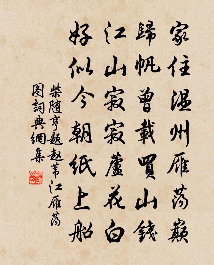 詩詞名句歷史字典書法欣賞書法字典國語詞典說文解字康熙字典古漢語字典標 題 作 者 詩 句 題趙葦江雁盪圖作者:柴隨亨 朝代:宋代題趙葦江雁盪圖原文家住溫州雁盪巔,歸帆曾載買山錢。江山寂寂蘆花白,好似今朝紙上船。詩詞問答問:題趙葦江雁盪圖的作者是誰?答:柴隨亨問:題趙葦江雁盪圖寫於哪個朝代?答:宋代柴隨亨題趙葦江雁盪圖書法欣賞題趙葦江雁盪圖書法作品詩詞推薦喜遷鶯程珌〔宋代〕少年意氣,腦燕兵胡,虜王區脫。眼底朦朧,腹中空洞,不著曹劉元白。聞道殊科八中,也要彩盧連擲。收拾盡樞密謝公輓詞樓鑰〔宋代〕臣主一意合,風雲平地生。立朝專論諫,為國總樞衡。行矣登三事,悲哉奠兩楹。輟瓜恩意重,終始備哀榮。長別離吳邁遠〔南北朝〕生離不可聞,況復長相思。如何與君別,當我盛年時。蕙華每搖盪,妾心長自持。榮乏草木歡,悴極霜露悲。富貴山居王建〔唐代〕屋在瀑泉西,茅檐下有溪。閉門留野鹿,分食養山雞。桂熟長收子,蘭生不作畦。初開洞中路,深處轉松梯。蠟辭 / 伊耆氏蠟辭佚名〔先秦〕土反其宅,水歸其壑,昆蟲毋作,草木歸其澤!次韻馬莊父問行期之什趙蕃〔宋代〕日日言歸去,年年事遠遊。世態甘若醴,我曹和不流。殷勤枉詩問,準擬系帆留。今秋行方回〔宋代〕八月十五夜賞月,樓台絲管沸金穴。百萬珠簾卷嫩涼,茉莉花闌木犀發。八月十八日觀潮,幕帟粉黛迎蘭橈。雪山滿庭芳 邀姚公書馬鈺〔元代〕山侗稽首,自別姚仙。思心度日如年。即此清清雨霽,遍潤芝田。伏惟神明協相,處安閒、法體然。鈺如昨,荷尋送陳正己赴調項安世〔宋代〕一寸丹心百念更,滿簪華發萬人驚。閒拋歲月供書冊,長把饑寒為友生。此事不經身出處,諸公可念政和平。昔藏羅子琳謁趙香山得錢十緡米三石意若未滿以詩曾豐〔宋代〕主人長念客鳴腸,況復花封是稻鄉。指廩何疑猶出手,歸艘豈患不連檣。下第留別舍弟弼李廌〔宋代〕繆承名卿後,煜煜贊皇裔。閔途遘伶俜,勉力濟顛墜。百年能幾何,三十已一世。胸中經綸策,偃蹇未獲試。衰殘和景仁七十一偶成司馬光〔宋代〕心地長閒為己物,年華不駐是天時。當時海上乘槎客,維楫都無行所之。勉愛行二首送小季之廬山李賀〔唐代〕洛郊無俎豆,弊廄慚老馬。小雁過爐峰,影落楚水下。長船倚雲泊,石鏡秋涼夜。豈解有鄉情?弄月聊鳴啞。深居雜興六首林逋〔宋代〕隱居松籟細錚然,何獨微之重碧蘚。已被遠峰擎{左山右雙}{左山右雙},更禁初月吐娟娟。門庭靜極霖苔露,春日寄許渾先輩杜牧〔唐代〕薊北雁初去,湘南春又歸。水流滄海急,人到白頭稀。塞路盡何處?我愁當落暉。終須接鴛鷺,霄漢共高飛。句許翁〔宋代〕亭名燕喜經品題,至今增重湟川地。減字木蘭花張掄〔宋代〕還元返本。作用難明須細論。神氣□□。窈窕之中復混成。勤修不倦。直到無為功始見。此是天機。不遇真仙莫強丙子歲三月十有二日游嵩山宿峻極中院時天氣李廌〔宋代〕舍鞅陟層巘,老步獨多嘆。笑談谷傳響,松聲遞蕭散。欲尋草堂池,土室無僧贊。次韻李參政見遺生日魏了翁〔宋代〕幸有鶴山房,圖書繞夢香。況慚聞道淺,何苦為人忙。五斗米非分,三間茅可長。何當重操幾,同踏古松岡。和羅巨濟山居十詠楊萬里〔宋代〕秀溪何處好?臘尾與春初。山色梅邊淨,人家竹里居。先生來得得,一笑意舒舒。歸路無燈火,冰輪掛嶺隅。名句推薦庭軒寂寞近清明,殘花中酒,又是去年病。張先《青門引·春思》 上窮碧落下黃泉,兩處茫茫皆不見。白居易《長恨歌》 始知鎖向金籠聽,不及林間自在啼。歐陽修《畫眉鳥》 以國為國,以天下為天下。劉向 編《六親五法》 馬嘶經戰地,雕認打圍山。王鎡《塞上曲》 晝出耘田夜績麻,村莊兒女各當家。范成大《夏日田園雜興·其七》 敏捷詩千首,飄零酒一杯。杜甫《不見》 無奈朝來寒雨,晚來風。李煜《相見歡·林花謝了春紅》 賤禮義而貴勇力,貧則為盜,富則為賊。荀子《荀子·樂論》 誰信多情道,相思漸覺詩狂少。吳綺《惜分飛·寒夜》