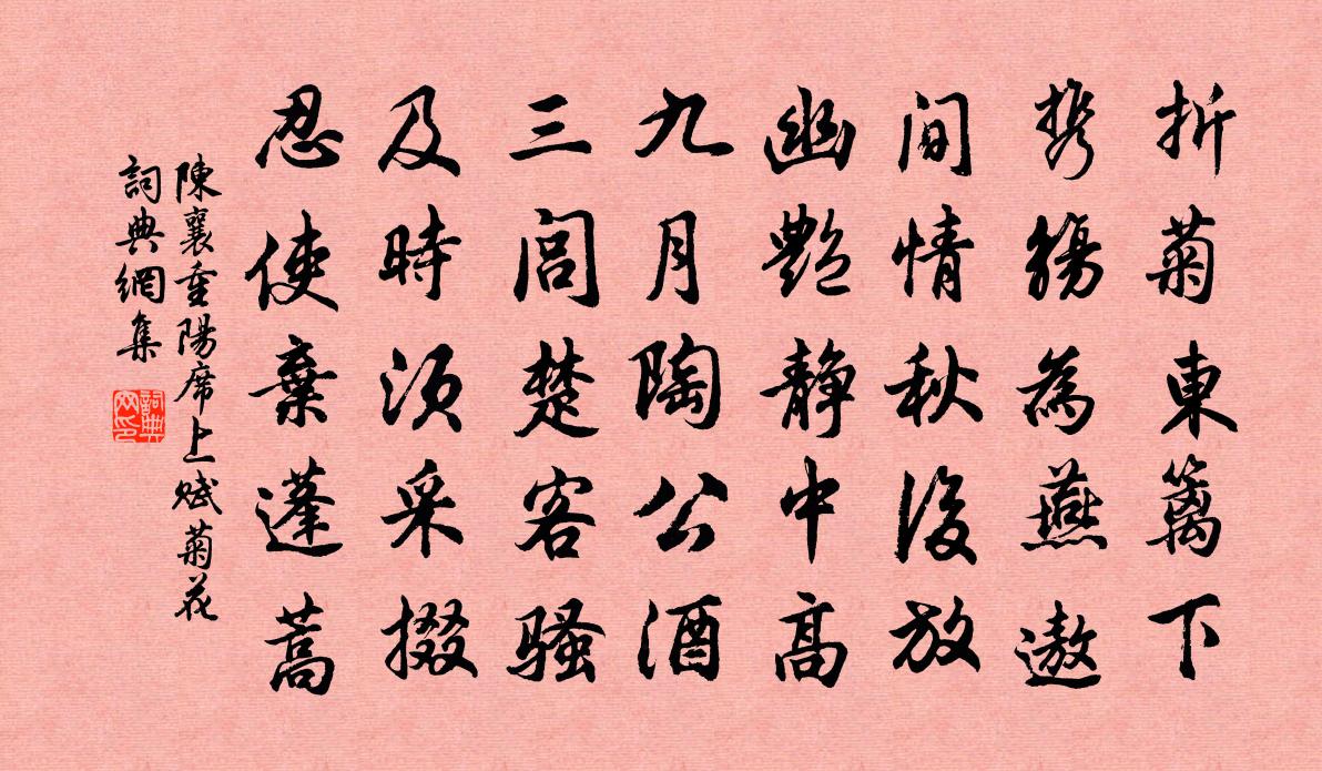 詩詞名句歷史字典書法欣賞書法字典國語詞典說文解字康熙字典古漢語字典標 題 作 者 詩 句 重陽席上賦菊花作者:陳襄 朝代:宋代重陽席上賦菊花原文折菊東籬下,攜觴為燕遨。間情秋後放,幽艷靜中高。九月陶公酒,三閭楚客騷。及時須采掇,忍使棄蓬蒿。詩詞問答問:重陽席上賦菊花的作者是誰?答:陳襄問:重陽席上賦菊花寫於哪個朝代?答:宋代陳襄重陽席上賦菊花書法欣賞重陽席上賦菊花書法作品詩詞推薦次韻鄭德彝即事於石〔宋代〕瓢空飯落埃,陋巷一顏回。月坐人醉醒,風眠戶闔開。搜奇屐穿雪,習懶硯生苔。舊菊今存否,長歌歸去來。頌一百則釋重顯〔宋代〕一拽石,二般土,發機須是千鈞弩。象骨老師曾輥毬,爭似禾山解打鼓。報君知,莫莽鹵,甜者甜兮苦者苦。贈童子蚍蜉晁說之〔宋代〕拂拭方山帽,安排一復巾。春秋書滿架,整整莫因循。雒城作羅隱〔唐代〕大鹵旌旗出洛濱,此中煙月已埃塵。更無樓閣尋行處,只有山川識野人。早得鑄金夸范蠡,旋聞垂釣哭平津。舊遊拒霜花歐陽修〔宋代〕芳菲能幾時,顏色如自愛。鮮鮮弄霜曉,裊裊含風態。蕙蘭殞秋香,桃李媚春醉。時節雖不同,盛衰終一致。莫笑同友人尋澗花白居易〔唐代〕聞有澗底花,貰得村中酒。與君來校遲,已逢搖落後。臨觴有遺恨,悵望空溪口。記取花發時,期君重攜手。我生杜宇陸游〔宋代〕杜宇雖微禽,用意舉世稀。念昔春盛時。天地皆芳非,杜宇默無聲,不畏百鳥譏。東君將促駕,乃獨號鳴悲,日夜浪淘沙(有感)劉辰翁〔宋代〕無謂兩眉攢。風雨春寒。池塘小小水漫漫。只為柳花無一點,忘了臨安。何許牡丹殘。客倚屏看。小樓面面是春山呈周昭禮二首趙蕃〔宋代〕又向江頭覓去船,故山歸路反茫然。秋鴻社燕各千里,落日殘霞同一川。酒得老兵猶可飲,詩須我輩始堪傳。經行客舍久雨無酒戲柬沈泰叔陳棣〔宋代〕秋來濘淖幾曾乾,旅邸盤旋尋丈間。擬仗神功擊陽石,卻疑天漏類陰山。已甘從事經年別,未放管城終日閒。欲課天津感事二十六首邵雍〔宋代〕隋唐而下貴公卿,近世風波走利名。借問天津橋下水,當時湍急作何聲。秋思七言八首方回〔宋代〕重陽時節黃花近,老子情懷白髮新。點檢客囊無一物,江湖七十五年身。春羈詩鮑照〔南北朝〕征人嘆道遐。去鄉愒路邇。佳期每無從。淮陽非尺咫。春日都游心。勞情出徙倚。岫遠雲煙綿。谷屈泉靡迤。風起太原使院晚出薛能〔唐代〕青門無路入清朝,濫作將軍最下僚。同舍盡歸身獨在,晚風開印葉蕭蕭。寄國香魚玄機〔唐代〕旦夕醉吟身,相思又此春。雨中寄書使,窗下斷腸人。山卷珠簾看,愁隨芳草新。別來清宴上,幾度落梁塵。書事二首陳造〔宋代〕壯年膚骨已清臞,老去支離轉不如。二十七年扶病過,半緣耽酒半耽書。送蓬丘山人張以道歸吉州曹彥約〔宋代〕山人曾著宰官衫,了事還為馬口銜。別我三年無瞬息,思君一節尚巉岩。人生契合常如此,吾道年來見大凡。雨後次韻和答孔毅甫黃庭堅〔宋代〕鵬飛鯤化未即逍遙遊,龍章鳳姿終作廣陵散。湓浦爐邊督數錢,故人陸沉心可見。氣與神兵上鬥牛,詩如晴雪濯江石鈞父之官火井乞詩贈行李流謙〔宋代〕君家嶙峋兩冰柱,黃塵漲天不敢污。阿雲醉臥呼不譍,斷碑零落荒阡雨。君今去作火井縣,山中嬰兒待慈母。前日上分水嶺張嵲〔宋代〕夜半風撼山,苦雨歇初曉。高峰吹成冰,草樹葉盡縞。行行入雲中,稍稍臨木杪。恍疑天宇近,漸覺溪溜小。挺身名句推薦待把酒送君,恰又清明後。何夢桂《摸魚兒·記年時人人何處》 冥冥重泉哭不聞,蕭蕭暮雨人歸去。白居易《寒食野望吟》 牛困人飢日已高,市南門外泥中歇。白居易《賣炭翁》 晴雲輕漾,薰風無浪,開樽避暑爭相向。薛昂夫《西湖雜詠·夏》 今日聽君歌一曲,暫憑杯酒長精神。劉禹錫《酬樂天揚州初逢席上見贈》 先行其言而後從之。孔子弟子《論語·為政篇》 年去年來白髮新,匆匆馬上又逢春。于謙《立春日感懷》 燕子不曾來,小院陰陰雨。蔣春霖《卜運算元·燕子不曾來》 仙佛茫茫兩未成,只知獨夜不平鳴。黃景仁《雜感》 雪似梅花,梅花似雪。似和不似都奇絕。呂本中《踏莎行·雪似梅花》