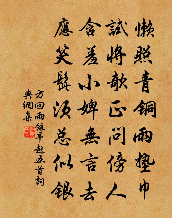 詩詞名句歷史字典書法欣賞書法字典國語詞典說文解字康熙字典古漢語字典標 題 作 者 詩 句 雨余早起五首作者:方回 朝代:宋代雨余早起五首原文懶照青銅雨墊巾,試將欹正問傍人。含羞小婢無言去,應笑髭鬚總似銀。詩詞問答問:雨余早起五首的作者是誰?答:方回問:雨余早起五首寫於哪個朝代?答:宋代方回雨余早起五首書法欣賞雨余早起五首書法作品詩詞推薦句李伯先〔宋代〕一門萃忠孝,竹錦寫家聲。依韻和孫浦二者官展墓由大明精舍而歸梅堯臣〔宋代〕拜壠忽生寒食心,應緣春入感啼禽。淚沾宿草根仍凍,馬立荒沙跡已深。野老輟耕風料峭,山房開晝日陰森。歸鞍景德祀九宮貴神三首佚名〔宋代〕祗牙有常,惟神無方。回飈整馭,垂休降祥。雜曲歌辭。昔昔鹽。採桑秦氏女趙嘏〔唐代〕南陌採桑出,誰知妾姓秦。獨憐傾國貌,不負早鶯春。珠履盪花濕,籠鉤折桂新。使君那駐馬,自有侍中人。樂天是月長齋鄙夫此時愁臥里閭非遠雲霧難披因以…驚禪劉禹錫〔唐代〕五月長齋月,文心苦行心。蘭蔥不入戶,薝蔔自成林。 ——劉禹錫護戒先辭酒,嫌喧亦徹琴。塵偈六十三首釋道寧〔宋代〕先賢垂範,流落人間。日久歲深,禪人不顧。語非玄妙,直透重關。畫瓶打破,淥水青山。莫訝報慈多冷淡,得盤病後訪梅九絕劉克莊〔宋代〕一聯半首致魁台,前有沂公後簡齋。自是君詩無警策,梅花窮殺幾人來。和秉彝李君五偈釋智愚〔宋代〕爐邊呵凍得能多,端石無辜日夜磨。卻把悼詞為雪詠,詩魔難敵勝修羅。拂舞歌辭李賀〔唐代〕吳娥聲絕天,空雲閒徘徊。門外滿車馬,亦鬚生綠苔。樽有烏程酒,勸君千萬壽。全勝漢武錦樓上,曉望晴寒飲花上元日劉筠〔宋代〕漢典久傳祠太乙,竺墳亦說會夫人。蟾蜍吐耀祥輪滿,菡萏凝華寶檠新。風轉相竽來帝樂,香焚夾道雜車塵。承平送春高翥〔宋代〕韶光催去太無情,祗為東君去住輕。雖欲遲留芳草夢,如何禁得杜鵑聲。桐花快落春風老,梅子微酸晚雨晴。從此瑞鷓鴣趙希蓬〔宋代〕把定離觴不肯斟。聞君未醉盡衷情。丁香空結千般恨,柳線難縈一片心。只把文章酧素願,莫貪歌舞阻歸程。憑君噫嘻示兒黃榦〔宋代〕噫嘻面!吾退不面能為高蹈之靖節,吾進不能為玩世之東方。腰折亦無米五斗,餓死安得粟一囊。徒令汝曹燈光齏冰壺徐沖淵〔宋代〕一泓雖淺清,長時自甘冷。可憐病渴人,臨深垂短綆。自述九首錢時〔宋代〕山翁何處是便宜,正是冬窩獨坐時。不是惺惺強無事,實無個事可思為。南鄉子 登京口北固亭有懷辛棄疾〔宋代〕何處望神州?滿眼風光北固樓。千古興亡多少事?悠悠!不盡長江滾滾流。年少萬兜鍪,坐斷東南戰未休。天下英送惠州史君范智聞劉子翬〔宋代〕喜聽清談滿座傾,不堪行色動雙旌。長亭把酒分攜易,暮角催人太瘦生。地遠守臣知妙選,時危壯士恥南征。羅浮龍脊陳似〔宋代〕峽水淵流測益深,砥平鰲脊介江心。簿書叢里逢休假,雲水光中欣訪尋。拂石四題雞子卜,檥舟三聽竹枝音。時和楊夫人輓詩史堯弼〔宋代〕奉嬪歸盛族,觀奠及遺芳。藻已空南澗,萱應茂北堂。人間空墮驥,地下復鳴凰。慘慘聞吹棘,紛紛想斷腸。虞美人黃人傑〔宋代〕菊花不等重陽到。昨夜都開了。問知仙子是生辰。采翠浮金來供、玉壺春。周郎莫計文君壽。頭白須相守。從今更名句推薦三萬里河東入海,五千仞岳上摩天。陸游《秋夜將曉出籬門迎涼有感》 先生醉也,童子扶者。曹德《三棒鼓聲頻·題淵明醉歸圖》 拆桐花爛漫,乍疏雨、洗清明。柳永《木蘭花慢·拆桐花爛漫》 投軀報明主,身死為國殤。鮑照《代出自薊北門行》 不將辛苦意,難近世間財。馮夢龍《醒世恆言·卷十四》 是故江河不惡小谷之滿己也,故能大。聖人者,事無辭也,物無違也,故能為天下器。墨子《墨子·01章 親士》 鴻雁不堪愁里聽,雲山況是客中過。李頎《送魏萬之京》 編草結庵,不違涼暑。蕭子顯《南齊書·列傳·卷四十》 簫鼓喧,人影參差,滿路飄香麝。周邦彥《解語花·上元》 絲絲楊柳絲絲雨。春在溟濛處。蔣捷《虞美人·梳樓》
