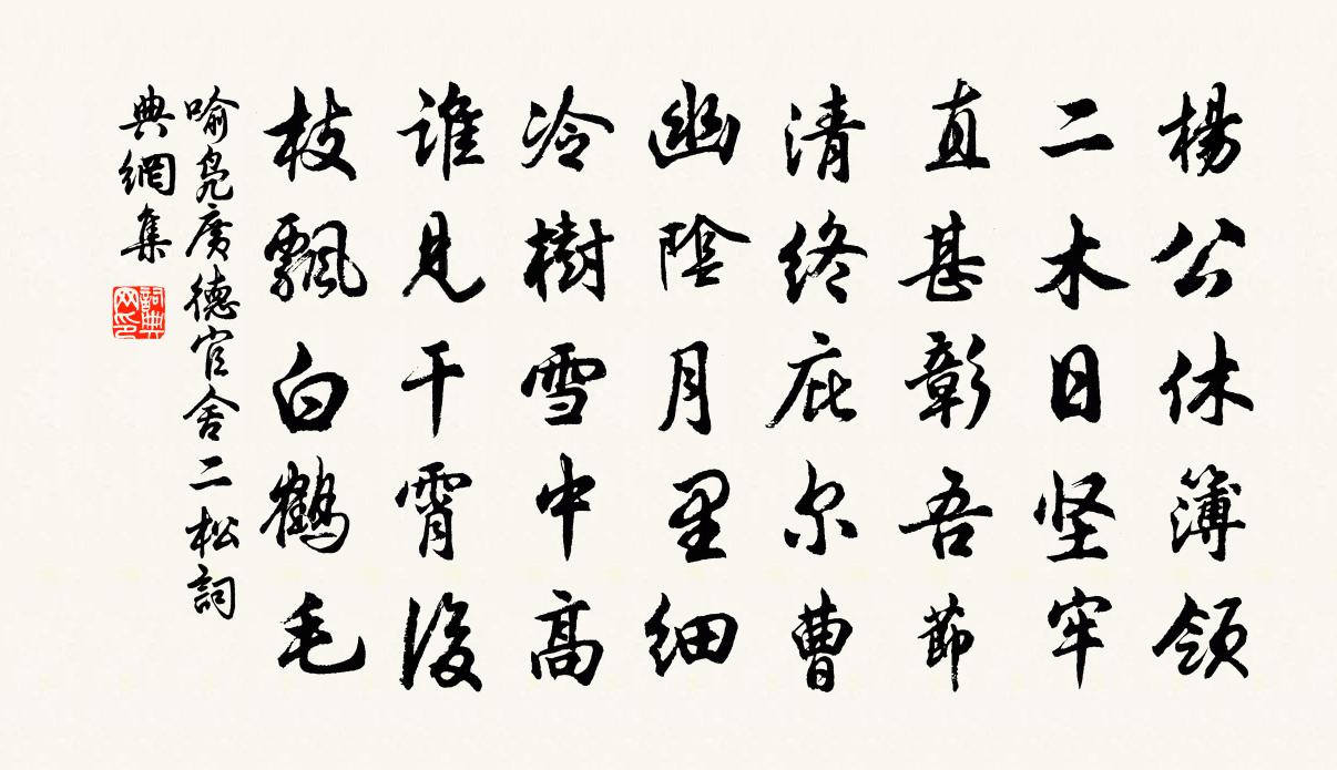 詩詞名句歷史字典書法欣賞書法字典國語詞典說文解字康熙字典古漢語字典標 題 作 者 詩 句 廣德官舍二松作者:喻鳧 朝代:唐代廣德官舍二松原文楊公休簿領,二木日堅牢。直甚彰吾節,清終庇爾曹。幽陰月里細,冷樹雪中高。誰見乾霄後,枝飄白鶴毛。詩詞問答問:廣德官舍二松的作者是誰?答:喻鳧問:廣德官舍二松寫於哪個朝代?答:唐代問:廣德官舍二松是什麼體裁?答:五律喻鳧廣德官舍二松書法欣賞廣德官舍二松書法作品注釋全唐詩:卷543-13詩詞推薦雙林寺周弼〔宋代〕杳杳雙林路,林深不易登。寺幽憐宿鳥,地僻喜閒僧。靜徹垂梁板,寒銷背壁燈。水邊人忽笑,猿落過溪藤。聽蟬趙嘏〔唐代〕噪蟬聲亂日初曛,弦管樓中永不聞。爭奈愁人數莖發,故園秋隔五湖雲。憶舊遊(落梅賦)周密〔宋代〕念芳鈿委路,粉浪翻空,誰補春痕。佇立傷心事,記宮檐點鬢,候館沾襟。東君護香情薄,不管徑雲深。嘆金谷樓句邵伯溫〔宋代〕屈原宅畔惠蘭怨,神女祠邊雲雨愁。寇相公生辰因有寄獻魏野〔宋代〕宋朝元老更誰先,已詠功成二十年。好去上天辭將相,歸來平地作神仙。坐看雲岫資閒興,臥聽霓裳引醉眠。多少初秋夜嘆曾豐〔宋代〕仿佛蟾蜍影,蕭然蟋蟀聲。秋隨桐葉倒,心與鬢毛驚。舊出斑無數,新添白幾莖。百年成底事,攬鏡若為情。滿江紅汪莘〔宋代〕唐宋諸公,誰道得、梅花親切。到和靖、先生詩出,古人俱拙。寫照乍分清淺水,傳神初付黃昏月。盡後來、作者重阜崔嵬行釋文珦〔宋代〕重阜何崔嵬,遙瞻北邙路。曠野無人居,高低盡丘墓。不知古與新,落落似棋布。下有荒草叢,上有白楊樹。樹頂蕭山李宰君北亭即事趙湘〔唐代〕掃灑仍聞屬意勞,繞池生蘚不生蒿。敲花雨過琴弦潤,吹竹風來鶴語高。窗里樹光清著枕,硯中山色冷趨毫。何人太碩人潘氏輓詞樓鑰〔宋代〕玉映清心著壺彜,閨房賓敬到齊眉。豈惟山水協高趣,更為國家生好兒。萬口共推諸福備,八旬猶負一年期。伯仁太常引馬熙〔元代〕園中風物水中亭。消得兩娉娉。濁酒卷荷傾。早洗盡、箏聲笛聲。四堤晴柳,一天花氣,付與晚山青。飛絮挾雲輕臨刈旱苗鄭剛中〔宋代〕我懷高臥心,而為貧所迫。挽我赴塵賤,動與幽趣隔。磽田能幾何,旱穗正容摘。豈便得收斂,半屬租程客。分爭贈人二首(一作贈工部郎中)王建〔唐代〕金爐煙里要班頭,欲得歸山可自由。每度報朝愁入閣,在先教示小千牛。多在蓬萊少在家,越緋衫上有紅霞。朝回簡林公似五邁〔宋代〕窮猿不擇木,祥鳳宜棲竹。高門結駟榮,陋巷一瓢足。仕有時為貧,貧乃急於祿。夫君何所欠,百事盡從欲。新諧善泉池楊備〔宋代〕影浸龍樓徹鳳城,昭明有意在澄清。穿時深欲狀溟渤,樂府當歌重潤聲。蕭宅二三子贈答詩二十首馬蘭請客盧仝〔唐代〕蘭蘭是小草,不怕郎君罵。願得隨君行,暫到嵩山下。暮春詞釋行海〔宋代〕春風盪槳落花時,江鼓冬冬舞柘枝。雨洗櫻紅蠶豆綠,金衣公子可憐誰。樂全先生生日以鐵拄杖為壽二首蘇軾〔宋代〕先生真是地行仙,住世因循五百年。每向銅人話疇昔,故教鐵杖斗清堅。入懷冰雪生秋思,倚壁蛟龍護晝眠。遙想南嶽聖業寺禹柏陳傅良〔宋代〕久與林壑居,所見皆眾穉。豈無壽千年,未有此柏異。壯而嘗參天,晚乃但仆地。定非風雨摧,殆是斤斧棄。其本端午內中帖子詞太上皇后閣王珪〔唐代〕漢殿炎風少,輕涼已動衣。每來觀織室,不許夜停機。名句推薦好名羈行,重利無虧。來俊臣《羅織經·保身卷第七》 高樓目盡欲黃昏,梧桐葉上蕭蕭雨。晏殊《踏莎行·碧海無波》 看萬山紅遍,層林盡染;漫江碧透,百舸爭流。 * 《沁園春·長沙》 知文德武功,蓋因時而並用魏徵《隋書·列傳·卷三十二》 故人何不返,春華復應晚。柳惲《江南曲》 蟬鳴空桑林,八月蕭關道。王昌齡《塞下曲四首》 特君不以為政,而士不以為行故也。墨子《墨子·15章 兼愛(中)》 人悄悄,簾外月朧明。岳飛《小重山·昨夜寒蛩不住鳴》 去年東武今夕,明月不勝愁。蘇轍《水調歌頭·徐州中秋》 記年時、舊宿淒涼,暮煙秋雨野橋寒。吳文英《霜花腴·重陽前一日泛石湖》