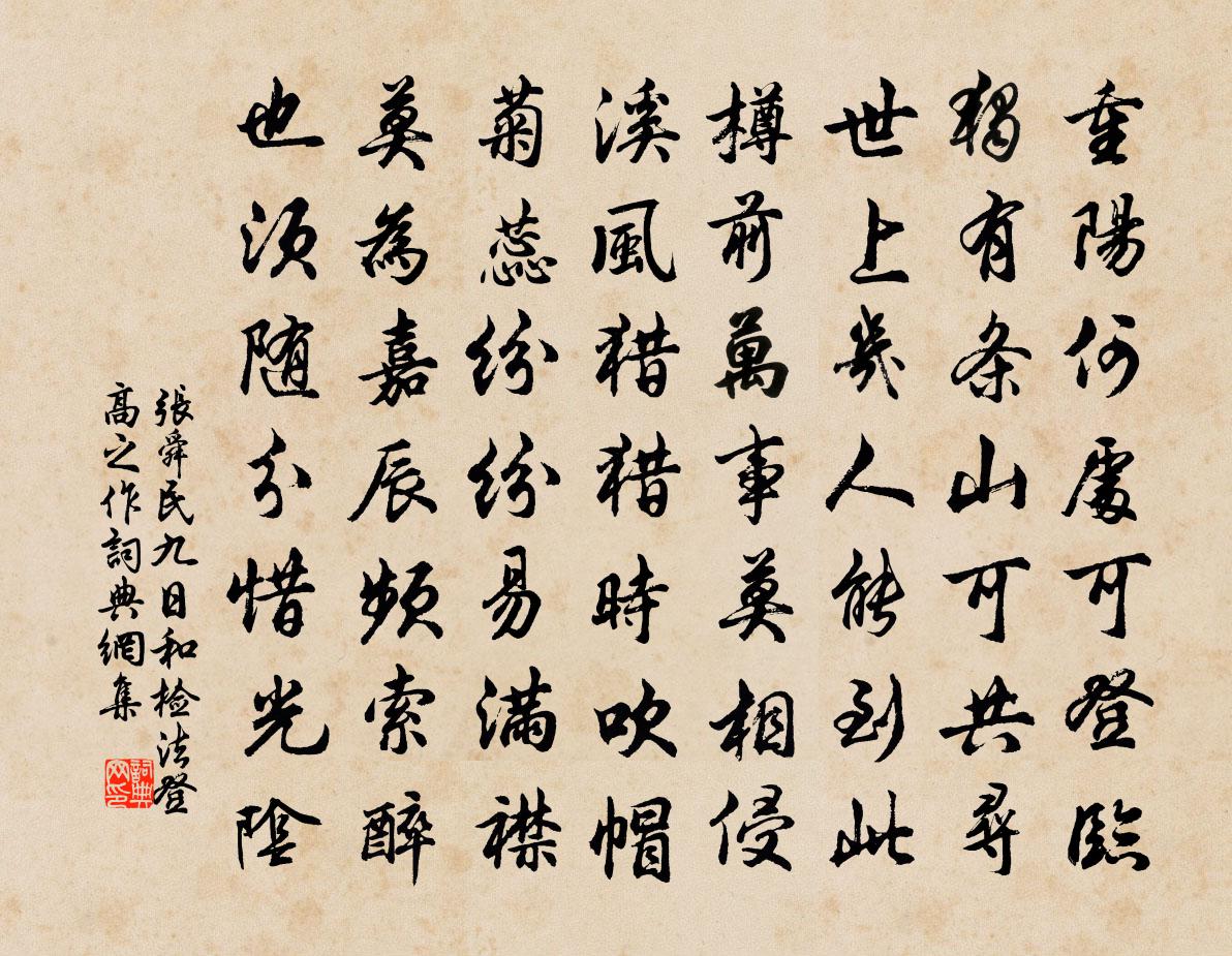 詩詞名句歷史字典書法欣賞書法字典國語詞典說文解字康熙字典古漢語字典標 題 作 者 詩 句 九日和檢法登高之作作者:張舜民 朝代:宋代九日和檢法登高之作原文重陽何處可登臨,獨有條山可共尋。世上幾人能到此,樽前萬事莫相侵。溪風獵獵時吹帽,菊蕊紛紛易滿襟。莫為嘉辰頻索醉,也須隨分惜光陰。詩詞問答問:九日和檢法登高之作的作者是誰?答:張舜民問:九日和檢法登高之作寫於哪個朝代?答:宋代張舜民九日和檢法登高之作書法欣賞九日和檢法登高之作書法作品詩詞推薦與高安劉丞游大愚觀壁間兩蘇先生詩陸游〔宋代〕野性縱壑魚,官身墜阱虎。適得建溪春,頗意松下釜。微霜初變寒,短景已過午。佳客能聯翩,老宿相勞苦。懷哉次韻張子華寄示正月四日與其兄及俞叔可兄弟陳著〔宋代〕兩家昆季賀正來,投轄留連肯放回。恰第四朝春正好,合三百歲老相語。有光西洛菜羹社,同醉東坡蕉葉杯。何似詠芙蓉與菊花杜范〔宋代〕秋光濃欲滴,結束東籬花。糝糝紛點綴,戢戢相參差。淵明太好事,言樂酌流霞。誰雲制頹齡,為與霜爭華。映水嵩山十志十首樾館盧鴻一〔唐代〕紫岩隈兮青谿側,雲松煙蔦兮千古色。芳靃蘼兮蔭蒙蘢,幽人構館兮在其中。靃蘼蒙蘢兮開樾館,臥風霄兮坐霞旦水調歌頭廖行之〔宋代〕黃色起犀表,紫綬照金章。兩朝耆德,應是南國舊龔黃。曾上方壺蓬島,萬里鯨波不作,炎海賴清涼。緩造鵷鴻地香林四首陳與義〔宋代〕絕愛公家花氣新,一林清露百般春。是中宴坐應容我,只恐微風喚起人。皇雅十首《帝制》五章尹洙〔宋代〕帝謀公卿,列侯庶校。鹹曰彼心,暴戾陰狡。既擾我疆,複利吾寶。無若勵兵,襲其還道。癸犯人日送李千秋還杭牟巘五〔宋代〕喜聞罨畫初回棹,便拎共公吟過春。何事客鄉還送客,今朝人日更愁人。風吹杯麵梅花老,路轉裙腰草色新。只恐梅雨五絕范成大〔宋代〕乙酉甲申雷雨驚,乘除卻賀芒種晴。插秧先插蚤秈稻,少忍數旬蒸米成。和胡侍郎見簡楊萬里〔宋代〕花邊雪裡捻霜髭,怪底詩來妙一時。聊復小吟開後悟,便應大用到前疑。先生此曲難先和,著句如棋且著持。每望箜篌張祜〔唐代〕星漢夜牢牢,深簾調更高。亂流公莫度,沉骨嫗空嗥。向月輕輪甲,迎風重紉條。不堪聞別引,滄海恨波濤。送鄭主簿泰興解官歸四明陳傅良〔宋代〕師友於今說鄭鄉,親庭分付舊行藏。但知職分宜棲棘,盡把聲名屬憩棠。一字未曾緣薦墨,扁舟才可著詩囊。問津和劉後村梅花百詠方蒙仲〔宋代〕純是沉檀和乳麝,許多珠瓅間金塊。素娥親搗攤成片,玉帝閒遊撒下來。山鬼謠·問何年辛棄疾〔宋代〕雨岩有石,狀怪甚,取《離騷》《九歌》,名曰“山鬼”,因賦《摸魚兒》,改今名。問何年、此山來此?西風落秋日早起楊萬里〔宋代〕雞鳴鍾未鳴,不知鄉晨否。起來恐驚眾,未敢啟戶牖。殘燈吐芒角,上下雨銀帚。定眼試諦觀,散作飛電走。滿路花(仙呂思情)周邦彥〔宋代〕簾烘淚雨乾,酒壓愁城破。冰壺防飲渴,培殘火。朱消粉退,絕勝新梳里。不是寒宵短,日上三竿,殢人猶要同臥春二首佚名〔宋代〕褭褭東風吹水國,金鴉影暖南山北。蒲抽小劍割湘波,柳拂長眉舞春色。白銅堤下煙蒼蒼,林端細蕊參差香。綠桑游龍門分題十五首下山歐陽修〔宋代〕行歌翠微里,共下山前路。千峰返照外,一鳥投岩去。渡口晚無人,系舸芳洲樹。謝潘端叔惠紅梅樓鑰〔宋代〕黃姑曾為點冰肌,亦有緇塵染素衣。何似煙脂天賜與,暗香猶在是耶非。少馮約同趙伯山飲贈伯山吳則禮〔宋代〕頃聞趙伯山,亦復喔其詩。今者得會面,真能解人頤。往時黃宜州,句法天下奇。平生老婆相,不救枯腸鎧。或架名句推薦自笑好山如好色,只今懷樹更懷人。閒愁閒恨一番新。辛棄疾《浣溪沙·偕叔高子似宿山寺戲作》 燒痕慘澹帶昏鴉,數盡寒梅未見花。陳孚《詠永州》 傷心橋下春波綠,曾是驚鴻照影來。陸游《沈園二首》 雲鎖嫩黃煙柳細,風吹紅蒂雪梅殘。閻選《八拍蠻·雲鎖嫩黃煙柳細》 重重蕊葉相憐,似青帔艷妝神仙侶。曹勛《夾竹桃花·詠題》 治大者不治細,成大功者不成小列子及其弟子《列子·楊朱》 善欲人見,不是真善;惡恐人知,便是大惡。朱柏廬《朱子家訓·全文》 琴書倦,鷓鴣喚起南窗睡。謝逸《千秋歲·詠夏景》 休說鱸魚堪膾,盡西風,季鷹歸未?辛棄疾《水龍吟·登建康賞心亭》 學之染人,甚於丹青。房玄齡《晉書·列傳·第五十二章》