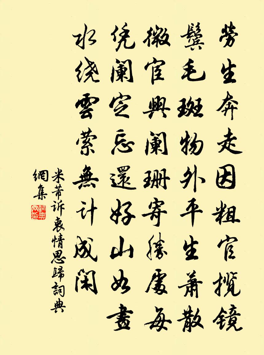 詩詞名句歷史字典書法欣賞書法字典國語詞典說文解字康熙字典古漢語字典標 題 作 者 詩 句 訴衷情(思歸)作者:米芾 朝代:宋代訴衷情(思歸)原文勞生奔走因粗官。攬鏡鬢毛斑。物外平生蕭散,微宦興闌珊。寄勝處,每憑闌。定忘還。好山如畫,水繞雲縈。無計成閒。詩詞問答問:訴衷情(思歸)的作者是誰?答:米芾問:訴衷情(思歸)寫於哪個朝代?答:宋代米芾訴衷情(思歸)書法欣賞訴衷情(思歸)書法作品詩詞推薦秋日登郡樓二首蔡襄〔宋代〕落葉隨飛鳥,疏砧答暮蟬。悠悠戍樓角,悽切萬家傳。寄懶庵胡仲參〔宋代〕天寒花日短道路花長,白雲飛處知吾鄉。大江之東渭之北,念我故人何可忘。別來楊柳春依依,只今開到梅花香。題奣岩何揚祖〔宋代〕石室何時霹靂開,曾聽繡斧凱歌回。誰知二百餘年後,復有旌旗笳鼓來。行路難·其一李白〔唐代〕金樽清酒斗十千,玉盤珍羞直萬錢。(羞 通:饈;直 通 值)停杯投箸不能食,拔劍四顧心茫然。欲渡黃河冰山中玩物雜言十首戴表元〔宋代〕野草散高林,雀鼠食之宜。設非人所殘,一顆不敢窺。寧由網罻防,亦無伸物司。食道固當爾,雀鼠猶有天。法駕導引(三之二)陳與義〔宋代〕東風起,東風起,海上百花搖。十八風鬟雲半動,飛花和雨著輕綃。歸路碧迢迢。題太白山隱者項斯〔唐代〕高居在幽嶺,人得見時稀。寫籙扃虛白,尋僧到翠微。掃壇星下宿,收藥雨中歸。從服小還後,自疑身解飛。【中呂】山坡羊_春日二首芙張可久〔元代〕春日二首芙蓉春帳,葡萄新釀,一聲《金縷》槽前唱。錦生香,翠成行,醒來猶問春無恙,花邊醉來能幾場?妝,獄中貽姚張薛李鄭柳諸公儲光羲〔唐代〕直道時莫親,起羞見讒口。輿人是非怪,西子言有咎。誣善不足悲,失聽一何醜。大來敢遐望,小往且虛受。中夜再次韻呈林子長郎中二首陳造〔宋代〕二嘆熟君朱弦音,可但文價高儒林。課聞安仁最花縣,車想召伯駐棠陰。詩壇自昔隱一敵,意匠超忽陵高深。補袞送張剛中赴省趙蕃〔宋代〕王都觀闕兩巍巍,遠道觀光亦已稀。當念功名方發軔,可辭塵士暫侵衣。春風咫尺君得意,晚歲伶仃我欲歸。儻過望江南/憶江南陳朴〔宋代〕形透日,七轉任飛騰。幽入深岩圖宴坐,息無來去使神凝。卻粒著奇能。生神火,返本氣清澄。九候浴時開地戶,和子瞻記夢二首蘇轍〔宋代〕蟋蟀感秋氣,夜吟抱菊根。霜降菊叢折,寸根安可存。耿耿荒苗下,唧唧空自論。不敢學蝴蝶,菊盡兩翅翻。蟲凍十二峰起雲閻伯敏〔宋代〕釵頭嫋嫋山花枝,裙尾舊纈山 * 。朝隨雲起採薪去,莫趁女伴穿雲歸。木蘭花(探梅寄李士舉)朱敦儒〔宋代〕前日尋梅椒樣綴。今日尋梅蜂已至。乍開絳萼欲生香,略綻粉苞先有意。古人今日升沈異。定是江南無驛使。自調泉南道中陳宓〔宋代〕乍寒忽暖初冬候,已熟慵收大有年。社鼓呼人鳴坎坎,山童待月舞躚躚。旅行可飽魚蝦味,疾步不驚雞犬眠。外戶題點易婁君復王義山〔宋代〕伏羲先天易,其初一太極。太極生陰陽,陰陽各有畫。濂溪何所傳,妙得於太極。極上作一圈,一圈只是白。伏羲漕渠春台宋庠〔宋代〕縹陂春色極晴虛,新水遙連六輔渠。沙上釣歸人獲鷸,梁邊觀罷客知魚。蒼浮樹影煙生後,紅皺溪紋日側初。刮目卜運算元朱敦儒〔宋代〕古澗一枝梅,免被園林鎖。路遠山深不怕寒,似共春相趓。幽思有誰知,托契都難可。獨自風流獨自香,明月來尋煙雨樓夜坐樓鑰〔宋代〕暮靄橫空黯未收,晚來涼動滿懷秋。澹雲影里千山月,殘角聲中百尺樓。參坐共為文字飲,高談不見古念愁。夜闌名句推薦半壁見海日,空中聞天雞。李白《夢遊天姥吟留別 / 別東魯諸公》 擁紅妝,翻翠蓋,花影暗南浦。高觀國《祝英台近·荷花》 那裡有鬧紅塵香車寶馬?祗不過送黃昏古木寒鴉。王磐《古蟾宮·元宵》 八佾舞於庭,是可忍也,孰不可忍也?孔子弟子《論語·八佾篇》 燕子飛來窺畫棟,玉鉤垂下簾旌。歐陽修《臨江仙·柳外輕雷池上雨》 當知器滿則傾,須知物極必反。程登吉《幼學瓊林·卷三·人事》 滿腹詩書漫古今,頻年流落易傷心。宇文虛中《在金日作·選二》 常有江南船,寄書家中否。王維《雜詩三首》 碧蕪千里思悠悠,惟有霎時涼夢、到南州。李廌《虞美人·玉闌乾外清江浦》 梨花自寒食,進節只愁余。楊萬里《寒食上冢》