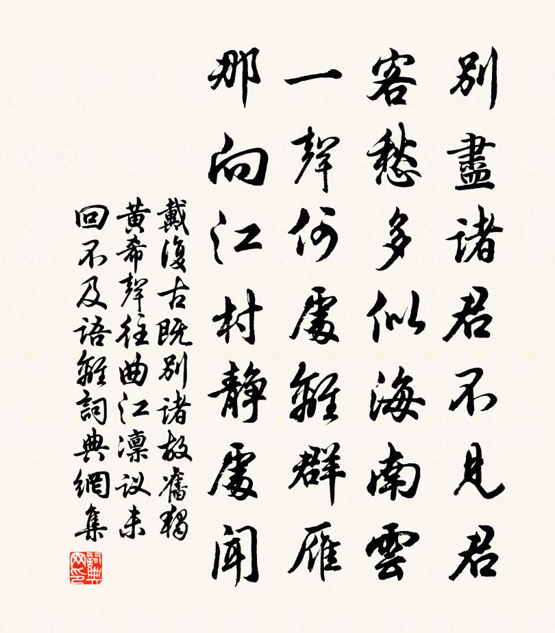 詩詞名句歷史字典書法欣賞書法字典國語詞典說文解字康熙字典古漢語字典標 題 作 者 詩 句 既別諸故舊獨黃希聲往曲江凜議未回不及語離作者:戴復古 朝代:宋代原文別盡諸君不見君,客愁多似海南雲。一聲何處離群雁,那向江村靜處聞。詩詞問答問:《既別諸故舊獨黃希聲往曲江凜議未回不及語離》的作者是誰?答:戴復古問:該詩寫於哪個朝代?答:宋代問:戴復古的名句有哪些?答:戴復古名句大全書法欣賞既別諸故舊獨黃希聲往曲江凜議未回不及語離書法作品詩詞推薦水龍吟(游釣台作)葛立方〔宋代〕九州雄傑溪山,遂安自古稱佳處。雲迷半嶺,風號淺瀨,輕舟斜渡。朱閣橫飛,漁磯無恙,鳥啼林塢。吊高人陳跡宿欒城驛卻寄常山張書記杜荀鶴〔唐代〕一更更盡到三更,吟破離心句不成。數樹秋風滿庭月,憶君時復下階行。和程德裕頌五首黃庭堅〔宋代〕山河大地目前機,棋按吹毛更不疑。萬里無人無寸草,凍山亭上與誰欺。贈陸冰蕭崱〔宋代〕標格真清挾雪霜,母聽新詠覺神傷。茶分鴻漸經中味,菊愛龜蒙賦時香。圃積玉多知學飽,囊裝金少為貪忙。向來雨寒楊時〔宋代〕天幕陰雲積,蕭蕭雨正霪。泥污關市寂,水入御溝深。破屋寒侵骨,哀弦凍絕音。更愁風力健,瘦怯不能禁。新秋同盧侍御、薛員外白蘋洲月夜皎然〔唐代〕隔暑蘋洲近,迎涼欲泛舟。榮從憲府至,喜會夕郎游。氣奪滄浪色,風欺汗漫流。誰言三伏夜,獨此月前秋。嶺表逢寒食沈佺期〔唐代〕嶺外無寒食,春來不見餳。洛陽新甲子,何日是清明。花柳爭朝發,軒車滿路迎。帝鄉遙可念,腸斷報親情。頌古五十五首釋紹曇〔宋代〕擬學鵬摶九萬風,誰知折翅鳥窠中。至今秦望出前雨,血淚千林花淚紅。瞻禮開師真像蔡襄〔宋代〕輕瀾還故潯,墜軫無遺音。好在池邊竹,猶存虛直心。往復二十年,每見唯清吟。覺性既自如,世味隨浮沈。琅琅牧童黃庭堅〔宋代〕騎牛遠遠過前村,吹笛風斜隔隴聞。多少長安名利客,機關用盡不如君。夏日荊渚書懷齊己〔唐代〕嵩岳去值亂,匡廬回阻兵。中途息瓶錫,十載依公卿。不那猿鳥性,但懷林泉聲。何時遂情興,吟繞杉松行。和曇穎師四明十題丹山洞梅堯臣〔宋代〕山無鳳皇飛,洞有仙人跡。蝙蝠大如鴉,莓苔遍上屐。自慚無道骨,安問緣雲客。浣溪沙陳允平〔宋代〕睡起朦騰小篆香。素紈輕度玉肌涼。竹深荷淨少炎光。雨過亂蟬嘶古柳,日斜雙鷺立閒塘。更將心事自商量。訴衷情晏幾道〔宋代〕渚蓮霜曉墜殘紅,依約舊秋同。玉人團扇恩淺,一意恨西風。雲去住,月朦朧,夜寒濃。此時還是,淚墨書成,未與平甫同賦槐王安石〔宋代〕冰雪泊楚岸,萬株同飄零。春風都城居,初見葉青青。歲行如車輪,蔭翳忽滿庭。秋子今在眼,何時動江舲。建平縣道中項安世〔宋代〕糖甖花開官路香,客子欲歸官路長。稻田水足新秧黃,小麥吐秀南風涼。村村煮酒開官坊,家家禁忌障朁房。門前唐多令(城歸泊湖山)陳著〔宋代〕倦枕寄漁鄉。篷低被怯霜。月窺人、多少思量。自是欲眠眠不穩,禁聽得、雁聲雙。和夢早催行。歸來梅竹窗。小和清汀蔣省乾酒色財氣韻李曾伯〔宋代〕乾坤一枰棋,今古一杯酒。悲哉易水築,陋矣鴻門斗。將軍跨下出,宰相簣中有。唾面使自乾,拭之費人手。蔣實齋出示孟浩然畫像因賦二絕陳鑒之〔宋代〕吟鞭遙指鹿門歸,水色山光件件詩。縮項鯿魚元自好,當年應悔識王維。題陳少陽先生上書稿後趙時瓈〔宋代〕胡馬昔長驅,高屋建瓴水。權奸誤國家,和議甘骫骳。遂令九廟尊,冒沒在棘枳。帶甲百餘萬,一嘯自披靡。堂堂名句推薦休說鱸魚堪膾,盡西風,季鷹歸未?辛棄疾《水龍吟·登建康賞心亭》 東籬把酒黃昏後,有暗香盈袖。李清照《醉花陰·薄霧濃雲愁永晝》 才過斜陽,又是黃昏雨。晏幾道《蝶戀花·笑艷秋蓮生綠浦》 逆其根則伐其本,壞其真矣。佚名《黃帝內經·四氣調神大論》 金樽清酒斗十千,玉盤珍羞直萬錢。李白《行路難·其一》 樹德務滋,除惡務本佚名《尚書·周書·泰誓》 莫道桑榆晚,為霞尚滿天。劉禹錫《酬樂天詠老見示》 日照新妝水底明,風飄香袂空中舉。李白《採蓮曲》 野梅燒不盡,時見兩三花劉基《古戍》 秋霜不惜人,倏忽侵蒲柳。李白《長歌行》