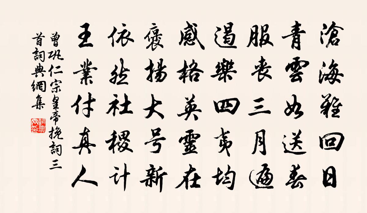 詩詞名句歷史字典書法欣賞書法字典國語詞典說文解字康熙字典古漢語字典標 題 作 者 詩 句 仁宗皇帝輓詞三首作者:曾鞏 朝代:宋代仁宗皇帝輓詞三首原文滄海難回日,青雲如送春。服喪三月遍,遏樂四夷均。感格英靈在,褒揚大號新。依然社稷計,王業付真人。詩詞問答問:仁宗皇帝輓詞三首的作者是誰?答:曾鞏問:仁宗皇帝輓詞三首寫於哪個朝代?答:宋代曾鞏仁宗皇帝輓詞三首書法欣賞仁宗皇帝輓詞三首書法作品詩詞推薦九鎖山十詠蛻龍洞呂同老〔宋代〕蒼山下孱顏,中有神龍棲。神龍眇何許,一水涵清溪。深藏岩壑古,迥破風煙低。當其未蛻時,幽隱漫塵泥。既蛻賦漳南李幾仲安齋詩張元乾〔宋代〕羔豚蒸乳活臠牛,口腹造業夸炰羞。儻知晚食足當肉,一飽何苦多營求。先生睡美黑甜處,那聞鐘鼓朝鳴樓。布衾望多稼亭楊萬里〔宋代〕遙望城頭多稼亭,亭邊霜檜老更青。當年老守攜稚子,芒鞋葵扇繞城行。臘前移梅春插柳,蹋雪沖泥不停手。柳未欲棲烏宋祁〔宋代〕湘竿風急未成棲,御史台前見落暉。桂冷欲依秦氏宿,柳深先望白門歸。迎秋別恨填銀漢,未夜啼聲怨玉徽。悵望蝶戀花(次韓乾夢中韻)袁去華〔宋代〕細雨斜風催日暮。一夢華胥,記得驚人句。霧閣雲窗歌舞處。翠峰青嶂無重數。解佩江頭元有路。流水茫茫,盡日兩監同捨出游和吳監丞韻何澹〔宋代〕我本麋鹿姿,牽來入京闕。舉動違真性,驅馳了歲月。自慚西湖水,照見種種發。乘興陪諸公,放舟煙浪窟。小雨初秋閒記園池草木范成大〔宋代〕醉憐金琖齊側,臥看玉簪對橫。腥水留灌茉莉,結香旋薰素馨。家居復有江湖之興戴復古〔宋代〕寒儒家舍只尋常,破紙窗邊折竹床。接物罕逢人可語,尋春多被雨相妨。庭垂竹葉因思酒,室有蘭花不炷香。到底送張閣老中丞持節冊吊回鶻權德輿〔唐代〕旌旆翩翩擁漢官,君行常得遠人歡。分職南台知禮重,輟書東觀見才難。金章玉節鳴騶遠,白草黃雲出塞寒。欲散清明何應龍〔宋代〕踏歌槌鼓近清明,小雨霏霏欲弄晴。喚起十年心上事,春風樓下賣花聲。再賦荔枝樓陸游〔宋代〕只道文書撥不開,未妨高處獨徘徊。山橫瓦屋披雲出,水自牂牁裂地來。暝入簾陰吹細雨,涼生樓角轉輕雷。痴頑群兒陸游〔宋代〕野行遇群兒,呼笑運甓忙,共為小浮圖,嶙峋當道旁,蜆殼以注燈,碗足以焚香,須臾一哄散,無益亦何傷。古來梅月客廟山厭潤思霽曾豐〔宋代〕雲漫山若沒,海漲地如沉。人已苦卑濕,天猶容眾陰。非關河伯濫,自是雨師淫。上有太陽在,何當一照臨。點絳唇劉一止〔宋代〕洞戶香凝,宴開特地風煙好。靚妝娟妙。玉雪光相照。認是桃源,綠水紅雲繞。真曾到。漾舟人老。應被桃花笑。柳梢青張杜〔宋代〕燕里花深,鷺汀雲澹,客夢江皋。日日言歸,淮山笑我,塵鎖征袍。幾回把酒憑高。闌乾外、魂飛暮濤。只有南園偈頌二十九首釋雲〔宋代〕佛是塵,法是塵,區區馳覓謾勞謾。向道莫行山下路,果然猿叫斷腸聲。病起偶書強至〔宋代〕病眠官舍趣方高,強起區區視冗曹。當世纖機漫蝸角,除身萬事盡鴻毛。田園歸去古稱達,軒冕儻來人自勞。汩沒晚步吳故城下范成大〔宋代〕意行殊不計榛菅,風袖飄然勝羽翰。拄杖前頭雙雉起,浮圖絕頂一雕盤。醉紅匝地斜曛暖,熨練涵空漲水寒。卻向句賴仙翁〔宋代〕一條丁水銅魚塞,三十年來舊相識。巧妙四山雲岫落,玲瓏雙甑月燈明。寶山流連井,久立方知省。南歌子(四月二十六日集客臨芳觀)葉夢得〔宋代〕麥隴深初轉,桃溪曲漸成。綠槐重疊午陰清。更有榴花一朵、照人明。畫棟清微暑,疏簾入晚晴。請君坐待縠紋平名句推薦桂林之一枝,崑山之片玉。房玄齡《晉書·列傳·第二十二章》 待人寬一分是福,利人實利己的根基。洪應明《菜根譚·概論》 莊生曉夢迷蝴蝶,望帝春心托杜鵑。李商隱《錦瑟》 山黛遠,月波長,暮雲秋影蘸瀟湘。蔡松年《鷓鴣天·賞荷》 江深竹靜兩三家,多事紅花映白花。杜甫《江畔獨步尋花七絕句》 興天下之利,除天下之害。墨子《墨子·12章 尚同(中)》 何事非相思,江上葳蕤竹。吳均《登二妃廟》 野曠天清無戰聲,四萬義軍同日死。杜甫《悲陳陶》 主失其神,虎隨其後。主上不知,虎將為狗。韓非及後人《韓非子·揚權》 長於春夢幾多時,散似秋雲無覓處。晏殊《木蘭花·燕鴻過後鶯歸去》