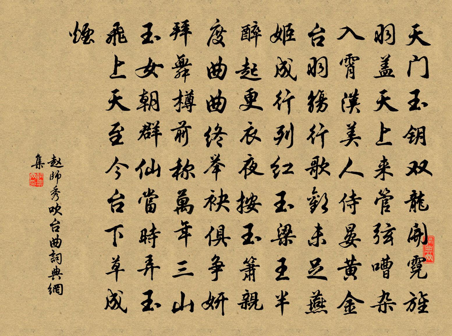 詩詞名句歷史字典書法欣賞書法字典國語詞典說文解字康熙字典古漢語字典標 題 作 者 詩 句 吹台曲作者:趙師秀 朝代:宋代吹台曲原文天門玉鑰雙龍開,霓旌羽蓋天上來。管弦嘈雜入霄漢,美人侍晏黃金台。羽觴行歌歡未足,燕姬成行列紅玉。梁王半醉起更衣,夜按玉簫親度曲。曲終舉袂俱爭妍,拜舞樽前稱萬年,三山玉女朝群仙。當時弄玉飛上天,至今台下草成煙。詩詞問答問:吹台曲的作者是誰?答:趙師秀問:吹台曲寫於哪個朝代?答:宋代趙師秀吹台曲書法欣賞吹台曲書法作品詩詞推薦安樂窩中吟邵雍〔宋代〕安樂窩中設不安,略行湯劑自能痊。居常無病不服藥,就使有災宜俟天。理到昧時須索講,情於盡處更何言。自餘晁子西寄詩謝酒,自言其家數有逝者,詞意悲范成大〔宋代〕我讀晁子詩,十語九慨傷。長川日夜逝,鬢髮空蒼浪。君家出世學,無生亦無亡。鄉謂法幢立,何乃槁木僵起滅不出戶魏野〔宋代〕出戶下莎庭,徘徊當踏青。靜嫌鶯斗舌,閒愛鶴梳翎。雲好昂頭望,松宜側耳聽。便堪為導列,誰信可延齡。孟浩然雪驢圖方回〔宋代〕往年一上岳陽樓,西風倏忽四十秋。詩牌高掛詩兩首,他人有詩誰敢留。其一孟浩然,解道氣吞雲夢澤。其二杜子緣識宋太宗〔宋代〕遙觀極自望雲頭,碧海波澄瑞日浮。霞彩連天長不斷,須憑仙子敘蹤由。題楊克儉池館何昌齡〔唐代〕經旬因雨不重來,門有蛛絲徑有苔。再向白蓮亭上望,不知花木為誰開。虎號南山黃庭堅〔宋代〕一章虎號南山,北風雨雪。百夫莫為,其下流血。相彼 * ,幾何不虎。父子相戒,是將食汝。二章伊彼大吏,易送松麓李應龍彝甫攜阿潁鵬升參學姚勉〔宋代〕老龍本自天門出,躍入璧池聊換骨。鵬雛夭矯更不凡,平視南溟渺東渤。玉京道上五年前,曾見鱗翮雙飛天。只今題儀真致政孫學士歸來亭王安石〔宋代〕彭澤陶潛歸去來,素風千歲出塵埃。明時儁老心無累,故里高門子有才。更作園林負城郭,常留花月映池台。卻尋挽程朝議二首吳芾〔宋代〕憶昔安輿到郡時,使君歡迓鎮江湄。萬人踴躍瞻耆艾,千里歌謠美孝慈。盛德所鍾門閥在,平生無愧鬼神知。佳城曉別白居易〔唐代〕曉鼓聲已半,離筵坐難久。請君斷腸歌,送我和淚酒。月落欲明前,馬嘶初別後。浩浩暗塵中,何由見回首?黃天盪張憲〔元代〕昆明劫燒成灰火,臨平葑湖撥不開。黃泥萬頃下無底,海眼一絲通往來。南徐江邊海鰌走,江神頓足黃龍吼。便翻明發祈門悟法寺,溪行險絕六首楊萬里〔宋代〕右緣絕壁左深溪,頭上春霖腳底泥。溪里仰看應落膽,閉窗關轎不教知。減字木蘭花·送趙令蘇軾〔宋代〕春光亭下。流水如今何在也。歲月如梭。白首相看擬奈何。故人重見。世事年來千萬變。官況闌珊。慚愧青松守歲暑退姜特立〔宋代〕歸臣林間十二春,心安日日是良辰。家居佛界清涼國,人住仙宮自在身。無事入山尋阮客,有時擊壤助堯民。雖無伍子胥廟李廌〔宋代〕烈士可廟食,么麽可悲夫。誓心報荊郢,忍恥適江吳。功成期牖下,旋聞賜屬鏤。楚邦乃怨耦,宿憤向已攄。濤江寄禮導師釋希雅〔宋代〕掩關名自遠,鯨浪阻相尋。講罷唯澄慮,孤峰只此心。柏煙秋榻靜,蓮漏夜堂深。盡仰鄞江上,清風繼道林。送范道卿赴省試晁公溯〔宋代〕君之先世真文雄,異時奏賦蓬萊宮。誰傳副墨過沙漠,至今猶稱長嘯公。芝蘭不乏後來秀,謂將褎然為舉首。至音地黃蘇軾〔宋代〕地黃飼老馬,可使光鑒人。吾聞樂天語,喻馬施之身。我衰正休櫪,垂耳氣不振。移栽附沃壤,蕃茂爭新春。瀋水臨江仙·探梅辛棄疾〔宋代〕老去惜花心已懶,愛梅猶繞江村。一枝先破玉溪春。更無花態度,全有雪精神。剩向空山餐秀色,為渠著句清新。名句推薦愛之欲其生,惡之欲其死。釋原妙《偈頌六十七首》 野幕敞瓊筵,羌戎賀勞旋。盧綸《和張僕射塞下曲·其四》 待到黃昏月上時,依舊柔腸斷。程垓《卜運算元·獨自上層樓》 不知戒,後必有,恨後遂過不肯悔,讒夫多進荀子《荀子·成相》 焦首朝朝還暮暮,煎心日日復年年。曹雪芹《紅樓夢·第二十二回》 野棠花落,又匆匆過了,清明時節。辛棄疾《念奴嬌·書東流村壁》 息徒蘭圃,秣馬華山。嵇康《贈秀才入軍·其十四》 何時詔此金錢會,暫醉佳人錦瑟旁。杜甫《曲江對雨》 天闕象緯逼,雲臥衣裳冷杜甫《游龍門奉先寺》 一日萬機,一人聽斷,雖復憂勞,安能盡善?吳兢《貞觀政要·卷二·論求諫》