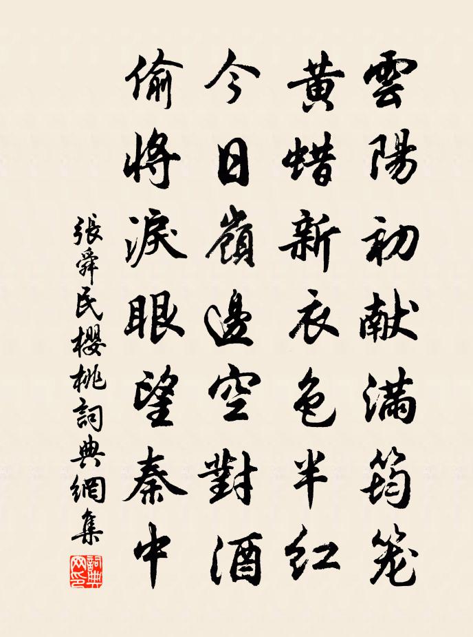 詩詞名句歷史字典書法欣賞書法字典國語詞典說文解字康熙字典古漢語字典標 題 作 者 詩 句 櫻桃作者:張舜民 朝代:宋代櫻桃原文雲陽初獻滿筠籠,黃蠟新衣色半紅。今日嶺邊空對酒,偷將淚眼望秦中。詩詞問答問:櫻桃的作者是誰?答:張舜民問:櫻桃寫於哪個朝代?答:宋代張舜民櫻桃書法欣賞櫻桃書法作品詩詞推薦已亥雜詩 69龔自珍〔清代〕吾祖平生好孟堅,丹黃鄭重萬珠圓。不才竊比劉公是,請肄班香再十年。冬日即事王炎〔宋代〕曝背茅檐下,驅寒得曉晴。杜門來客少,開卷此心清。晦跡存吾道,端居閱世情。南山無改色,相對免將迎。水仙廖行之〔宋代〕擢擢瓊簪秀,盈盈玉頰新。隴梅真季孟,洛浦是精神。好在臨江佩,遙憐步月塵。對花惱詩思,何必霅溪蓴。招王微之韓維〔宋代〕龍圖老學士,腰痛比如何。久闋新詩和,應尋曲舊歌。梅紅輕綻萼,池綠細生波。欲與君同醉,春風試舞羅。玉盤盂楊萬里〔宋代〕旁招近侍自江都,兩歲何曾見國姝。看盡滿欄紅芍藥,只消一朵玉盤盂。水精淡白非真色,珠璧空明得似無。欲比清平樂 壽趙總管蒲道源〔元代〕相門華胄。勳業誰居右。且向人間涵養就。鼎軸青氈依舊。*延遺愛尤思。梁州新政方宜。處處邦民香火,祝君千句滕元發〔宋代〕負鼎早為湯右相,有文今作魯夫人。紀愁晃沖之〔宋代〕北風吹我裳,夏潦漂我屋。牛羊踐我稼,雀鼠耗我谷。雪寒附我指,雨 * 疾我腹。朝行桑榆間,秋序傷遠目。莫次韻李大著春日雜詩十首喻良能〔宋代〕二載違枌社,全家客帝都。濁醪充上頓,清俸付中廚。親老唯須養,皇恩詎敢孤。逍遙處山澤,未忍學仙臞。旅中雜興五首趙蕃〔宋代〕炯炯冰玉姿,落落山林相。問渠坐何事,斬伐傷神王。更加束縛之,求市朱門傍。渠雖不解言,我為成惆悵。鷓鴣引 為耶律總管太夫人壽王惲〔元代〕遼海千年將相家。婺星光動赤城霞。回首畫戟清香地,滿意春風玉樹花。金椅背,紫雲車。謝林風度見來賒。壽波漁父詞趙孟頫〔元代〕渺渺煙波一葉舟。西風落木五湖秋。盟鷗鷺,傲王侯。管甚鱸魚不上五龍六首佚名〔宋代〕靈之智兮,躍漢潛幽。欲前擾兮,無董興劉。陳金石兮,佐侑牢羞。庶燕享兮,澤應民求。和王祭酒太社宿齋,不得赴李尚書宅會,戲書見寄權德輿〔唐代〕元禮門前勞引望,句龍壇下阻歡娛。此時對局空相憶,博進何人更樂輸。宿洞真觀呈盧竹溪陳著〔宋代〕傍家新築好,儒道不相妨。松火客床夢,梅花詩屋香。欲盟六逸醉,始托四明狂。高視黃塵表,翛然何有鄉。夜夢遇老人於松石間若舊嘗從其游者再拜敘間陸游〔宋代〕遼海曾從化鶴丁,百年塵土污巾瓶。萬山深處遇行李,再拜起時如醉醒。綠樹岩前開藥笈,白驢背上指丹經。雲霄暨陽居四首王令〔宋代〕出無王事牽,入不治居舍。蒿藜入牆屋,塵垢變幾架。糟糠苟無憂,智力取自暇。逢詩即廢日,得客輒忘夜。積懶天香(對梅花懷王侍御)劉鎮〔宋代〕漠漠江皋,迢迢驛路,天教為春傳信。萬木叢邊,百花頭上,不管雪飛風緊。尋交訪舊,惟翠竹、寒松相認。不意太守林太博贈瑞香花劉克莊〔宋代〕吟諷攀翻到月斜,眾驚奇寶聚貧家。高才盍視宮中草,退士聊看屋角花。未必園丁諳樹性,更愁墨客笑姜芽。畫堂次韻和吳侍郎和沖卿寄來詩二首宋庠〔宋代〕暫息塵機不為年,高風聊借九區傳。周聃漢朔誰能測,且作清時吏隱仙。名句推薦鳥啼官路靜,花發毀垣空。張繼《清明日自西午橋至瓜岩村有懷》 明月出天山,蒼茫雲海間。李白《關山月》 行坐深閨里。懶更妝梳,自知新來憔悴。杜安世《鶴沖天·清明天氣》 南國辛居士,言歸舊竹林孟浩然《都下送辛大之鄂》 世間花葉不相倫,花入金盆葉作塵。李商隱《贈荷花》 孤雁飛南遊,過庭長哀吟。曹植《雜詩六首·其一》 渭城朝雨浥輕塵,客舍青青柳色新。王維《渭城曲 / 送元二使安西》 有悵寒潮,無情殘照,正是蕭蕭南浦柳如是《金明池·詠寒柳》 離愁漸遠漸無窮,迢迢不斷如春水。歐陽修《踏莎行·候館梅殘》 何處秋風至?蕭蕭送雁群。劉禹錫《秋風引》