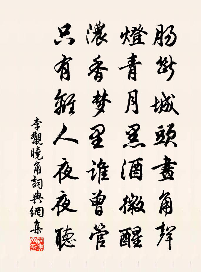 詩詞名句歷史字典書法欣賞書法字典國語詞典說文解字康熙字典古漢語字典標 題 作 者 詩 句 曉角作者:李覯 朝代:宋代曉角原文腸斷城頭畫角聲,燈青月黑酒微醒。濃香夢裡誰曾管,只有離人夜夜聽。詩詞問答問:曉角的作者是誰?答:李覯問:曉角寫於哪個朝代?答:宋代李覯曉角書法欣賞曉角書法作品詩詞推薦九月初四日大風雨近重陽無酒夜成二首方回〔宋代〕秋霖欲洗庾公塵,不管樓頭客恨新。塞雁又為江左客,菊花曾識晉時人。百年虛谷先生老,一紀嚴州太守貧。幾向宿文殊院呈孫子和二絕張耒〔宋代〕朱樓簾卷見天涯,倦客倚欄何所思。新月無情明復落,清簫有恨歇還吹。偈頌四十二首釋祖先〔宋代〕暑威尚熾,喜見新秋。潘閬倒騎驢子,梵志翻著襪頭。堪悲堪笑,自唱自酬。有時乘好月,特地過滄洲。詩一首晃逈〔宋代〕貌愚愚谷邃,道醉醉鄉春。愚醉無迷謬,伊予意又新。禪人並化主寫真求贊釋正覺〔宋代〕鼻似截筒長,目如點漆光。據床握拄杖,河漢夜來霜。雲山蒼蒼,水天茫茫。爍迦羅,眼三角,舜若多,身十方。梅花引(冬怨)万俟詠〔宋代〕曉風酸。曉霜乾。一雁南飛人度關。客衣單。客衣單。千里斷魂,空歌行路難。寒梅驚破前村雪。寒雞啼破西樓月李翰林徐夤〔唐代〕謫下三清列八仙,獲調羹鼎侍龍顏。吟開鎖闥窺天近,醉臥金鑾待詔閒。舊隱不歸劉備國,旅魂長寄謝公山。遺編雜言(一作短歌行)司空圖〔唐代〕烏飛飛,兔蹶蹶,朝來暮去驅時節。女媧只解補青天,不解煎膠粘日月。予往來秦熙汧隴間不啻十數年時聞下里之歌遠李復〔宋代〕鳴鳳山西五里坂,未渡汧河山漸淺。東來行人漸長嘆,已覺秦川不在眼。寧宗郊前朝獻景靈宮二十四首真宗〔宋代〕[圜鍾為宮]四靈晨耀,五結夕明。風雲晏和,天地焠清。靈兮來迎,靈兮來寧。避我子孫,鄉於純精。即事鄭剛中〔宋代〕可信南方氣候溫,冬寒未退已飛蚊。庖霜豈復冰魚膾,剪雨定無春韭根。向晚孤城人寂寂,閉門幽夢酒醺醺。起來行路難武元衡〔唐代〕君不見道傍廢井傍開花,原是昔年驕貴家。幾度美人來照影,濯纖笑引銀瓶綆。風飄雨散今奈何,繡闥雕甍綠苔多公垂尚書以白馬見寄光潔穩善以詩謝之白居易〔唐代〕翩翩白馬稱金羈,領綴銀花尾曳絲。毛色鮮明人盡愛,性靈馴善主偏知。免將妾換慚來處,試使奴牽欲上時。不蹶和楚屯田同曾子固陸子履觀予堂前石榴花梅堯臣〔宋代〕堂下一匹鄭虔馬,欄邊兩株安石榴。但能有酒邀佳客,亦任狂花落素甌。侍女紅裙無好色,主人白髮自侵頭。欲歌過水南甚早趙蕃〔宋代〕夜雨曉僅止,前山雲未收。陂田飛宿鷺,社木喚晴鳩。雲里浮圖級,灘邊賈客舟。故知山可住,不覺利能謀。偶得北虜金泉酒小酌陸游〔宋代〕草草杯盤莫笑貧,朱櫻羊酪也嘗新。燈前耳熱顛狂甚,虜酒誰言不醉人?春日途中李若水〔宋代〕詩書學郎風騷客,奚奴控馬黃塵陌。頹陽半嶺促歸鴉,斷雲無意橫山碧。樹頭白塔孤城小,東風幾度行人老。夾路逍遙詠宋太宗〔宋代〕我說逍遙理,其如要妙深。悟來時頃刻,迷者豈通尋。達即隨情遣,真緣不可侵。從來皆是事,巧拙在人心。禪人並化主寫真求贊釋正覺〔宋代〕雪顛未乾,秋波更寒。雲門舌不短,百丈鼻猶酸。心傳一燈自光燄,口翻四海看波瀾。間關半世,經歷百難。報導送張如瑩強至〔宋代〕柏城親見五雲飛,歸奏嚴宸侍玉墀。重待三長專筆削,新遷八座總綱維。卻緣關輔初通屬,便向齋壇去把麾。暫使名句推薦因依老宿發心初,半學修心半讀書。王建《寄舊山僧》 輪台東門送君去,去時雪滿天山路。岑參《白雪歌送武判官歸京》 鳳林關里水東流,白草黃榆六十秋。張籍《涼州詞三首·其三》 偏皎潔,知他多少,陰晴圓缺。徐有貞《中秋月·中秋月》 無端嫁得金龜婿,辜負香衾事早朝。李商隱《為有》 人間萬事,毫髮常重泰山輕。辛棄疾《水調歌頭·壬子三山被召陳端仁給事飲餞席上作》 眾人皆有以,而我獨頑似鄙。老子《老子·道經·第二十章》 錢財如糞土,仁義值千金。馮夢龍《醒世恆言·卷十七》 楊花落盡子規啼,聞道龍標過五溪。李白《聞王昌齡左遷龍標遙有此寄》 長安回望繡成堆,山頂千門次第開。杜牧《過華清宮絕句三首》
